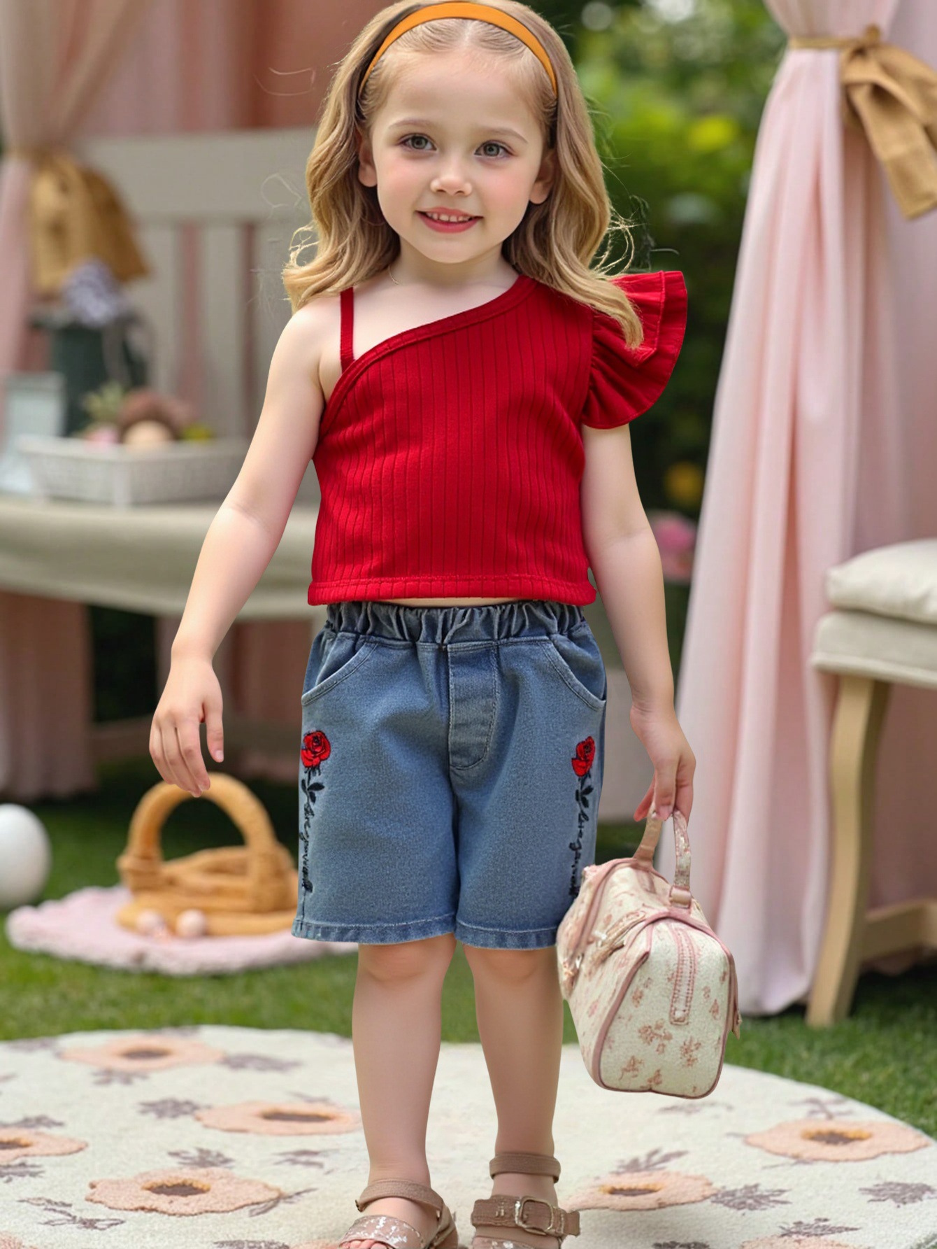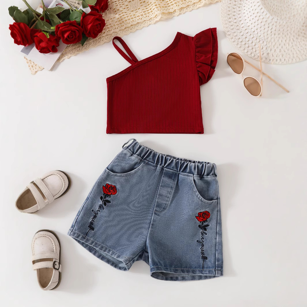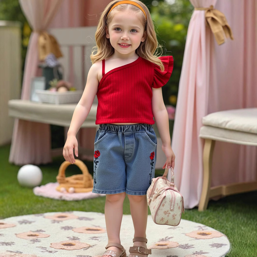 국경 간 대외 무역 아동복 소녀 데님 반바지 여름 새 소녀 핫팬츠 빨간 조끼 데님 반바지 세트스토어 가기