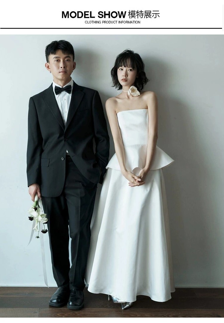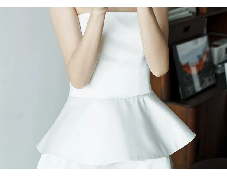 프랑스 스타일 스트랩리스 라이트 웨딩 원피스 우아한 간단한 새틴 신부 면허 등록 작은 흰색 원피스 일일 여행 사진 촬영 참여 원피스