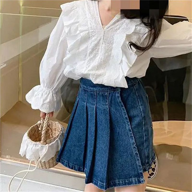 26 여름 여아 데님 스커트 팬츠 한국 스타일 아동 주름 스커트 버튼 다용도 중대형 아동 데님 반바지 핫팬츠