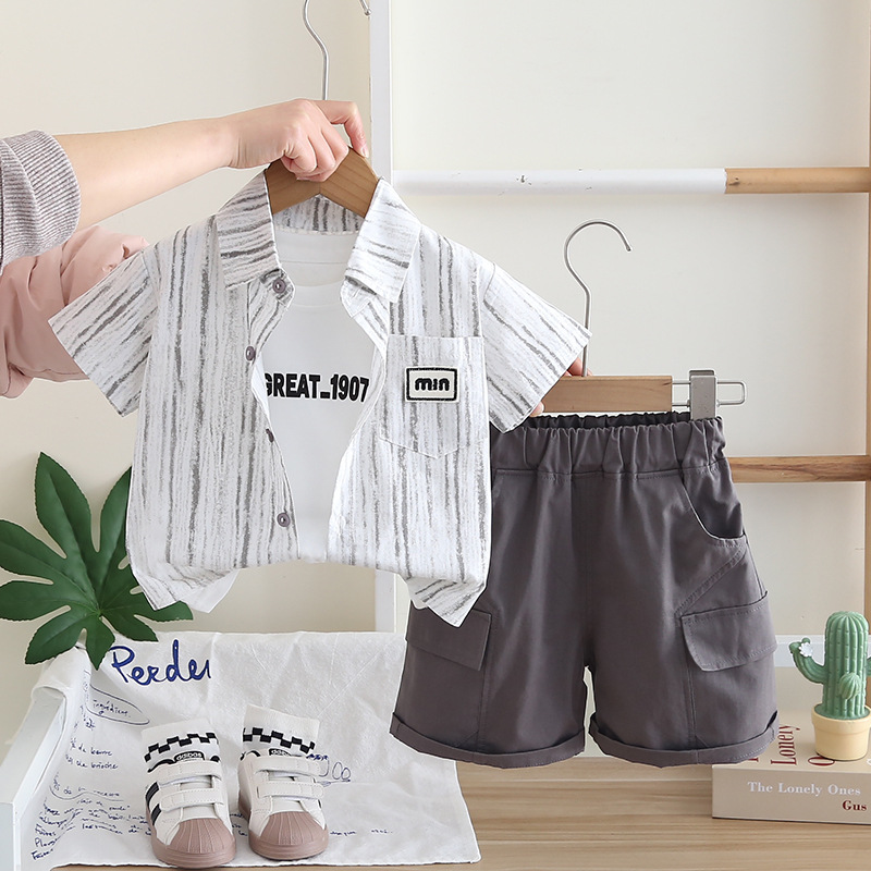 아기 소년 정장 2025 새로운 스타일 소년 여름 옷 한국 스타일 반팔 셔츠 3 피스 세트 도매 배송스토어 가기