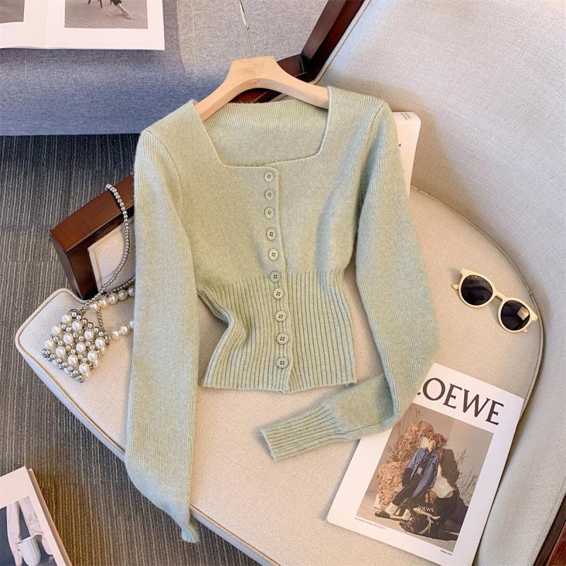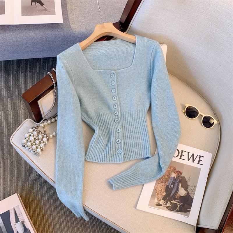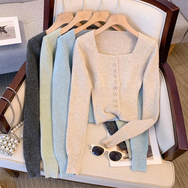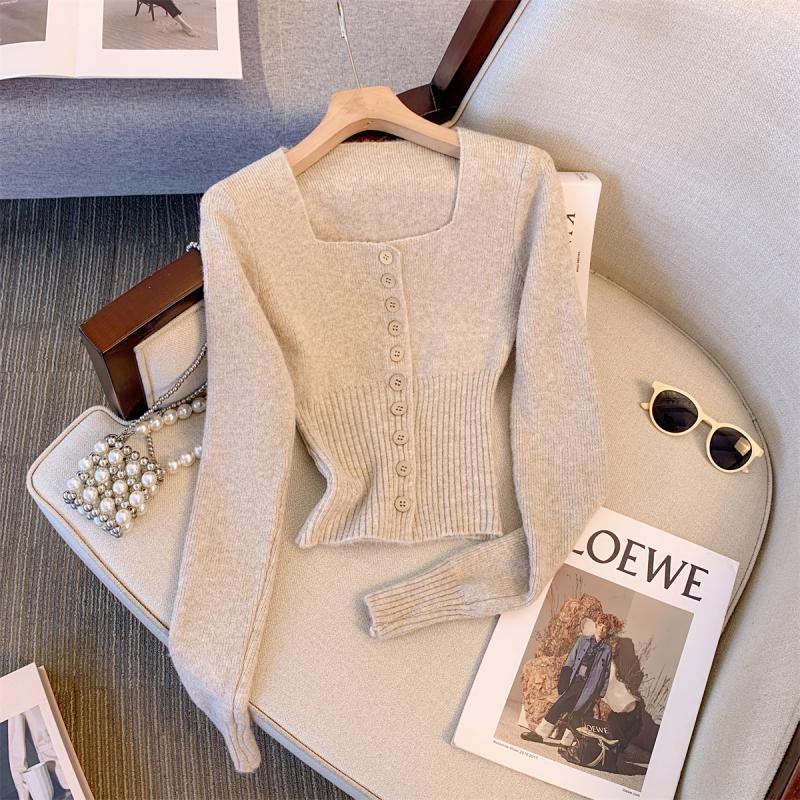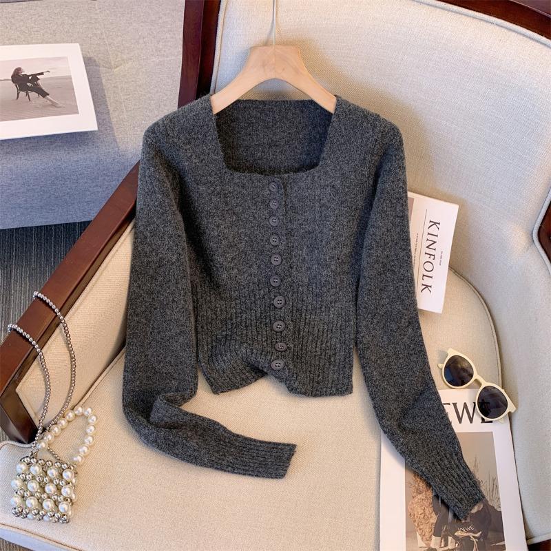 스퀘어 칼라 슬림 핏 긴팔 쇼트 스웨터 여성의 2025 가을 및 겨울 새로운 올 매치 슬림 핏 스웨터 카디건 아우터 탑