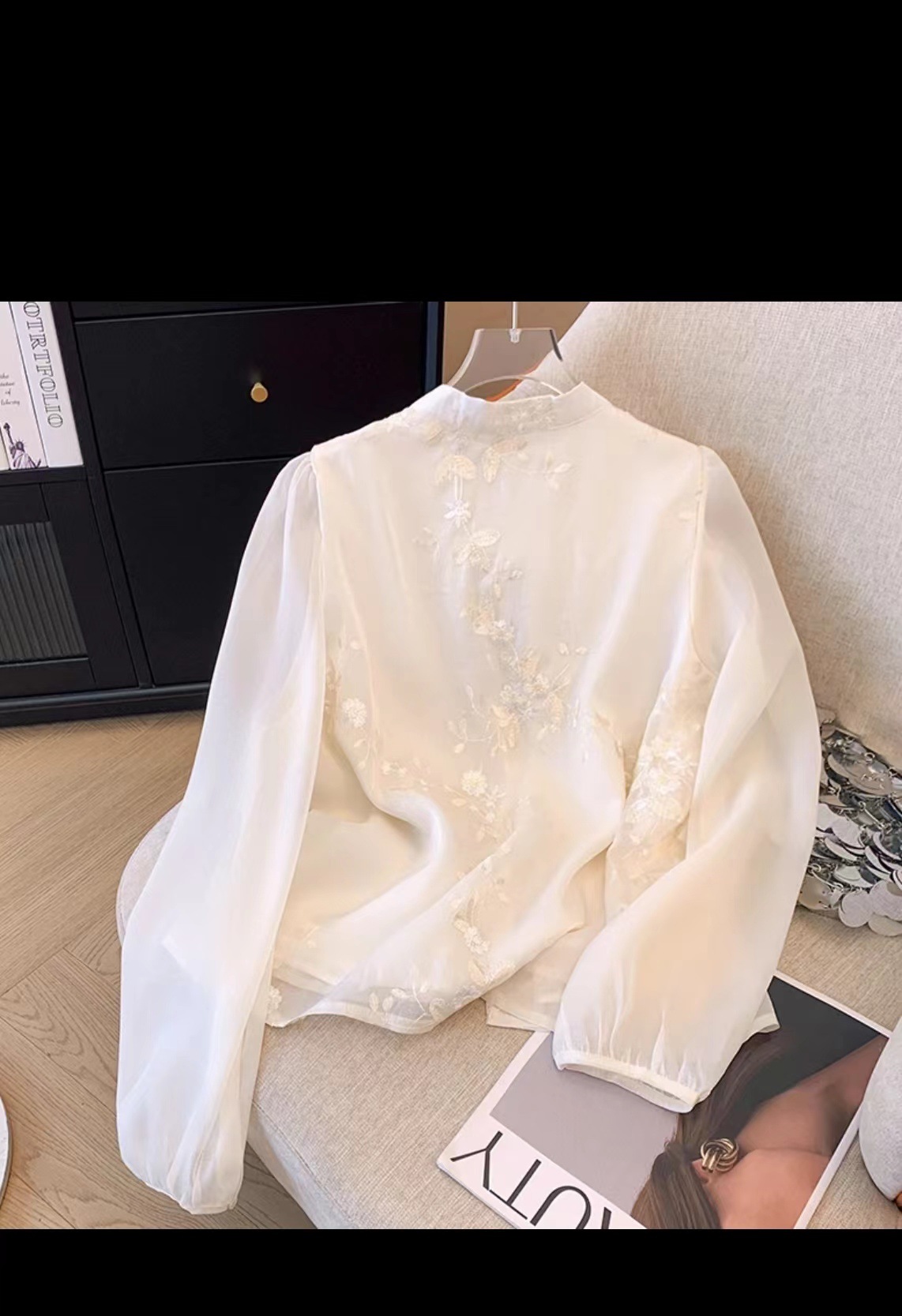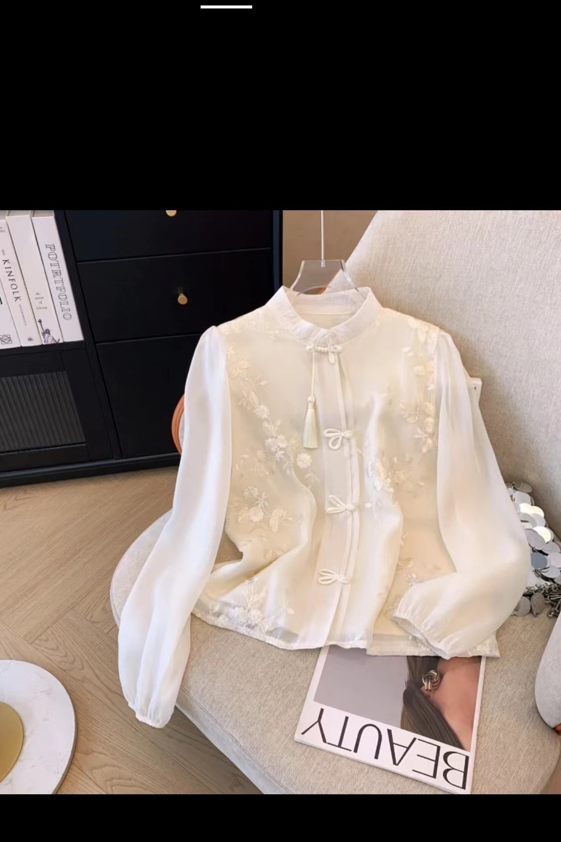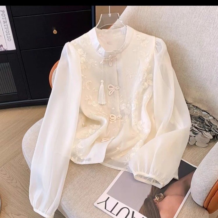 새로운 중국 스타일 2025 Guofeng 자수 버클 술 긴 소매 느슨한 여성용 레트로 쉬폰 셔츠 수직 칼라스토어 가기