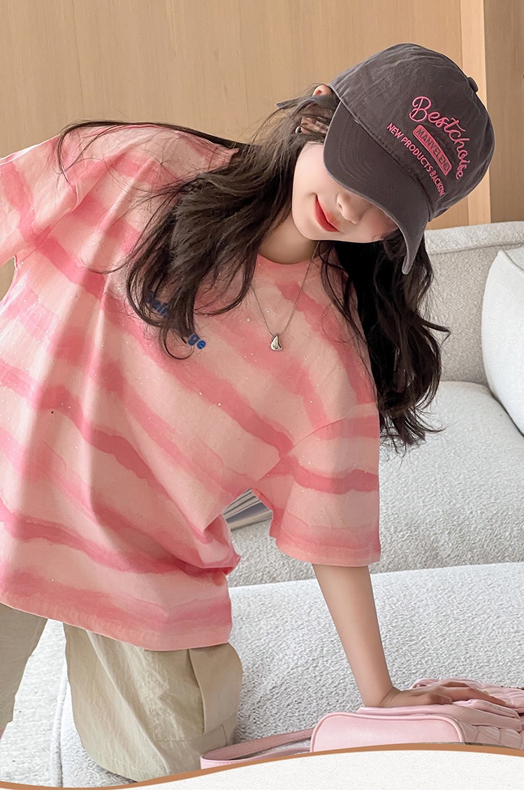걸스 sequin 핫 라인스톤 반팔 티셔츠 2025 여름 새로운 도착 CUHK 어린이 서양식 스포츠 레저 줄무늬 티셔츠