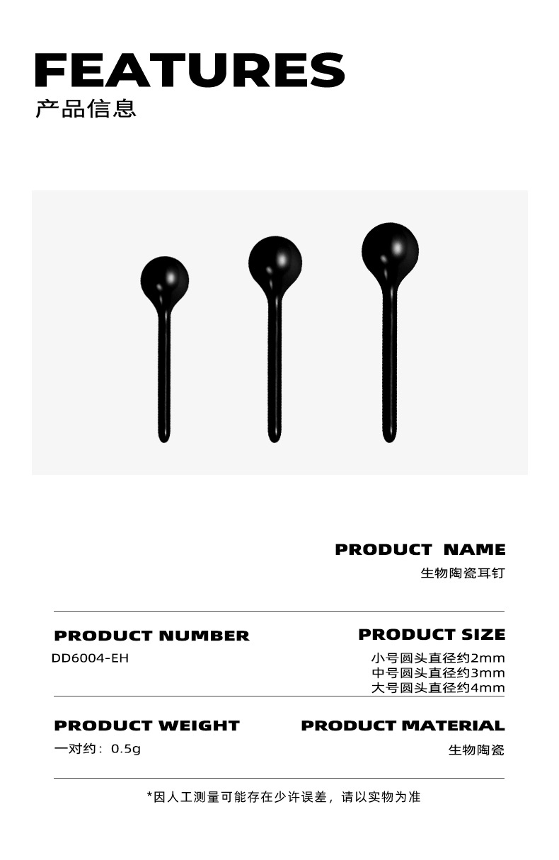 • 3mm 블랙 세라믹 스터드 이어링