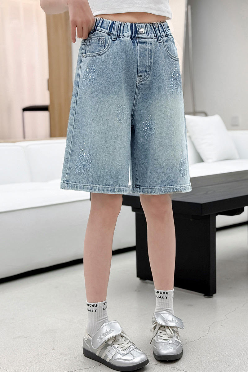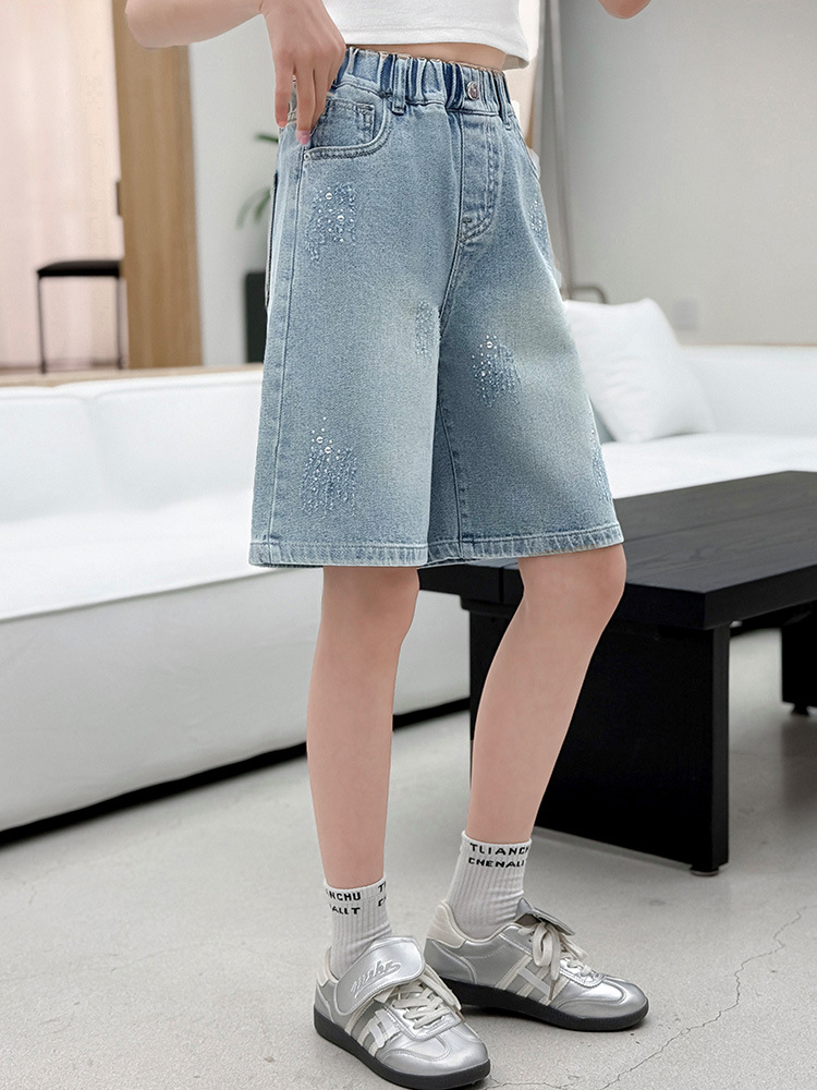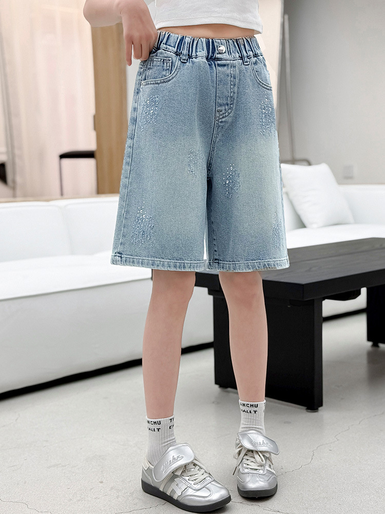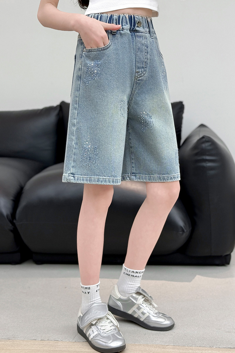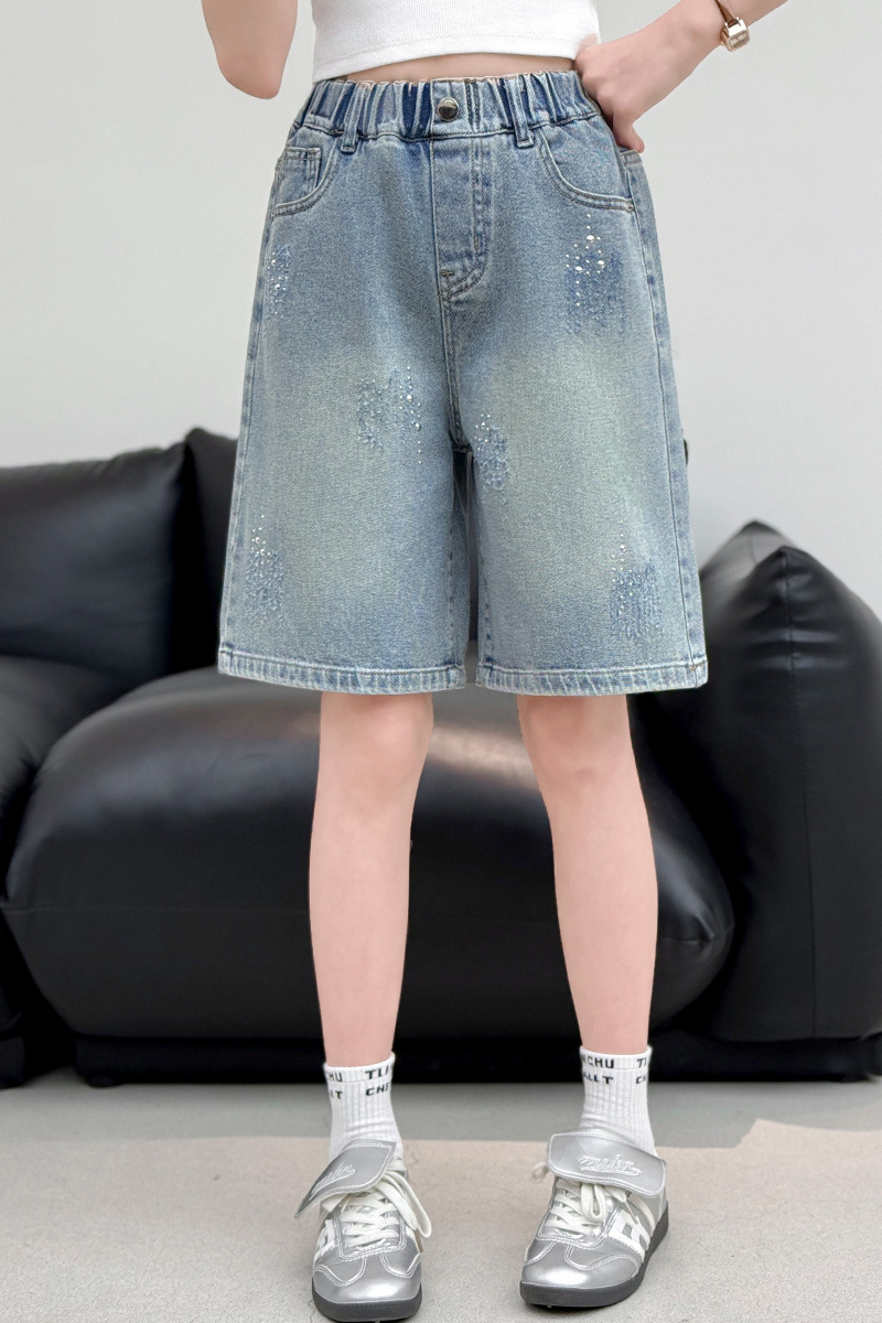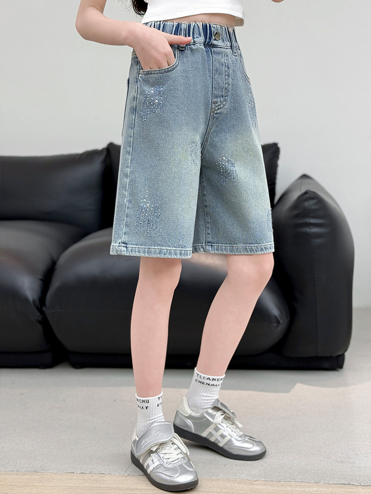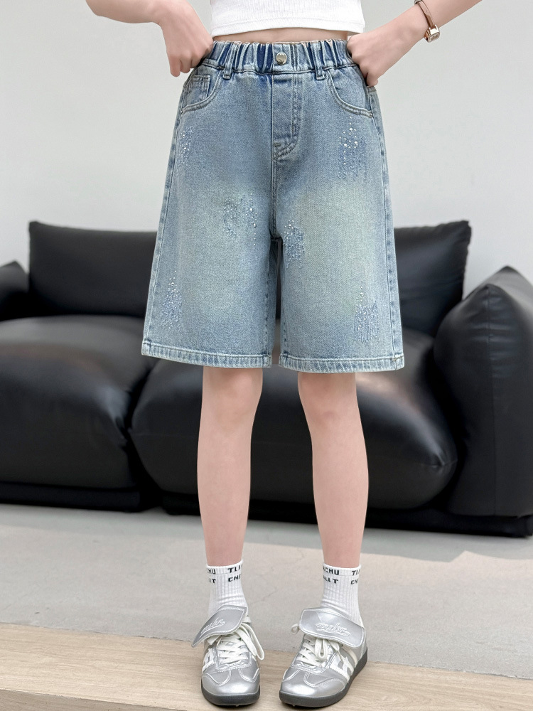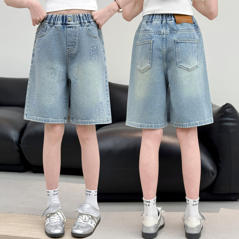 크로스보더 여아 여름 스타일 핸드메이드 다이아몬드 장식 데님 6부 바지 2026년 신상 한국 스타일 캐주얼 중대형 아동 패션 반바지스토어 가기