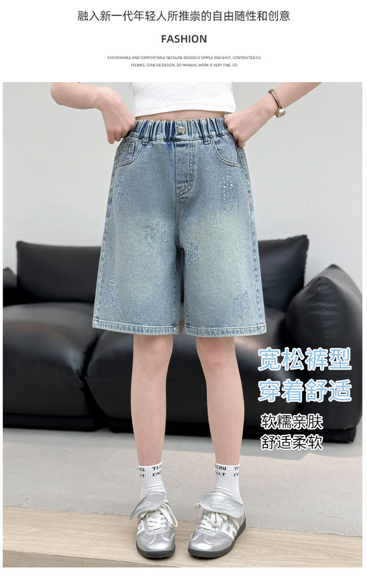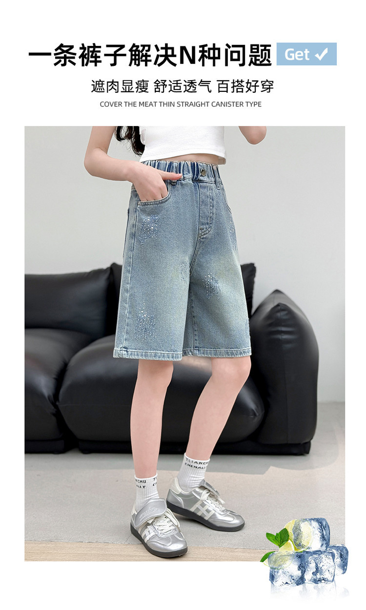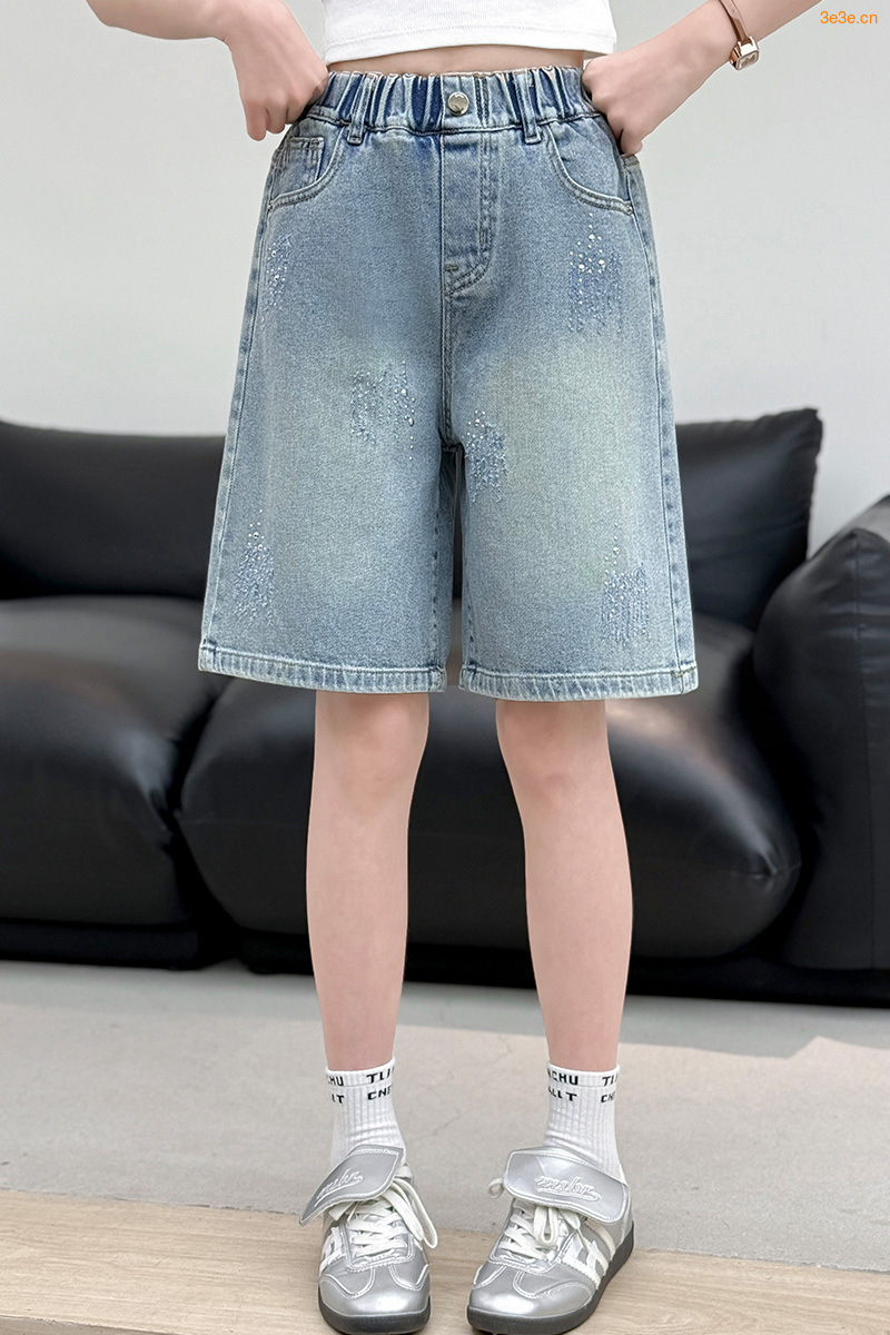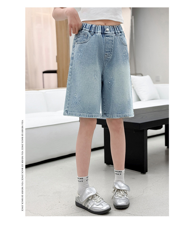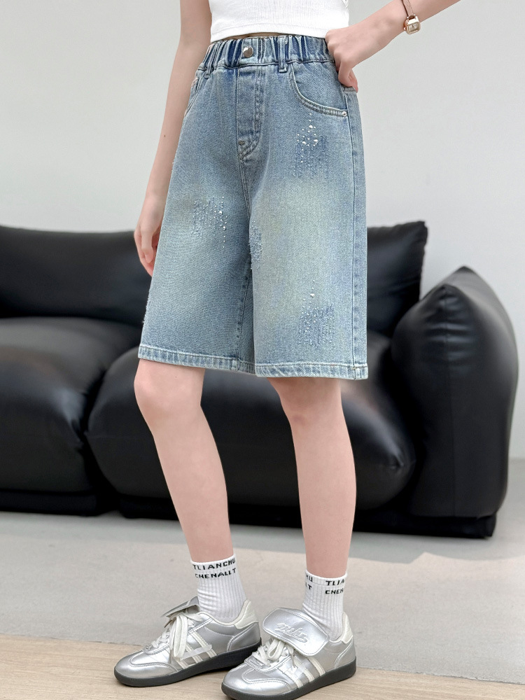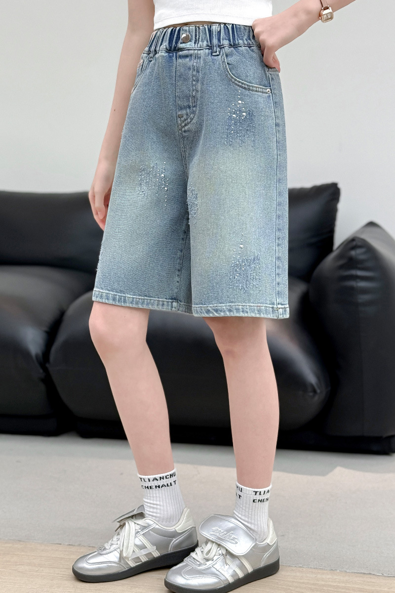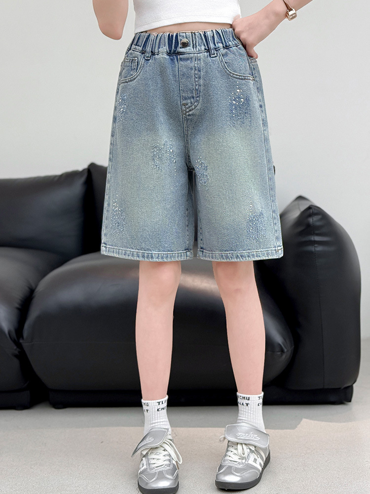 크로스보더 여아 여름 스타일 핸드메이드 다이아몬드 장식 데님 6부 바지 2026년 신상 한국 스타일 캐주얼 중대형 아동 패션 반바지스토어 가기