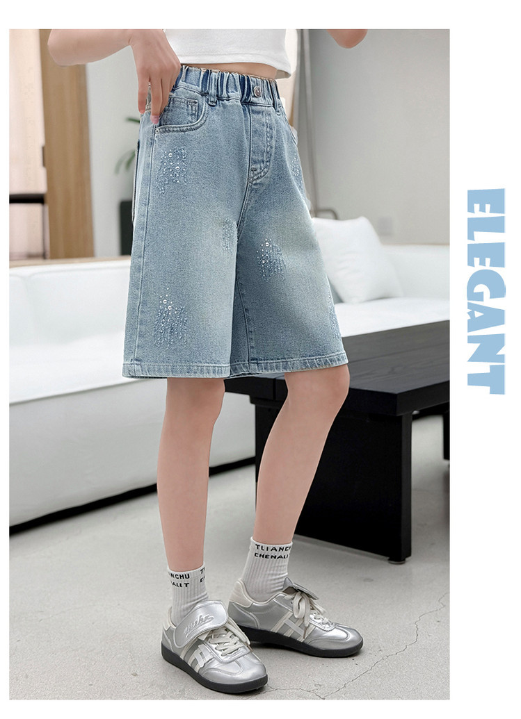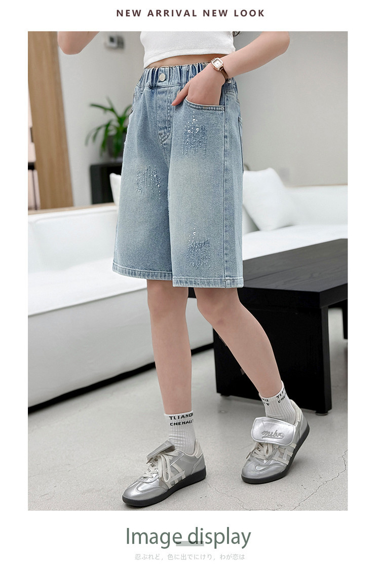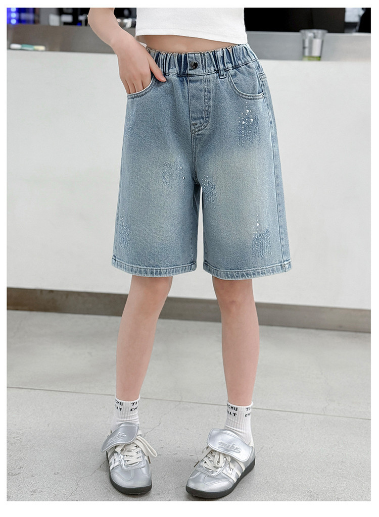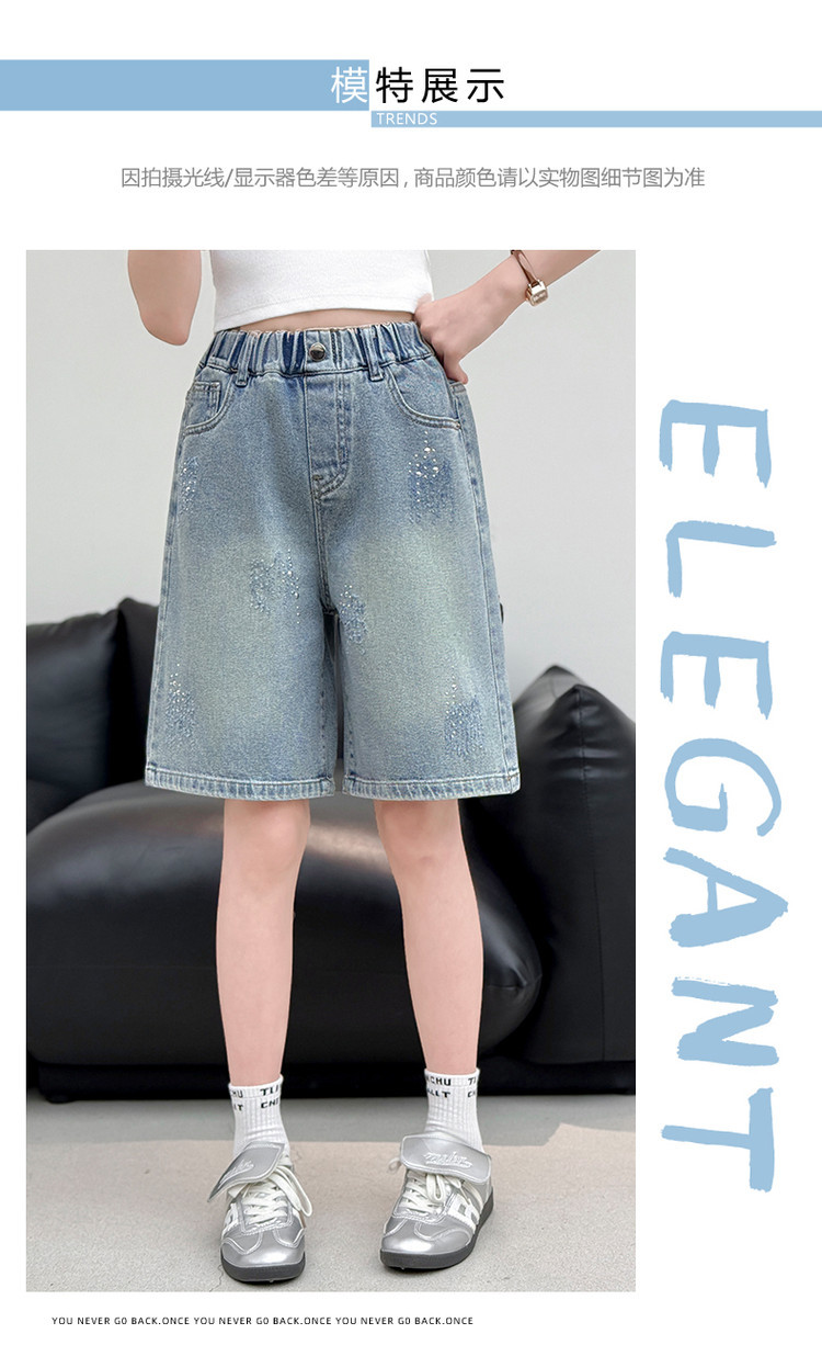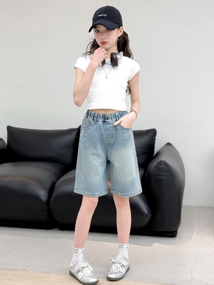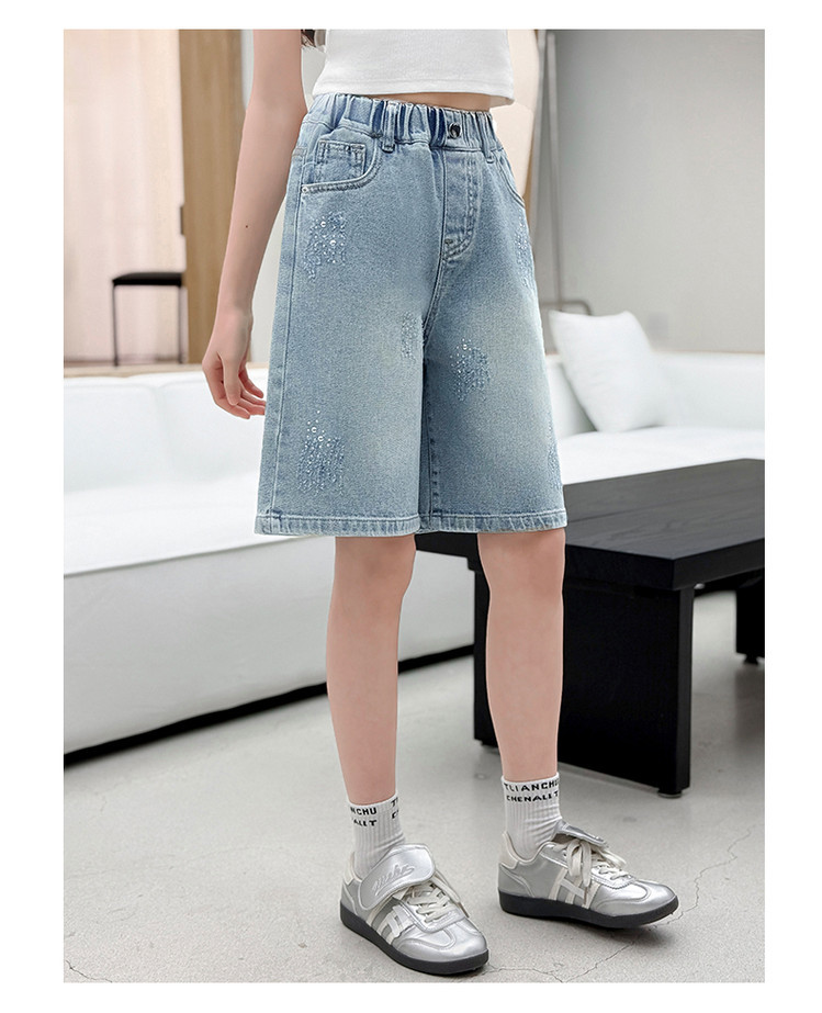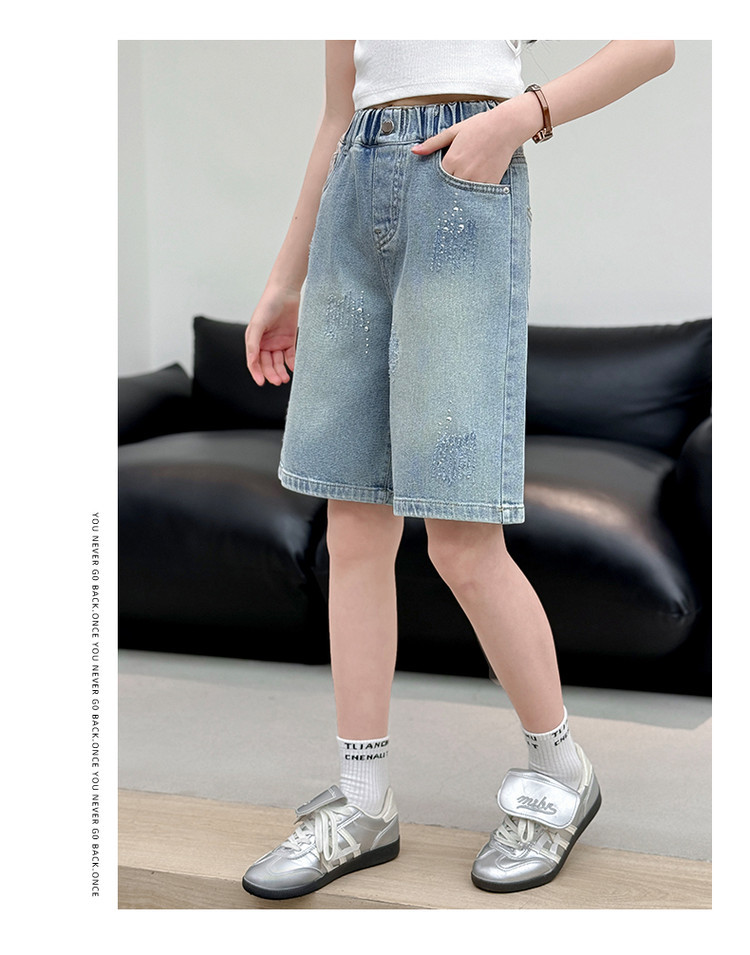 크로스보더 여아 여름 스타일 핸드메이드 다이아몬드 장식 데님 6부 바지 2026년 신상 한국 스타일 캐주얼 중대형 아동 패션 반바지스토어 가기