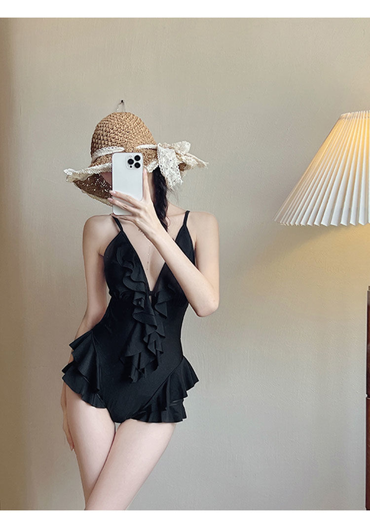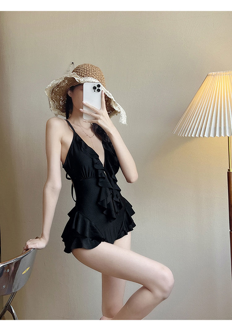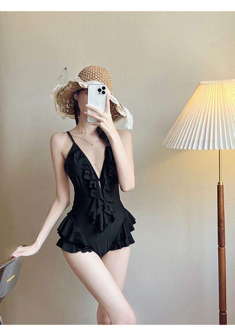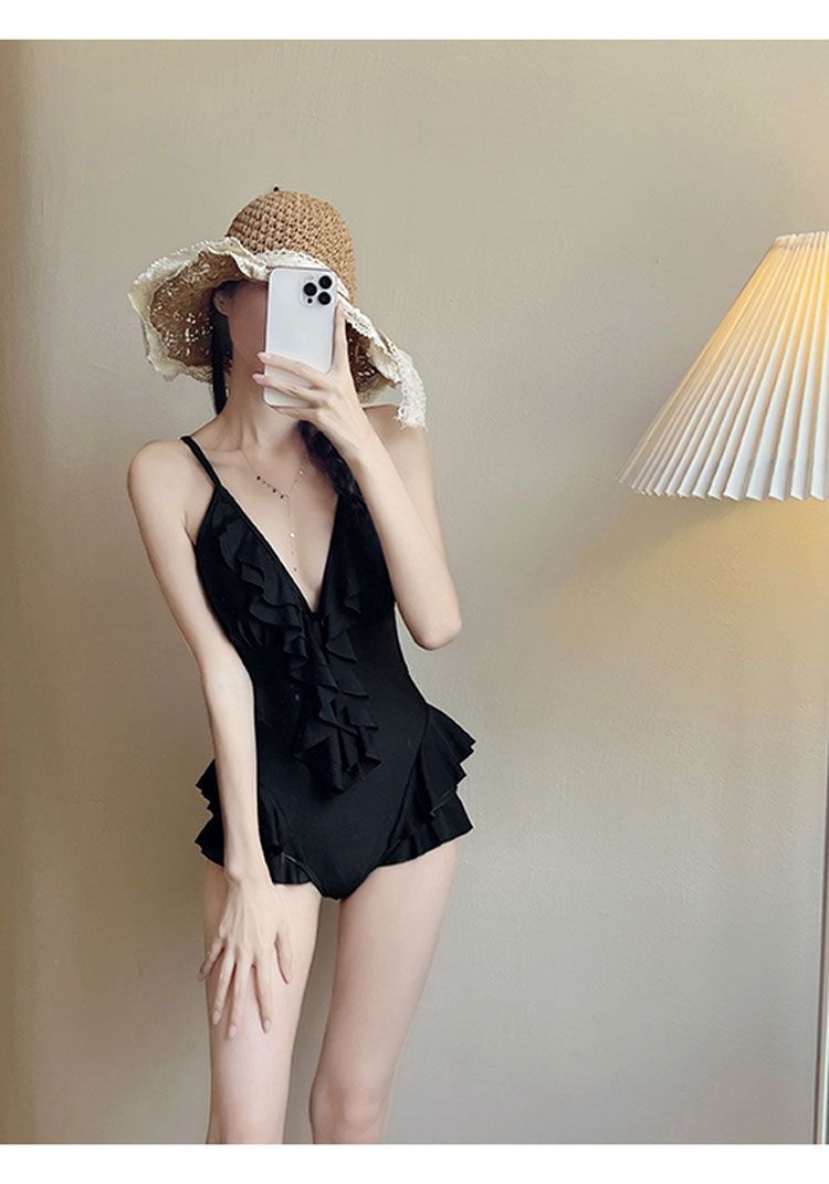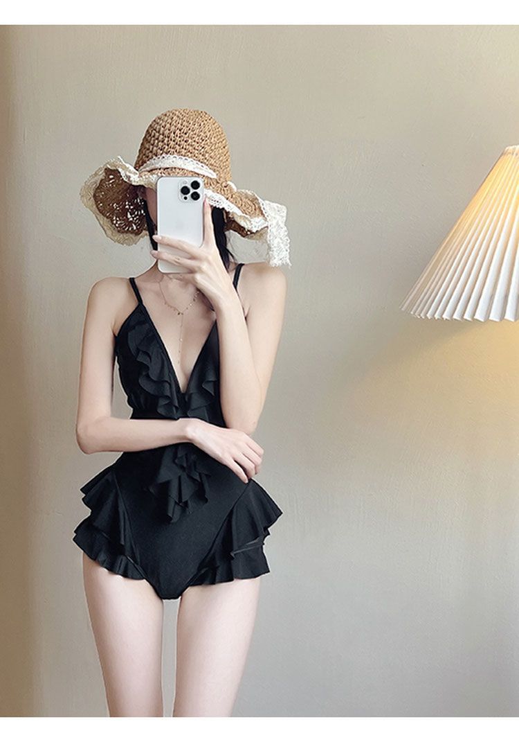 Mulan Ruffled 솔리드 컬러 v 넥 온천 수영복 여성 섹시 원피스 슬리밍 푸시 업 2023 New Korean Ins
