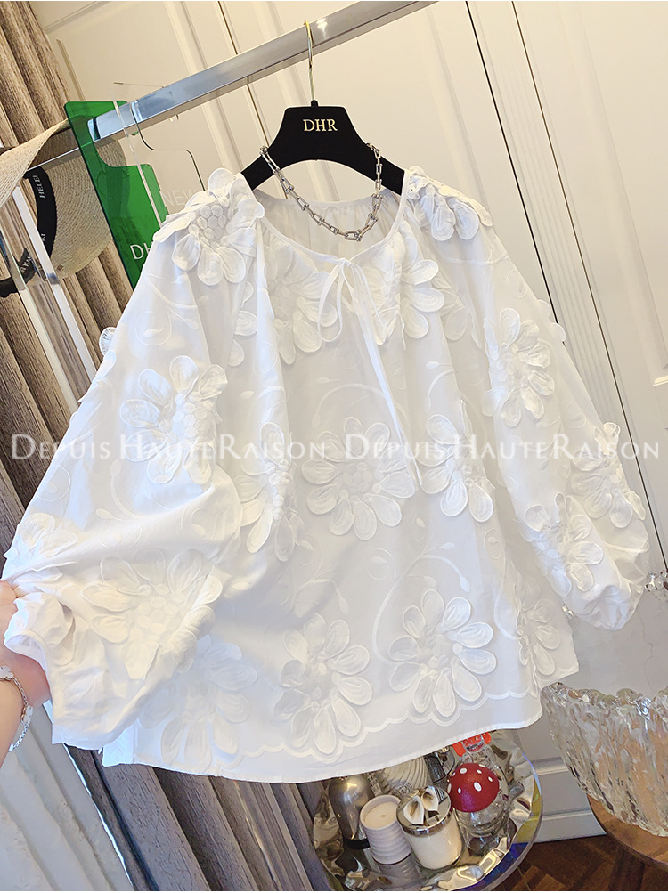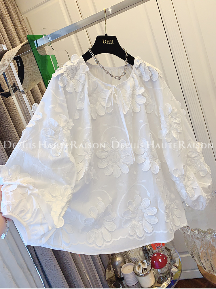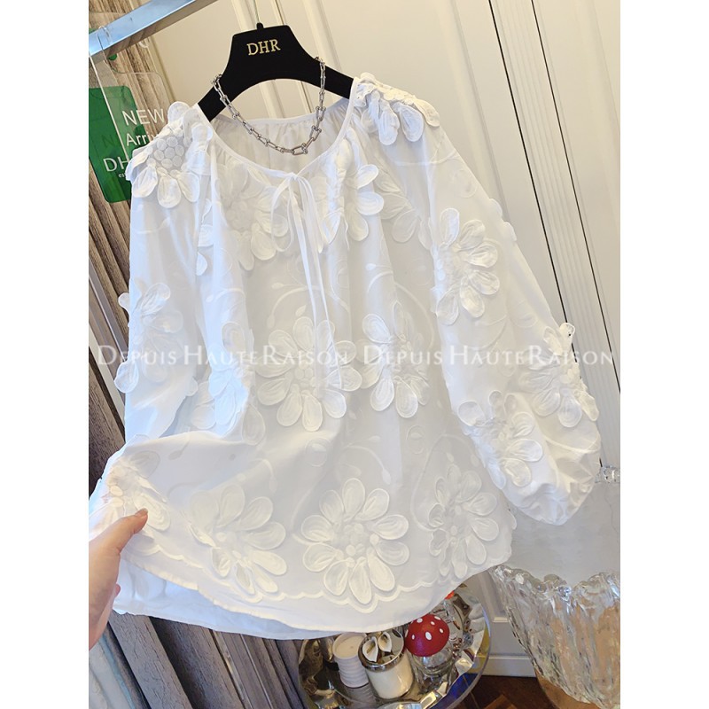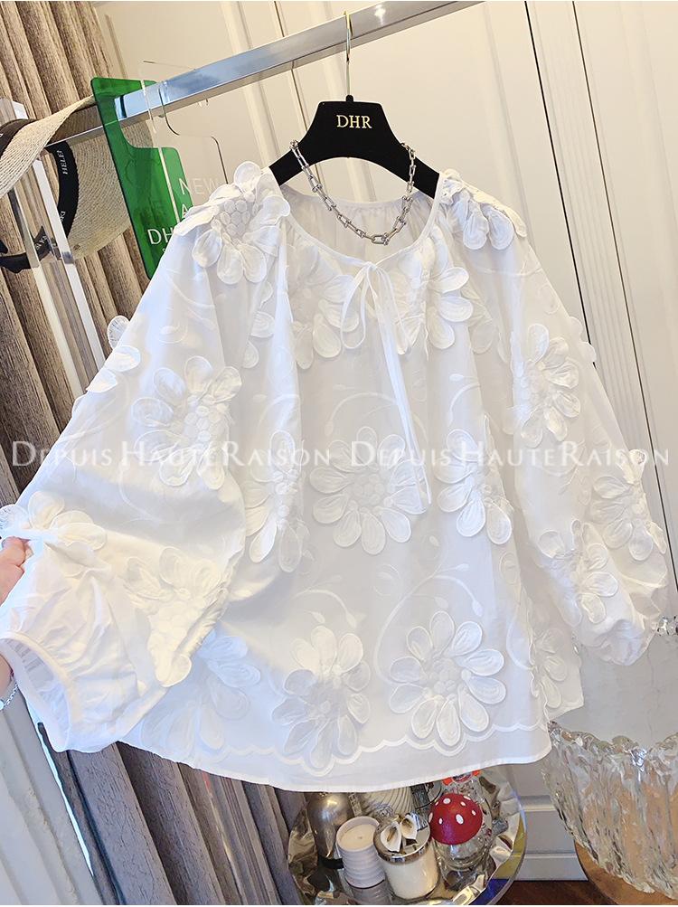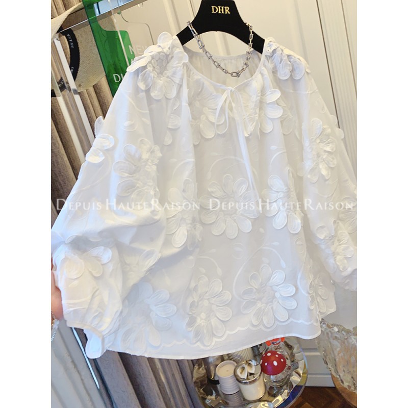DHR 프리미엄 센스 슈퍼 잘 생긴 프랑스 자수 레이스 플라워 화이트 인형 셔츠 루즈 코튼 탑 여성 의류