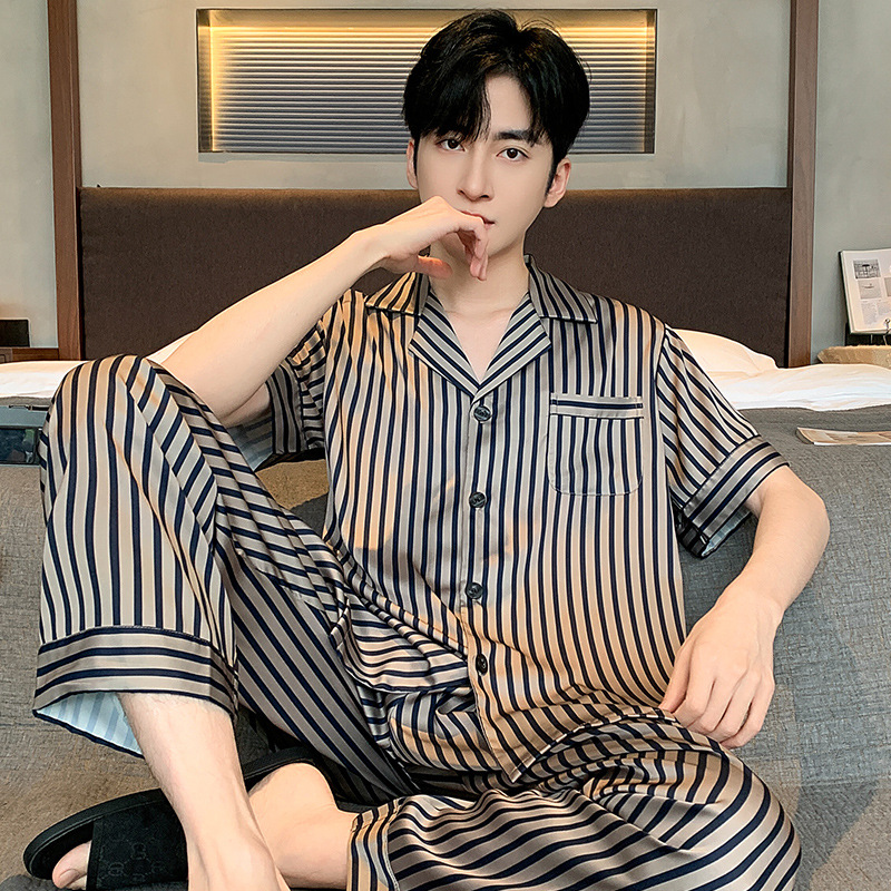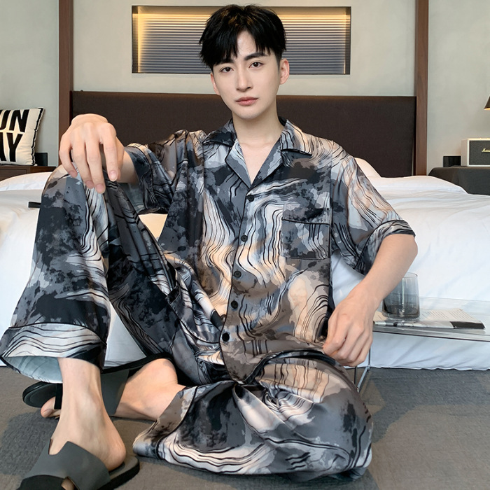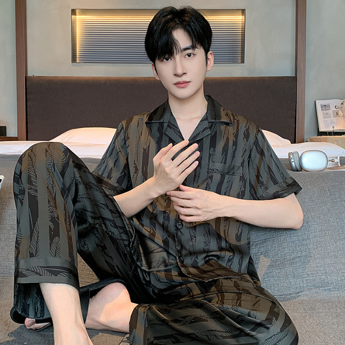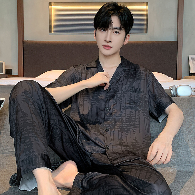 남성용 새로운 동남 아시아 얇은 모조 실크 아이스 실크 잠옷 자카드 가디건 반팔 바지 플러스 사이즈 홈웨어