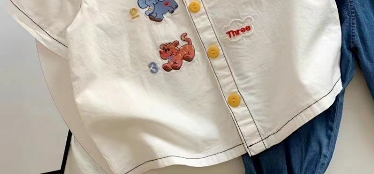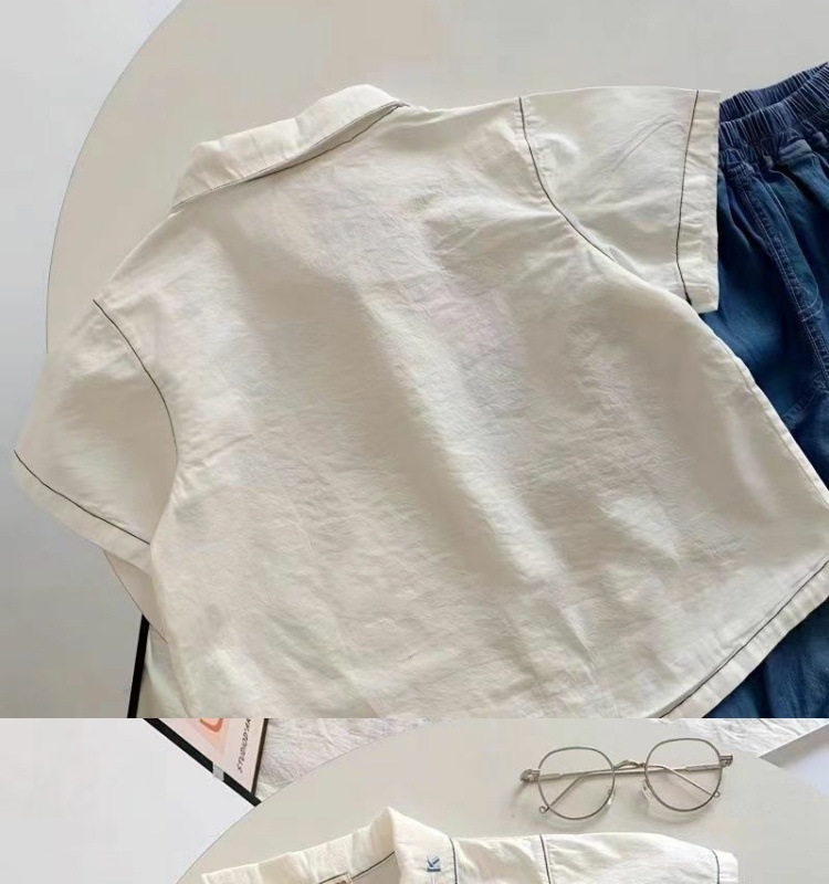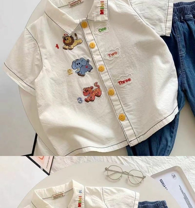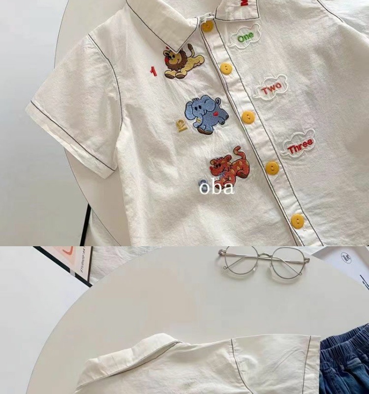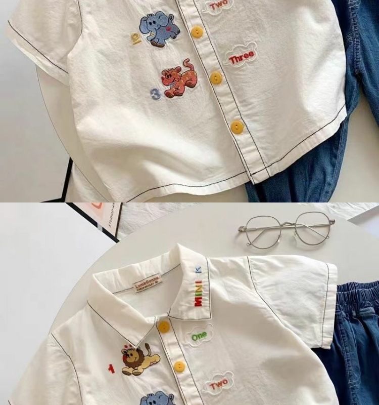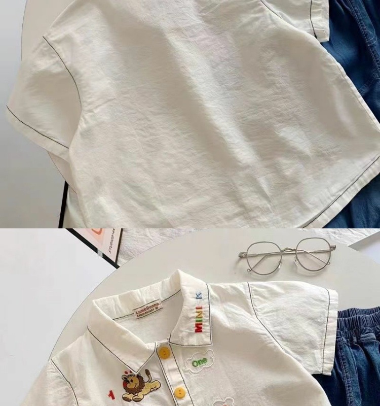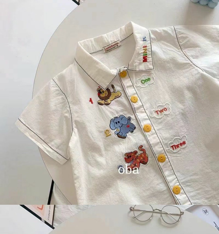 너무 귀여운 셔츠 ~ 남아 일본 여름 만화 자수 흰색 셔츠 아동용 베이비 라펠 탑