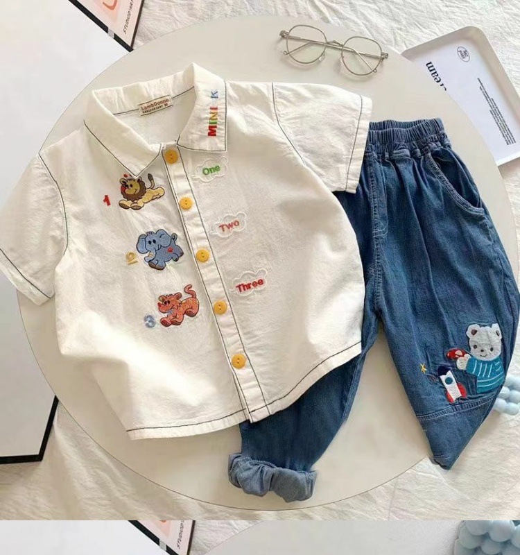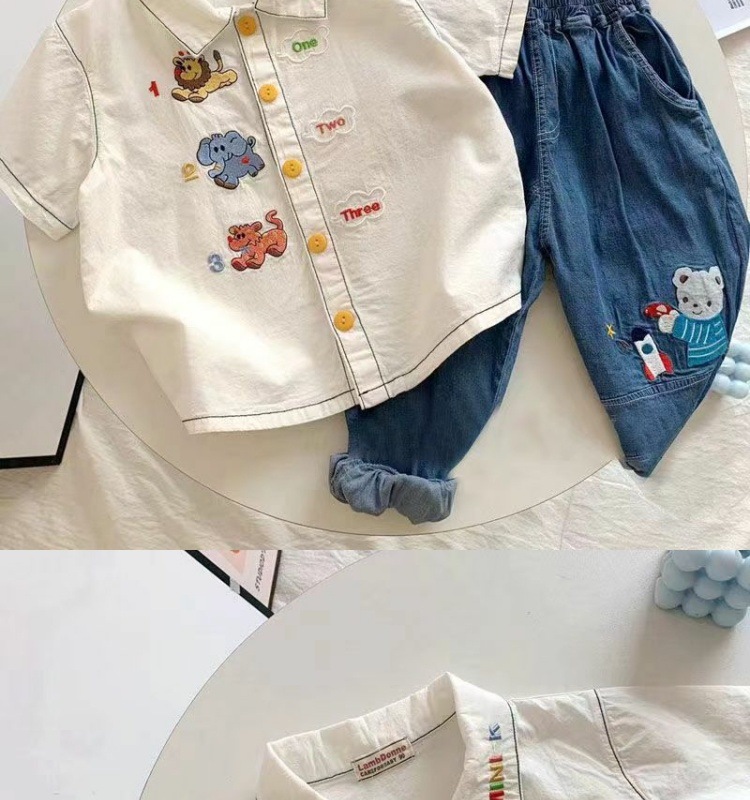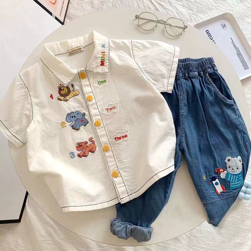 너무 귀여운 셔츠 ~ 남아 일본 여름 만화 자수 흰색 셔츠 아동용 베이비 라펠 탑스토어 가기