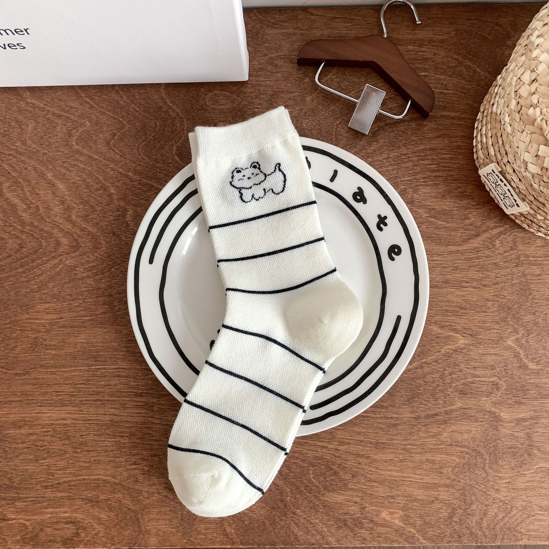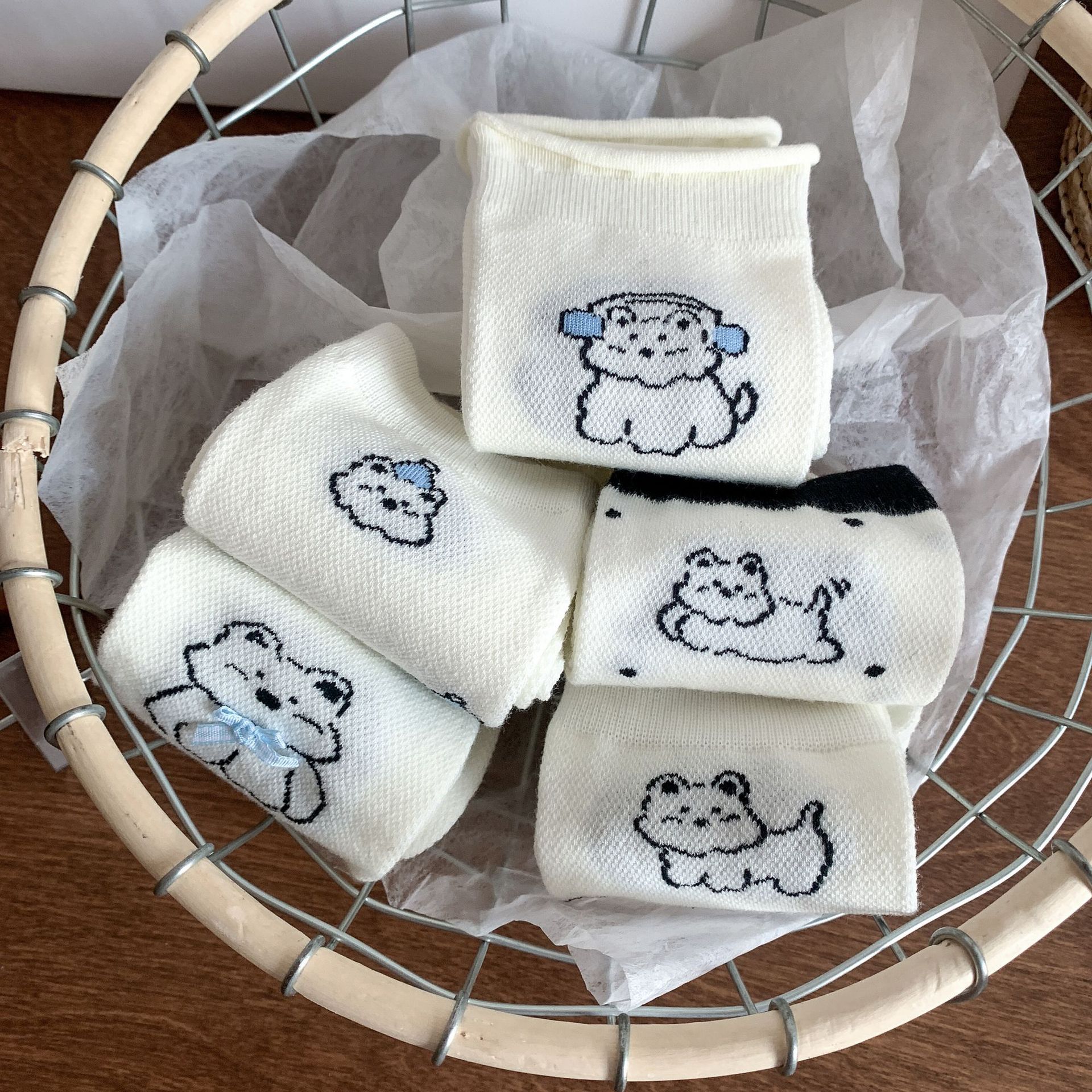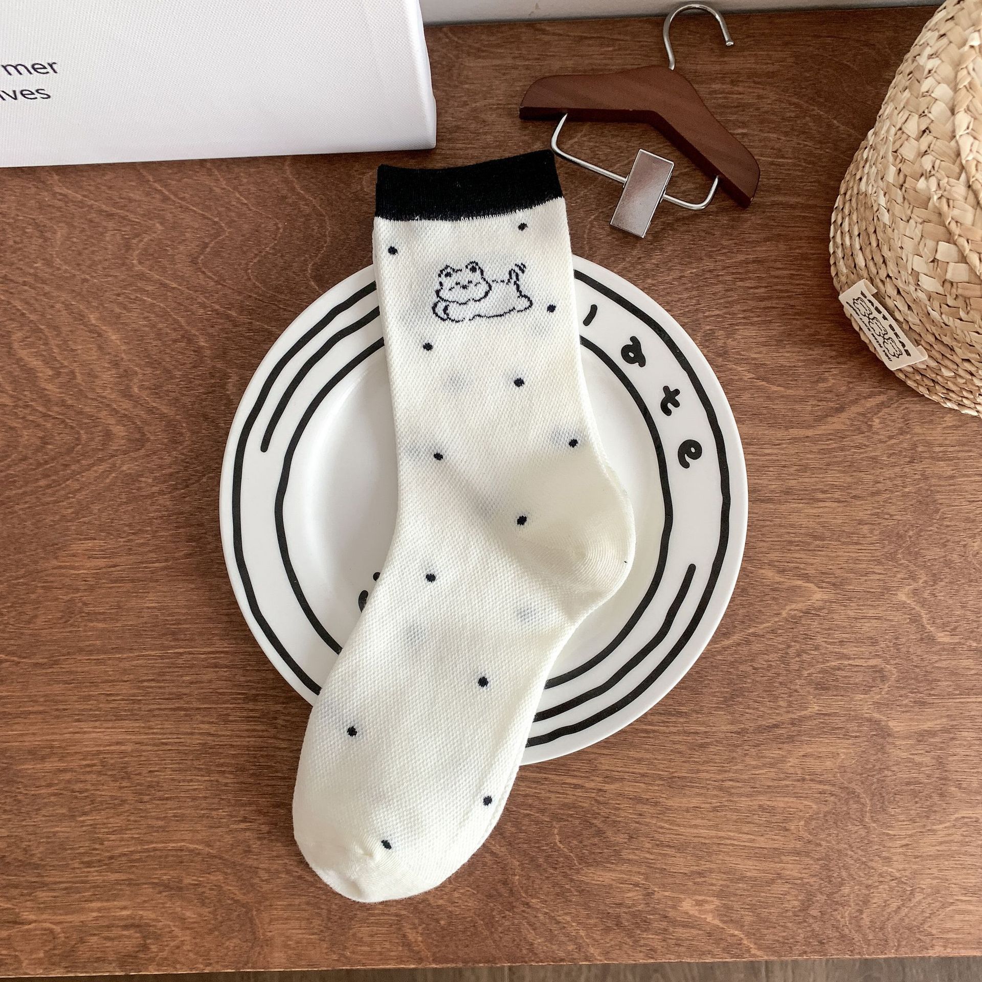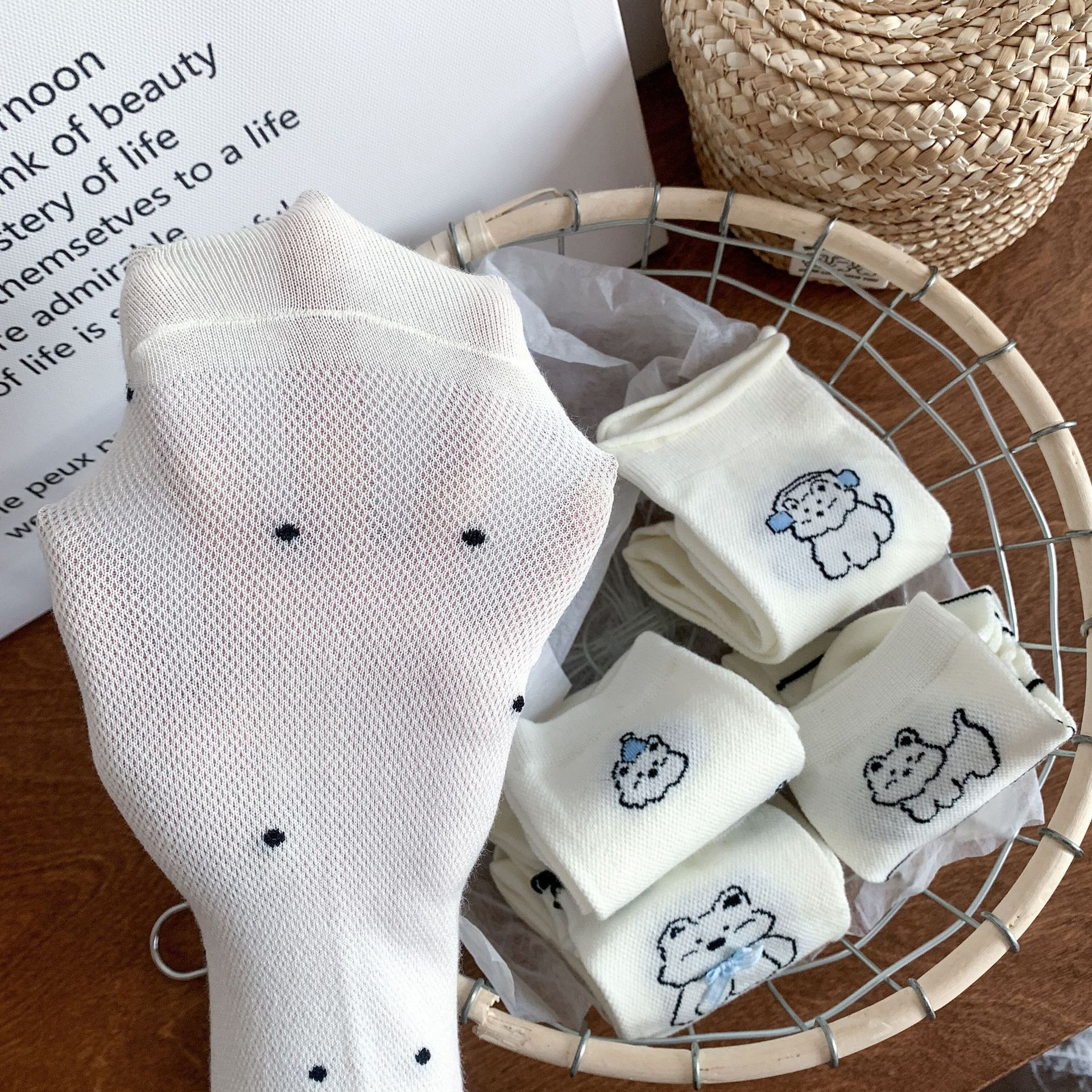 양말 여성 메쉬 개 일본 스타일 컬 중간 튜브 땀 흡수 통기성 간단한 귀여운 줄무늬 웨이브 도트 화이트 미드 튜브 양말스토어 가기