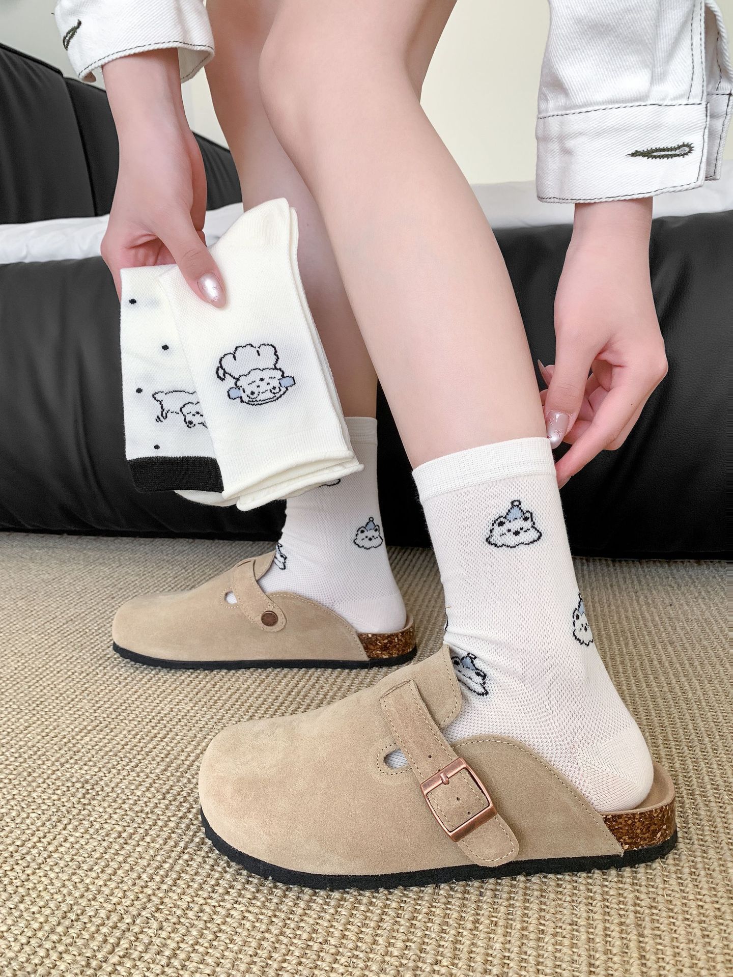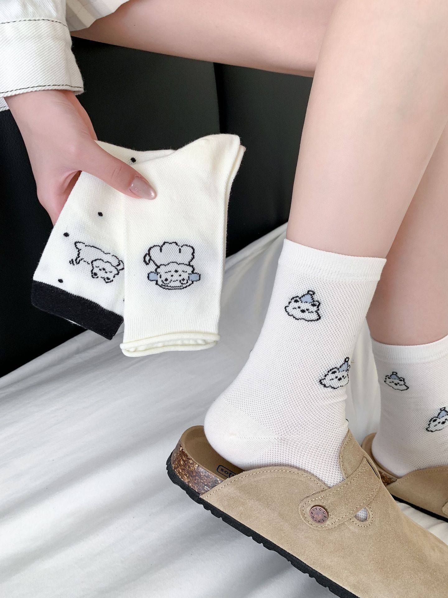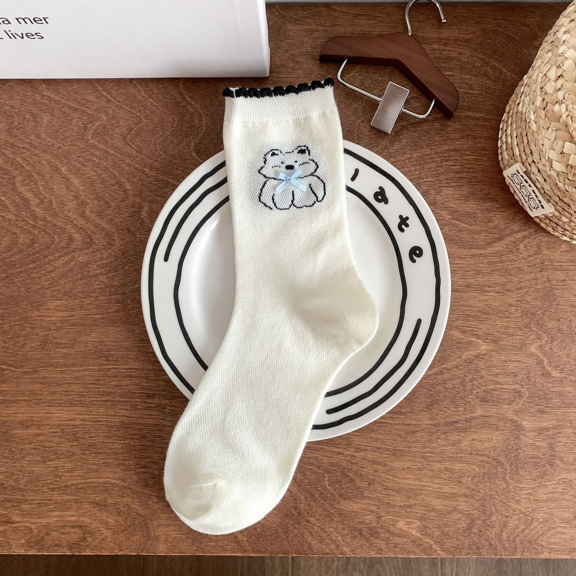 양말 여성 메쉬 개 일본 스타일 컬 중간 튜브 땀 흡수 통기성 간단한 귀여운 줄무늬 웨이브 도트 화이트 미드 튜브 양말