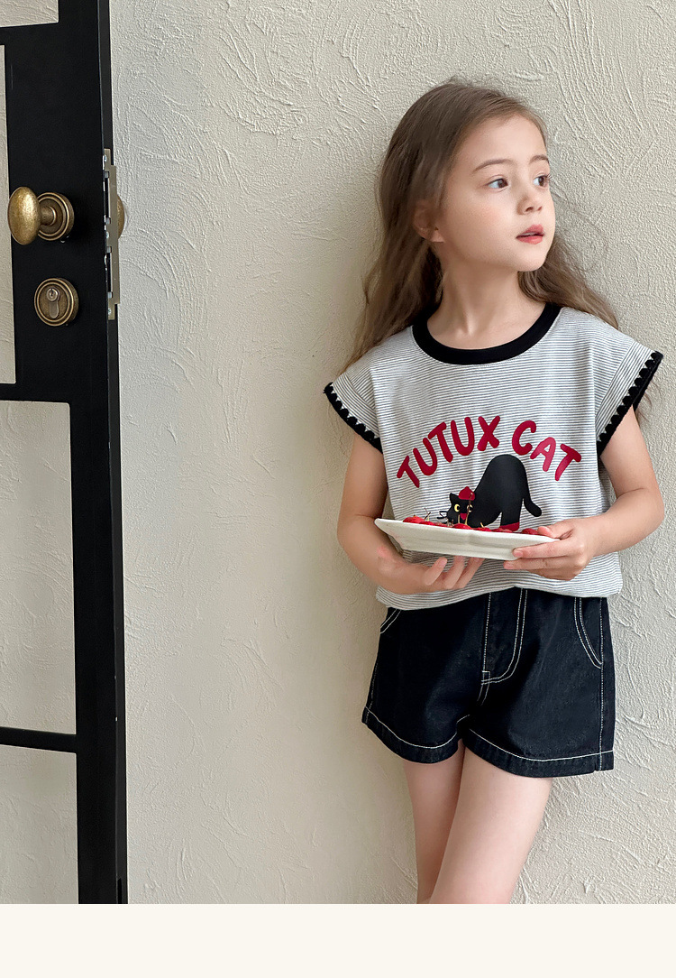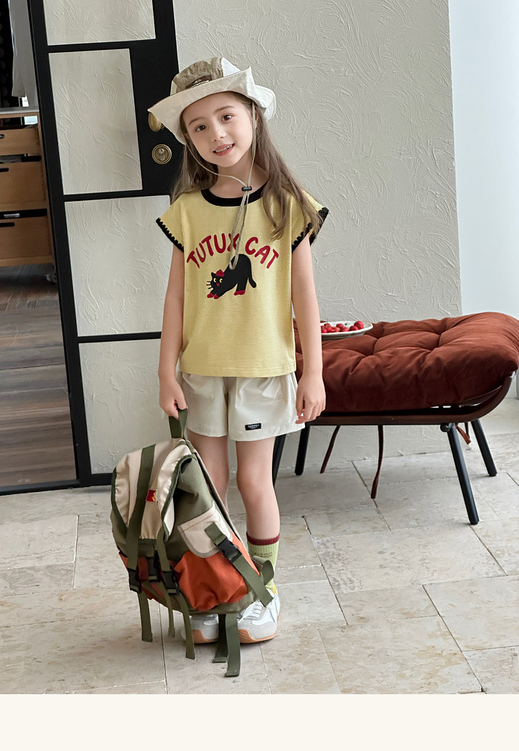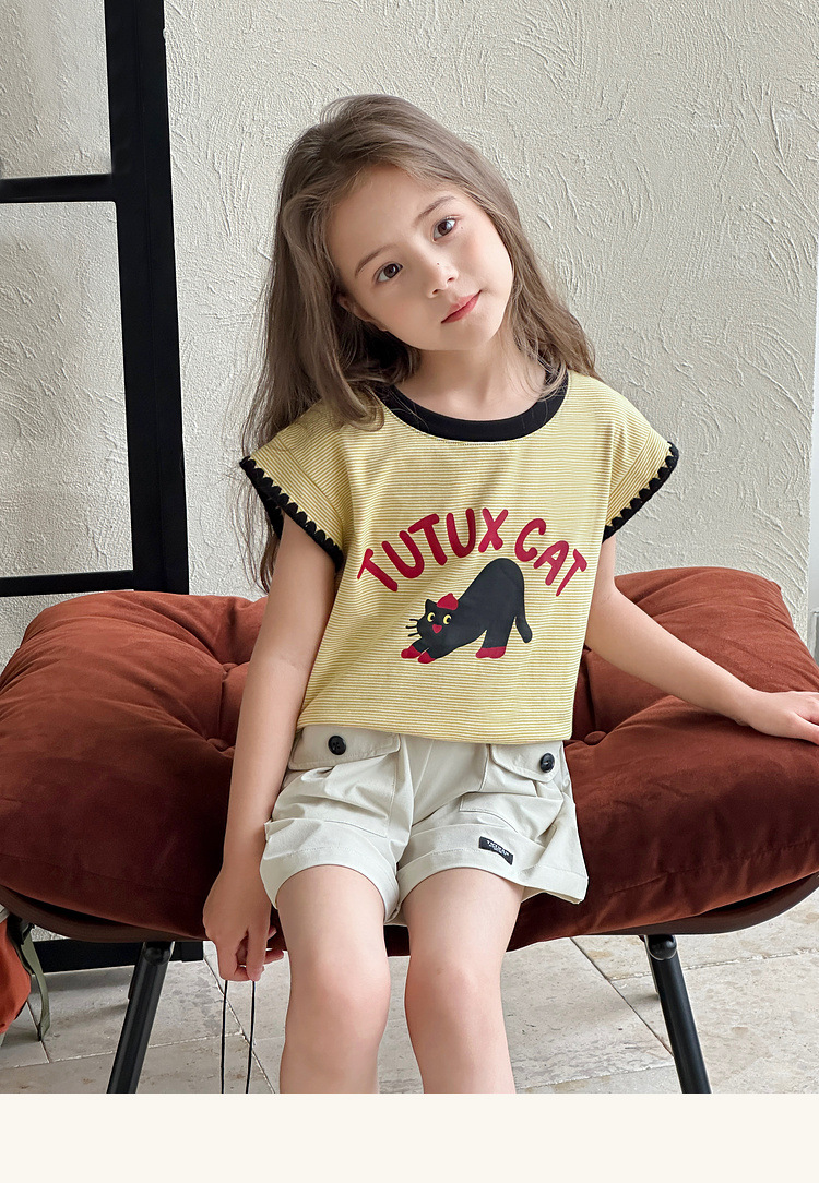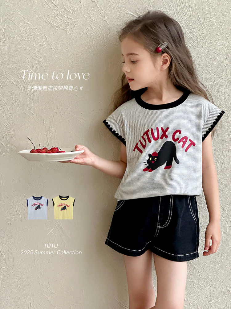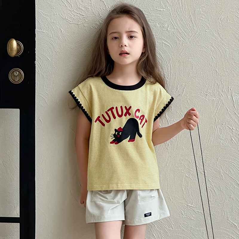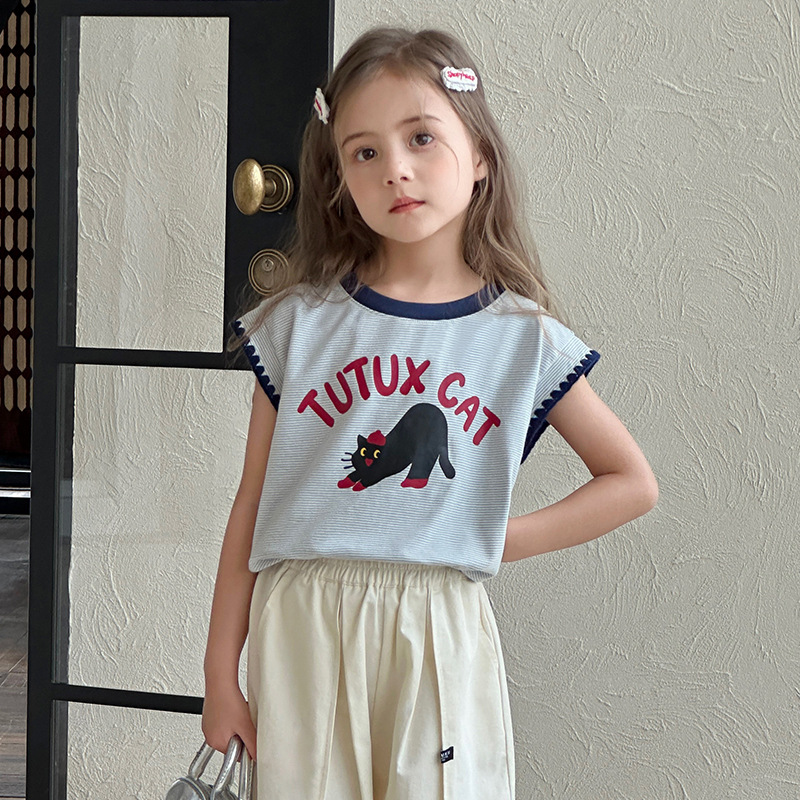 투투 코끼리 소녀의 티셔츠 2025 여름 새로운 어린이 비행 슬리브 스트라이프 조끼 캐주얼 짧은 소매 어린이 탑스토어 가기