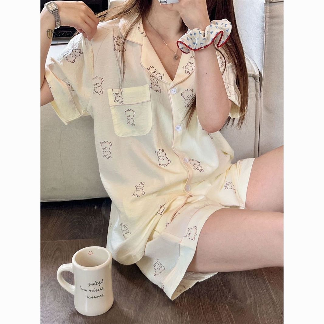 잠옷 여성의 여름 얇은 일본 스타일 만화 인쇄 구름면 반팔 반바지 홈 의류 세트 TikTok