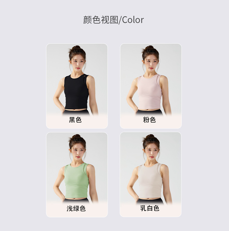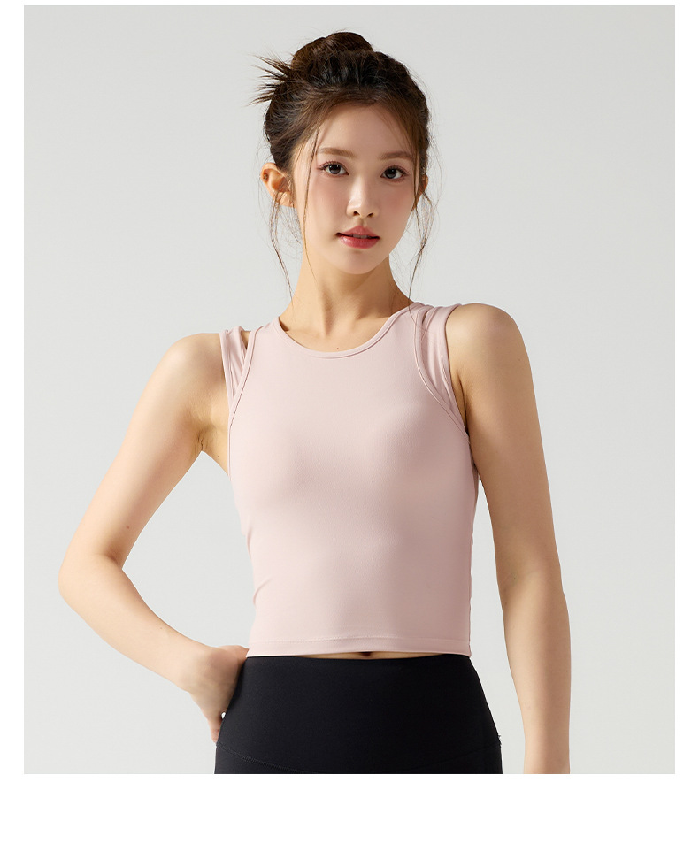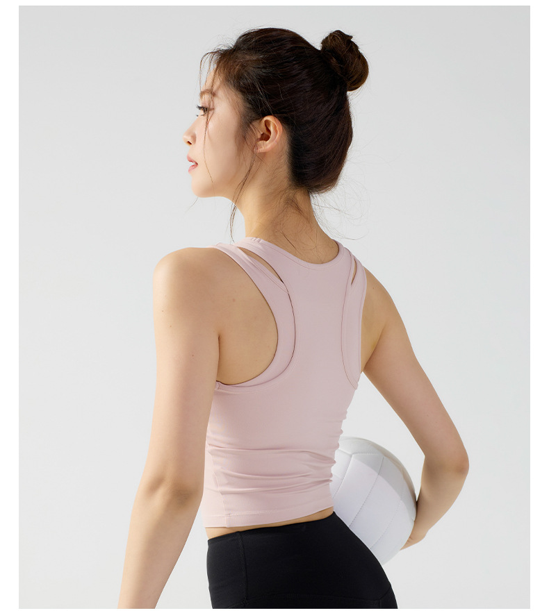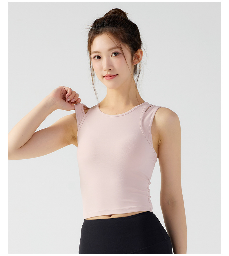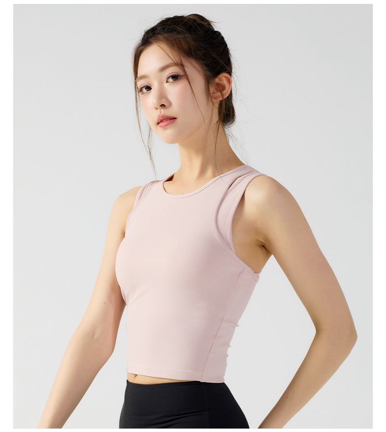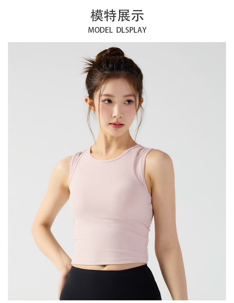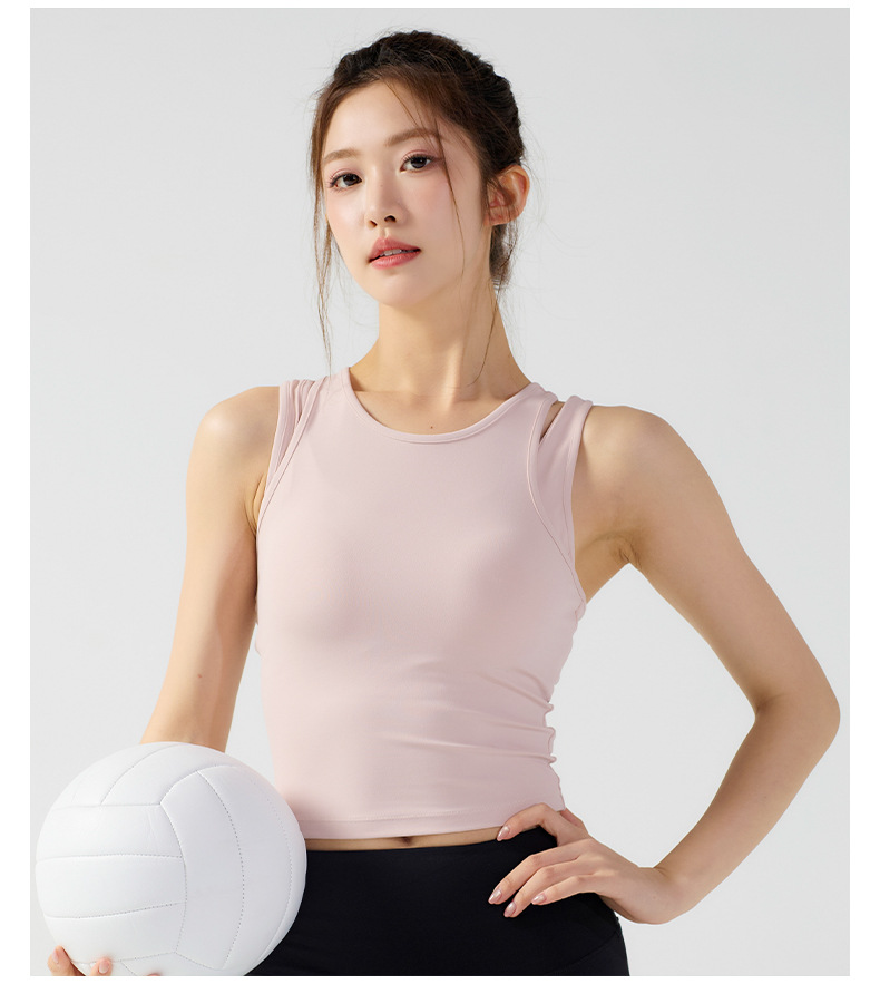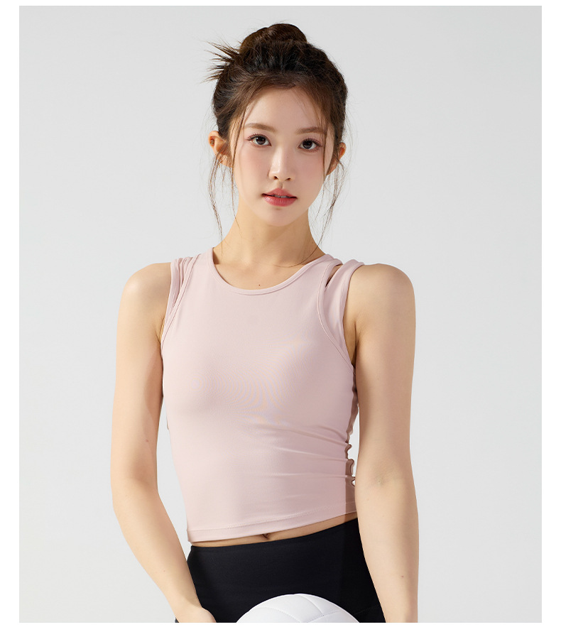 피부 친화적인 속건성 페이크 투피스 여성용 스포츠 탑, 푸쉬업 충격 방지 가슴 패드 포함 요가복, 통기성 피트니스 조끼스토어 가기