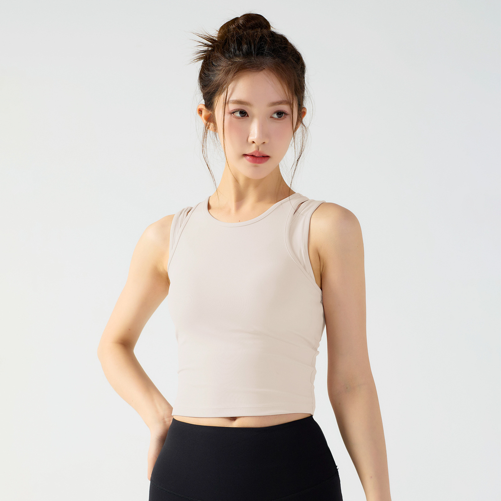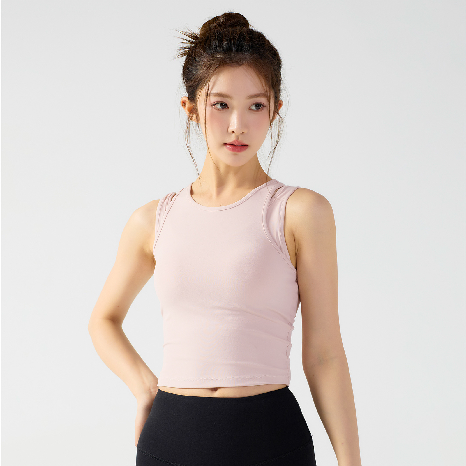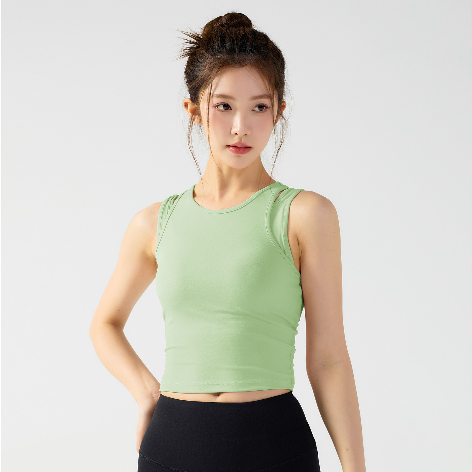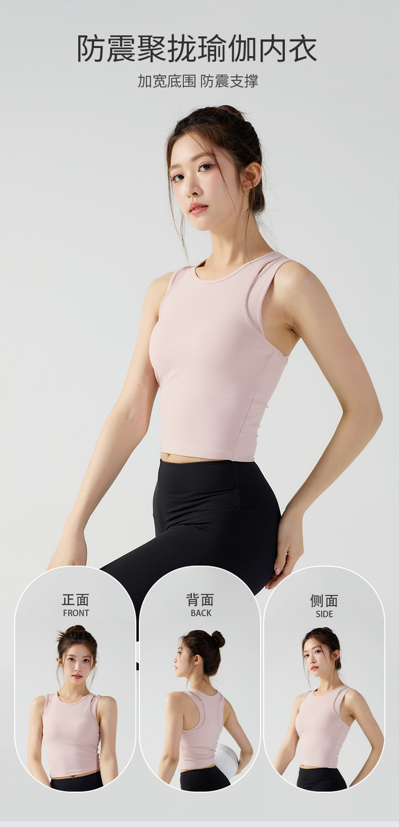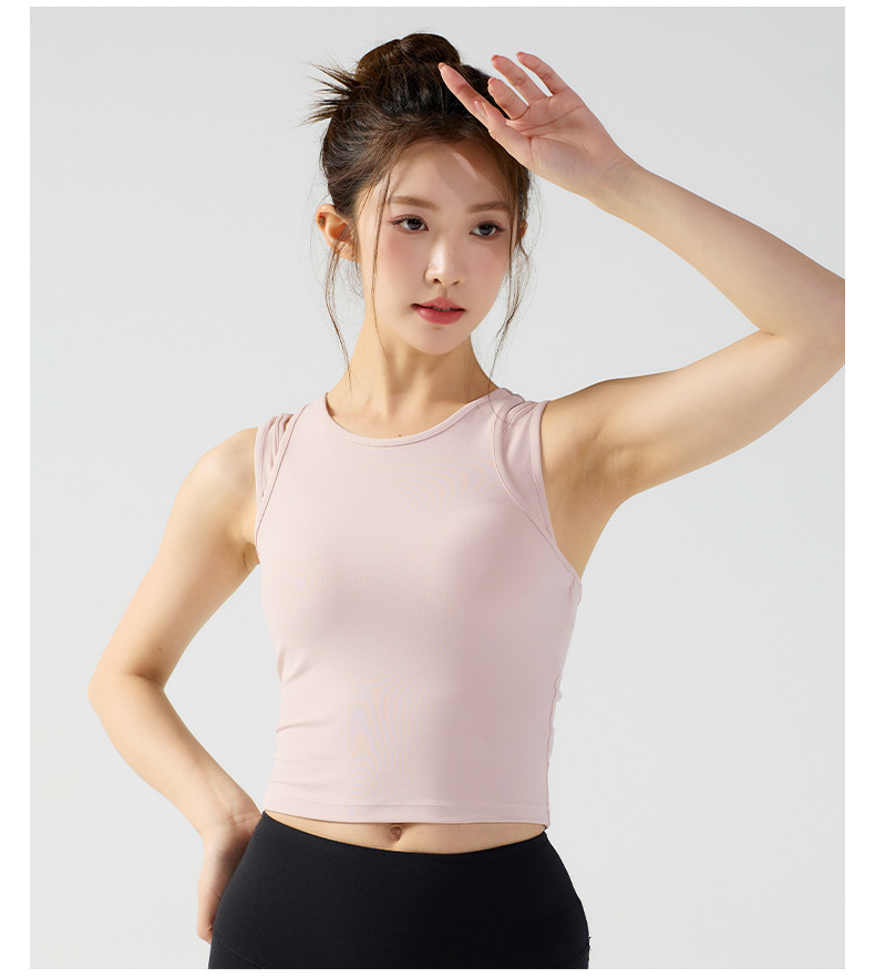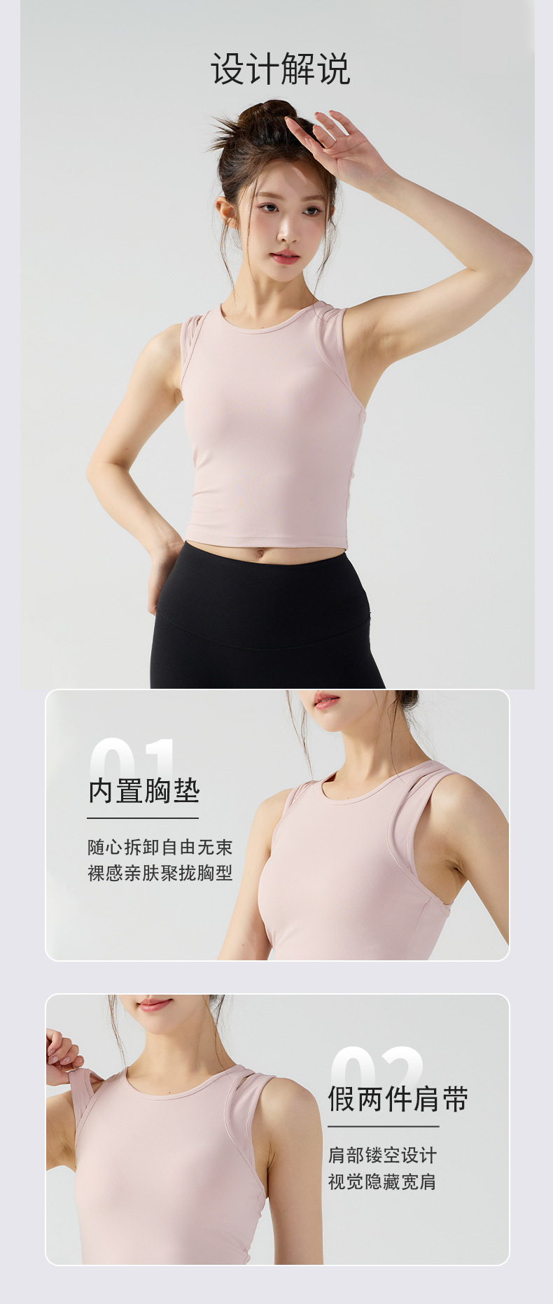 피부 친화적인 속건성 페이크 투피스 여성용 스포츠 탑, 푸쉬업 충격 방지 가슴 패드 포함 요가복, 통기성 피트니스 조끼스토어 가기