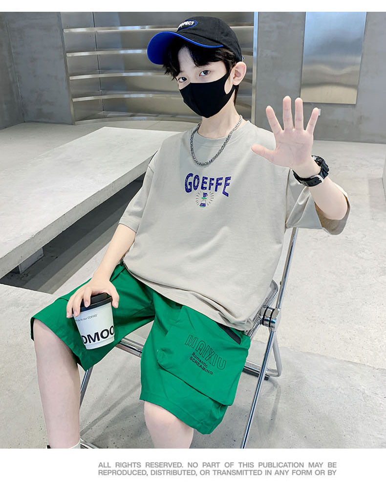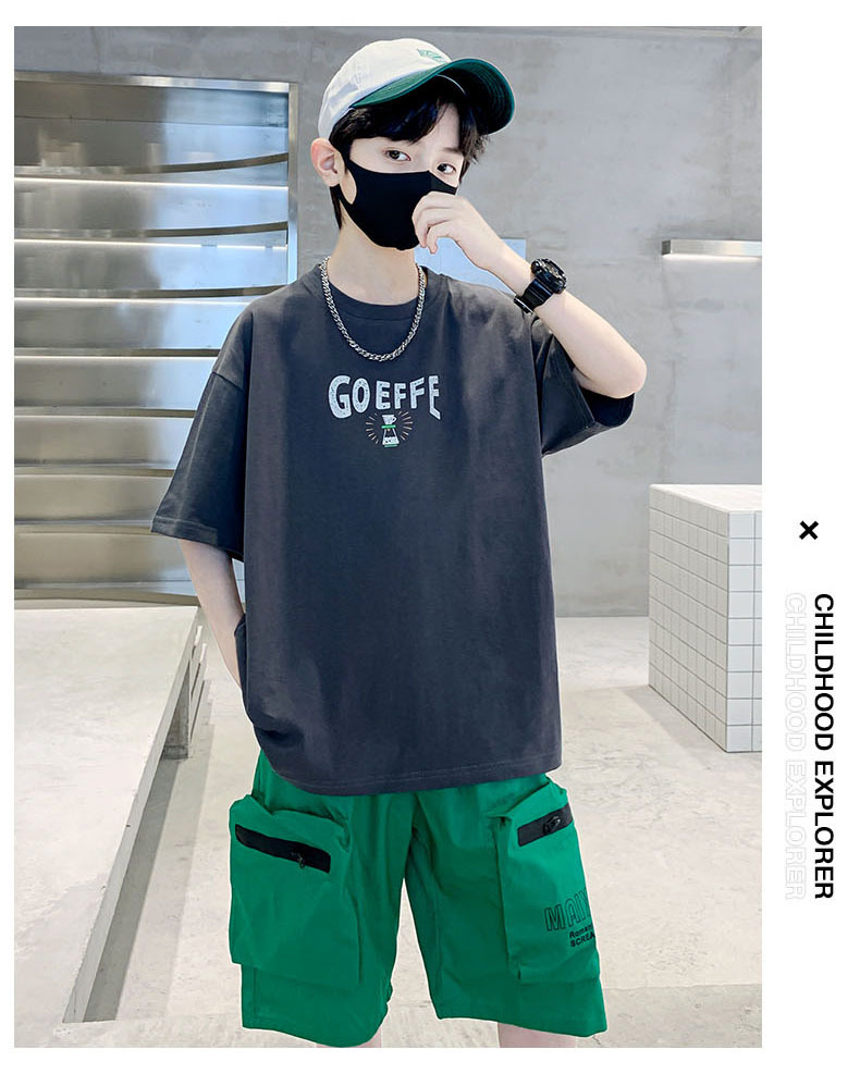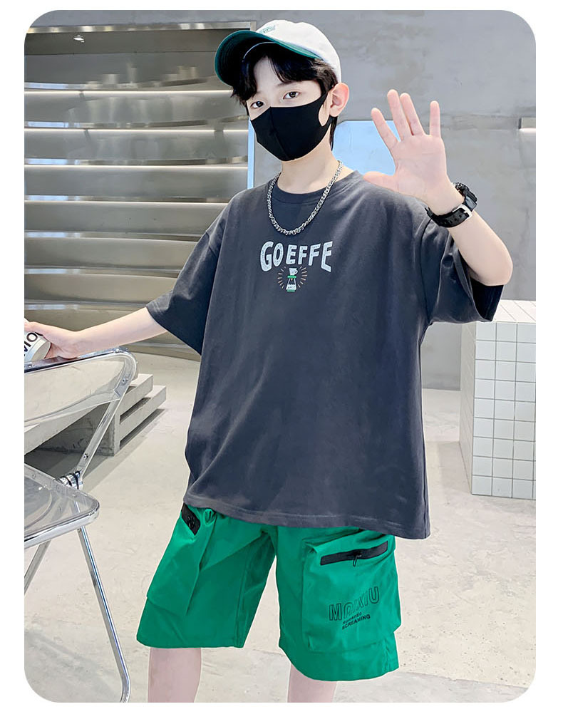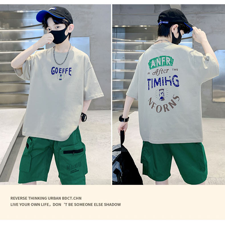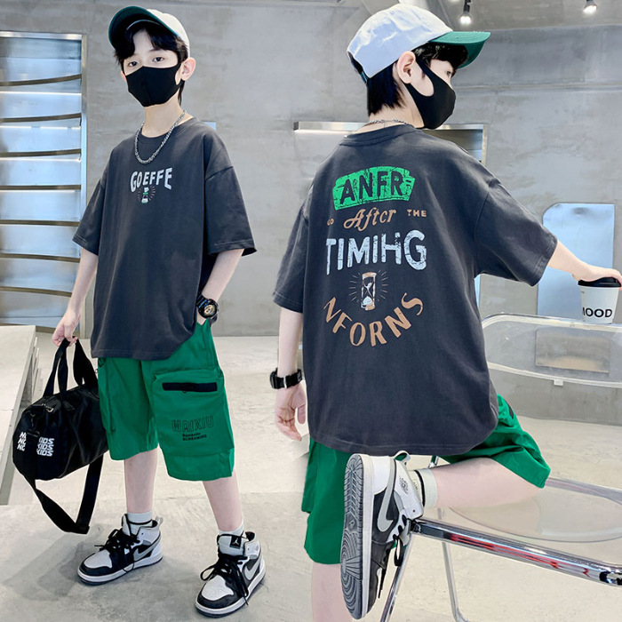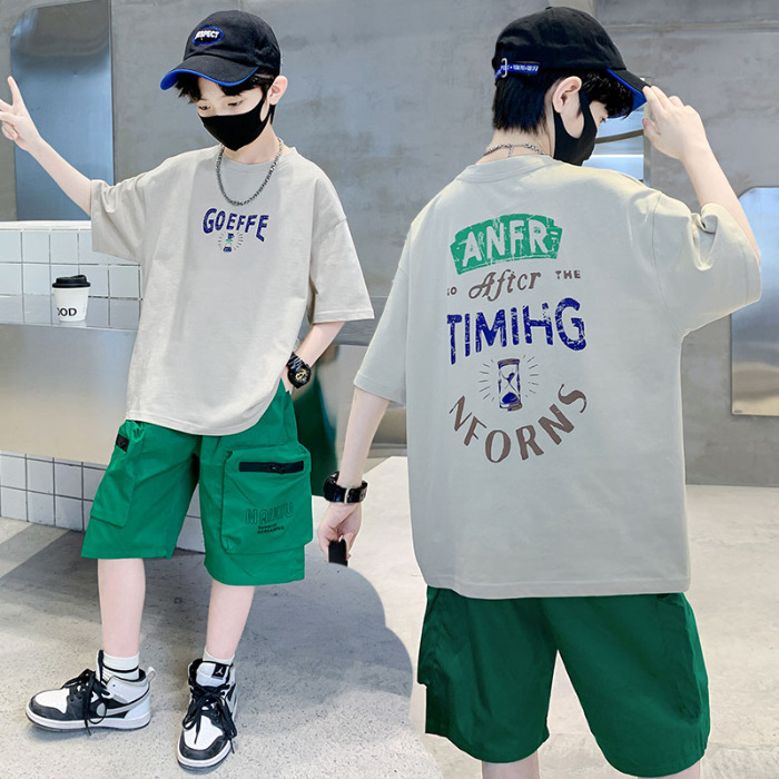 남학생 '빅 키즈를위한 한국식 세련된 쿨 스포츠 세트 여름 새로운 서양식 편지 인쇄 반팔 반바지 투피스 세트