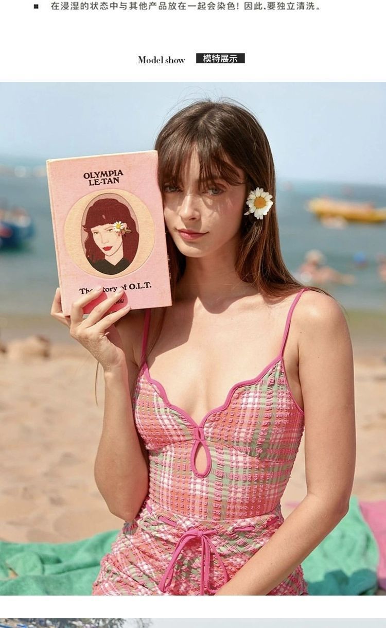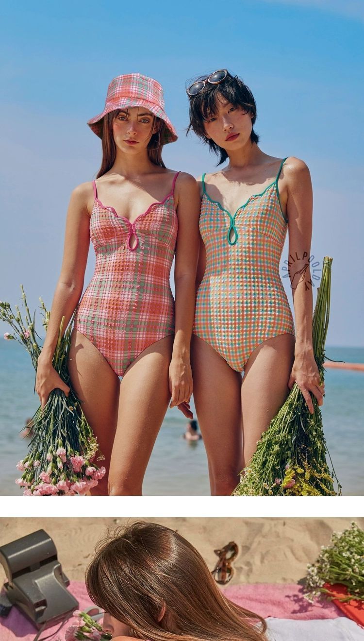 꽃과 소녀 나자 같은 스타일의 원피스 복고풍 핑크 체크 무늬 섹시한 백리스 스트랩 슬리밍 여성용 휴가 수영복