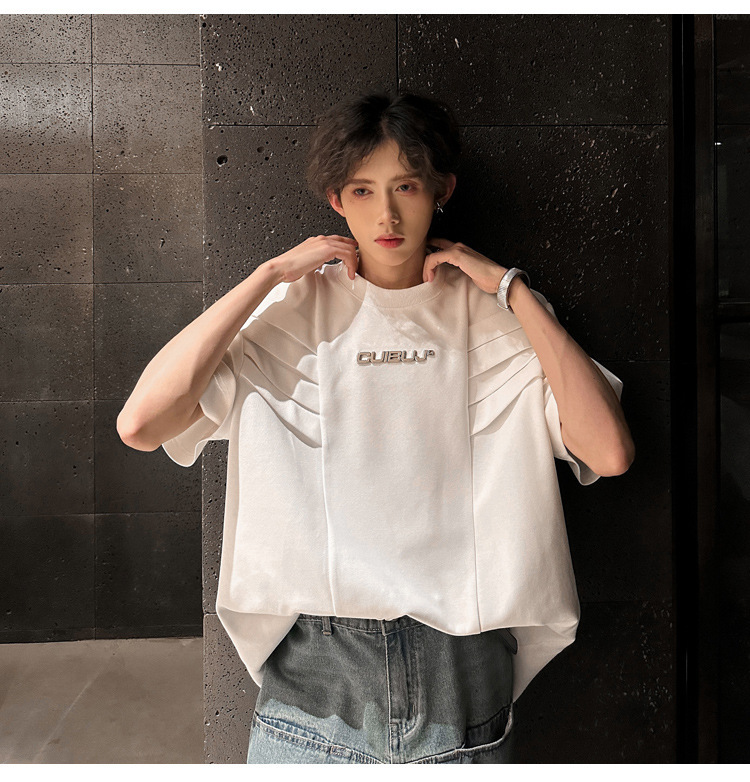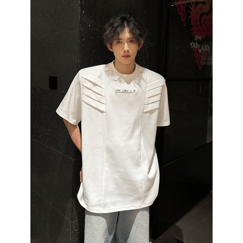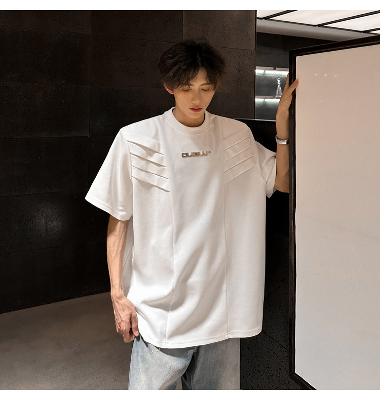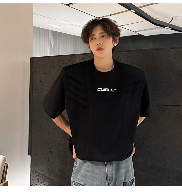 유럽과 미국의 하이 스트리트 오리지널 디자인 센스 티셔츠 남성 다단계 구조 어깨 패드 짧은 소매 여름 미국 무거운 반소매스토어 가기