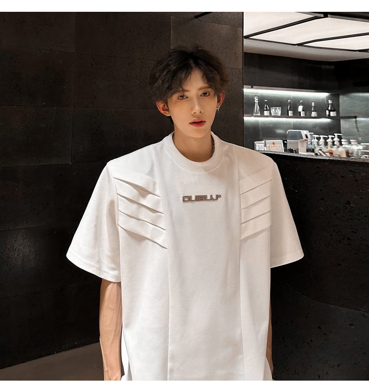 유럽과 미국의 하이 스트리트 오리지널 디자인 센스 티셔츠 남성 다단계 구조 어깨 패드 짧은 소매 여름 미국 무거운 반소매
