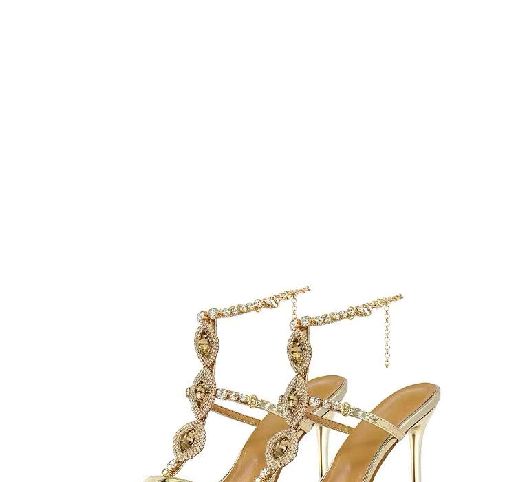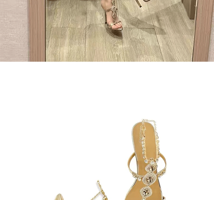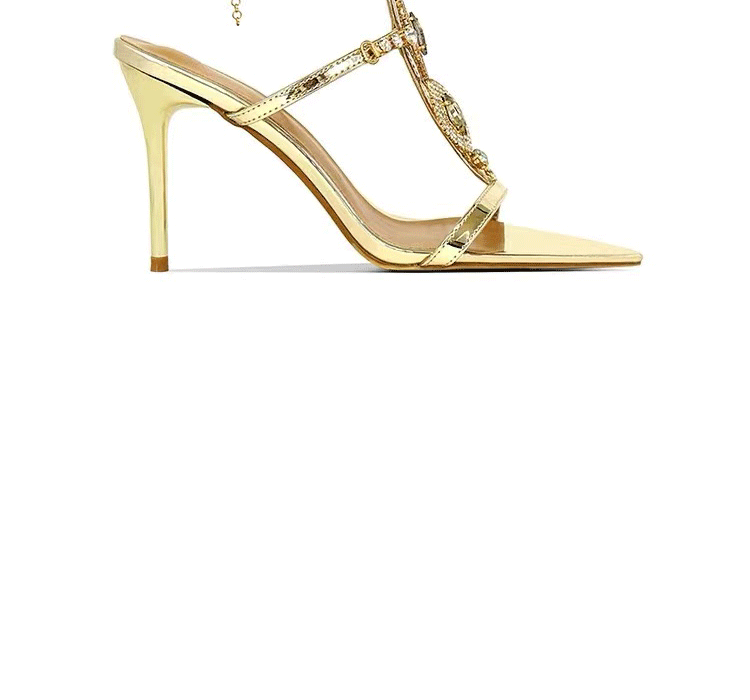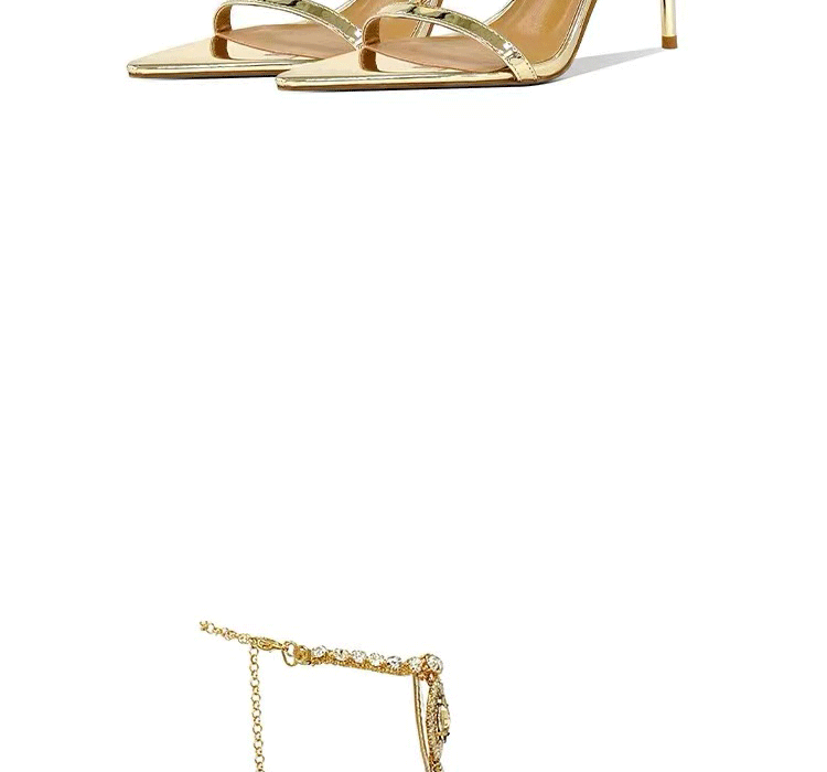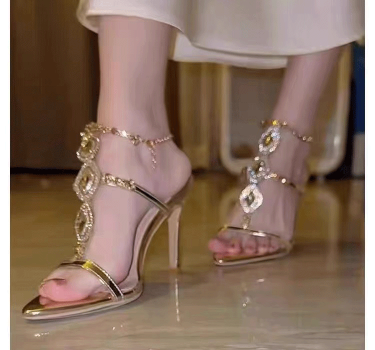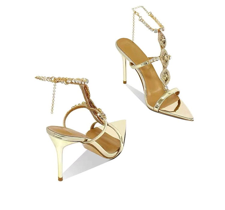 2025 년 여름 새 도착 보석 라인스톤 체인 골드 포인팅 하이힐 여성 우아한 왕실 자매 스틸레토 힐 오픈 발가락 샌들