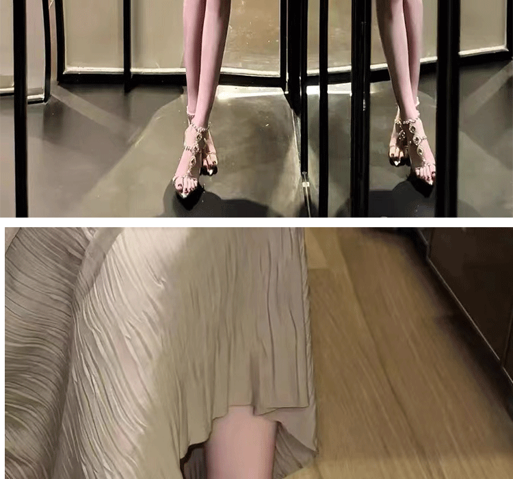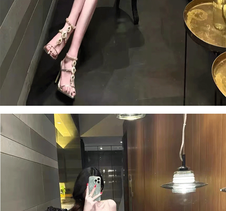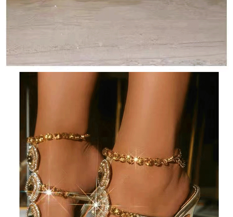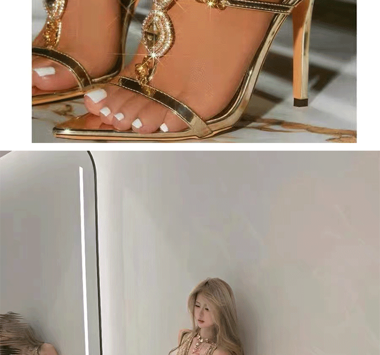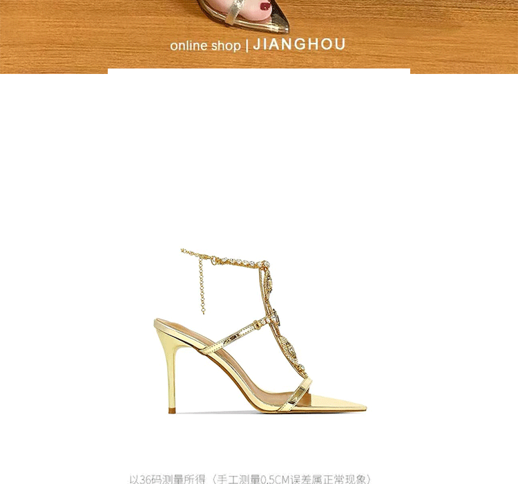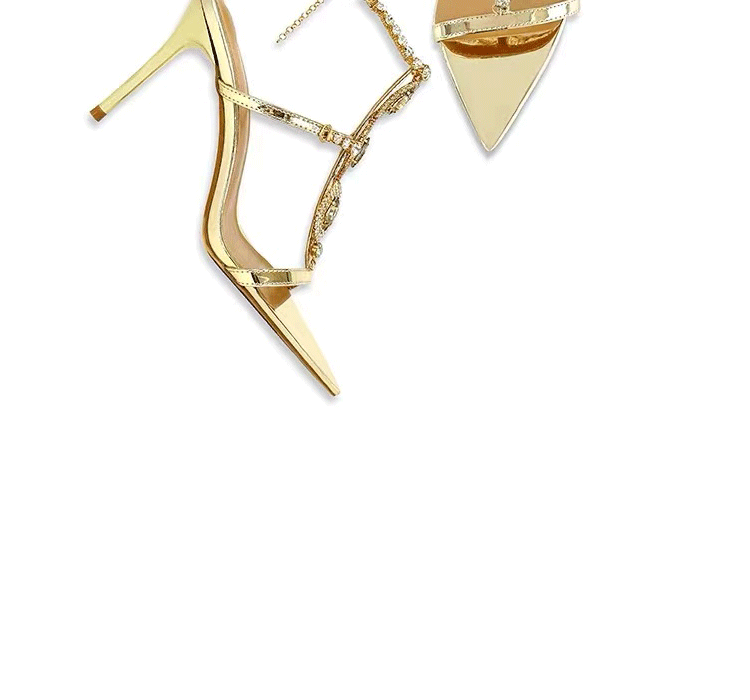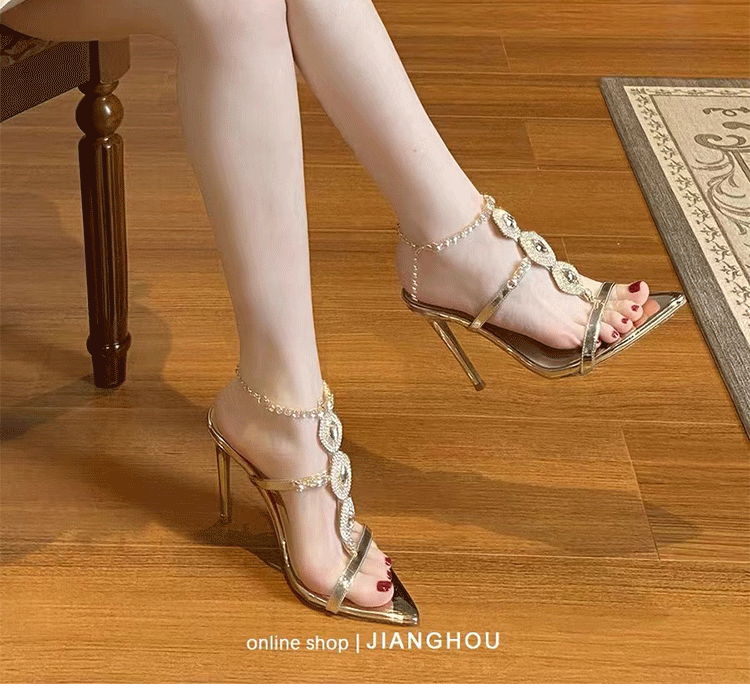 2025 년 여름 새 도착 보석 라인스톤 체인 골드 포인팅 하이힐 여성 우아한 왕실 자매 스틸레토 힐 오픈 발가락 샌들