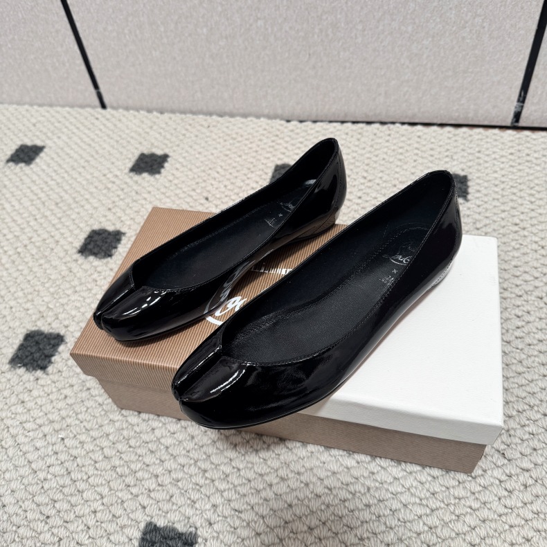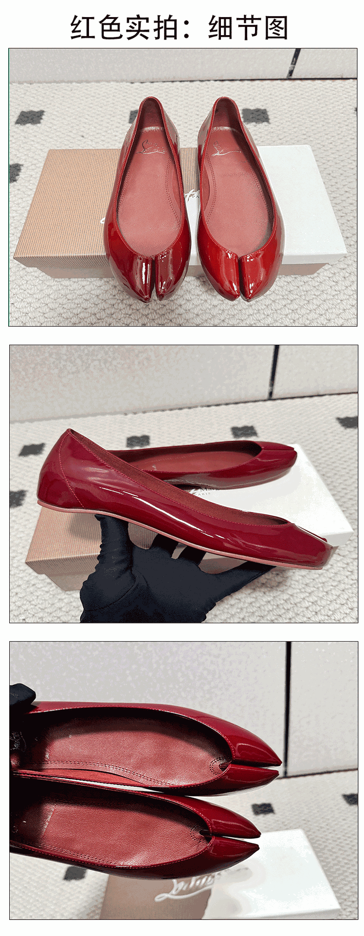 心,展现了时装设计师 John 与鞋履大师 CL别具一格的创意语言鞋款,巧妙融合了两大品牌的设计基因,呈现出独特风格与共通之处。Margiela家 标志性的 Tabi 分趾鞋。三款鞋履均饰以设计师经典的红底,以其精湛工艺重新诠释经典分趾设计:通过两块独立材质拼接而成,而非传统的分趾切割工艺,赋予鞋款优雅的心形轮廓,宛如女性的锁骨线条。此设计巧妙呼应了 Margiela 家推崇的”无意识魅力”理念——那些深植于集体潜意识中的迷人意象,为经典 Tabi 鞋款注入了微妙而含蓄的性感气质。