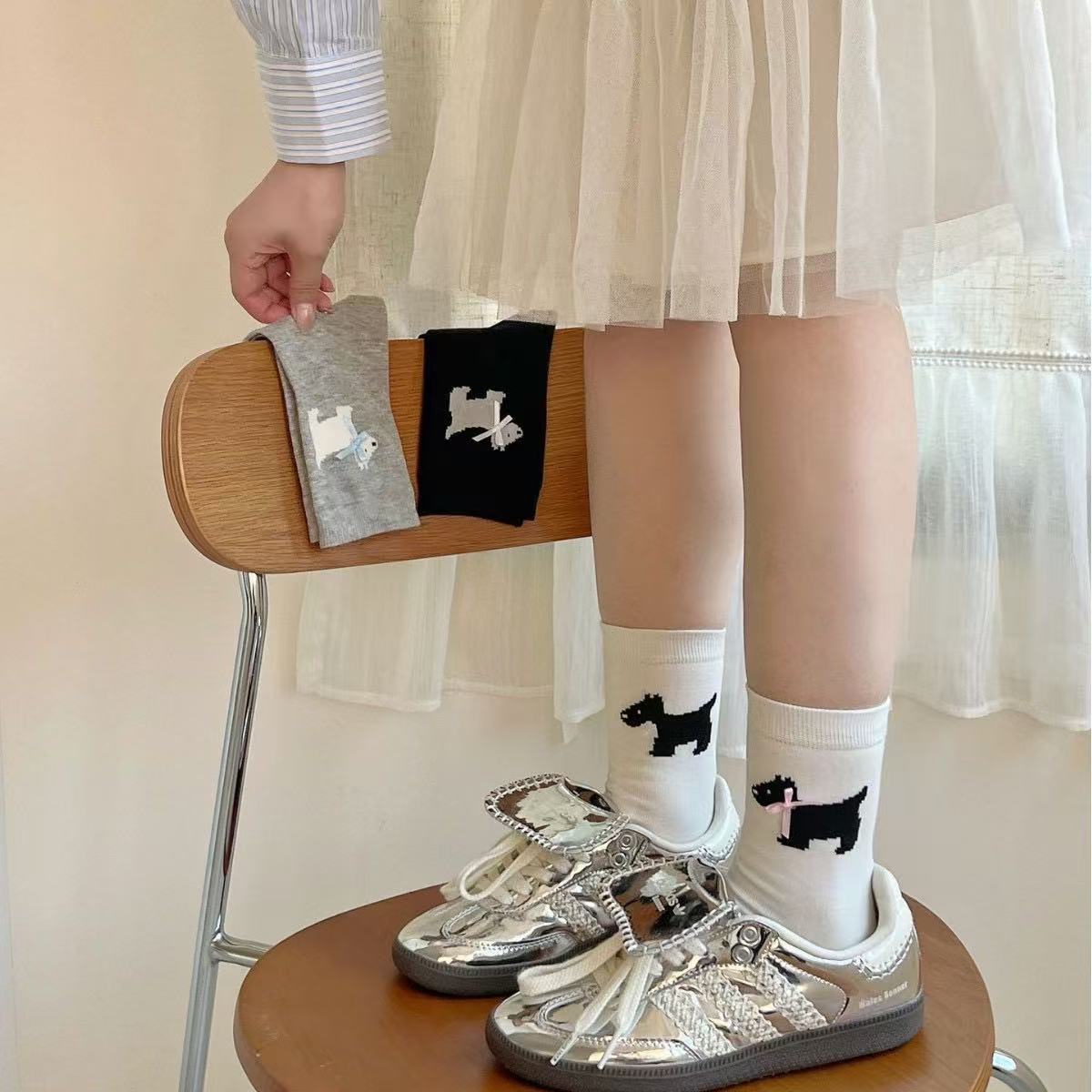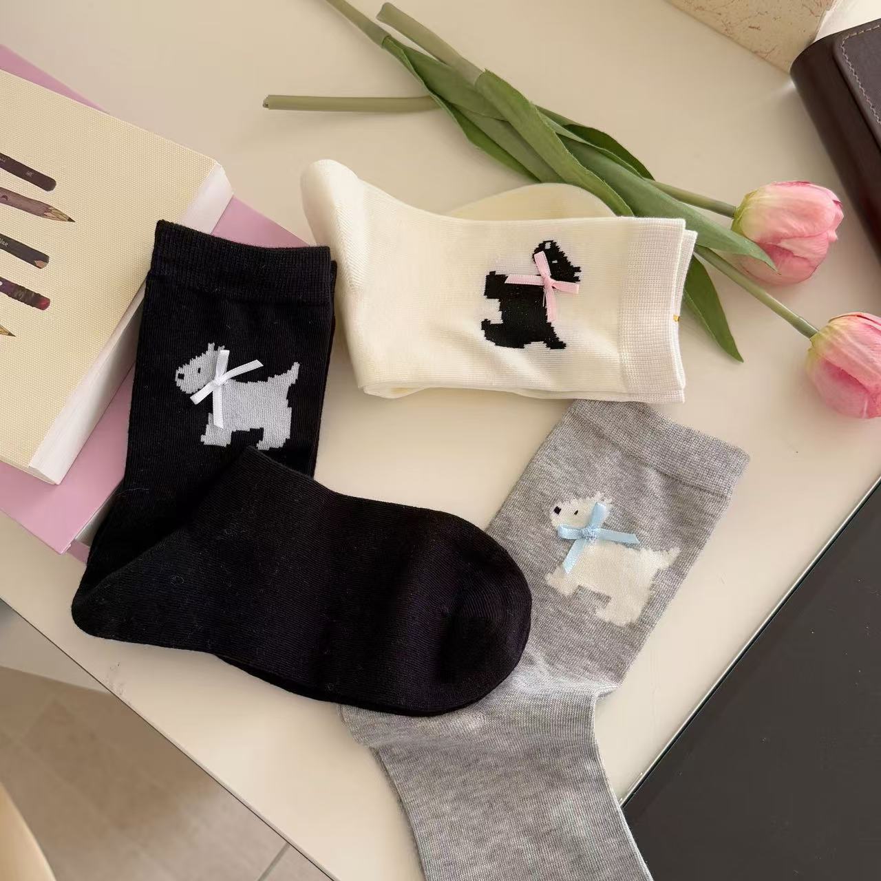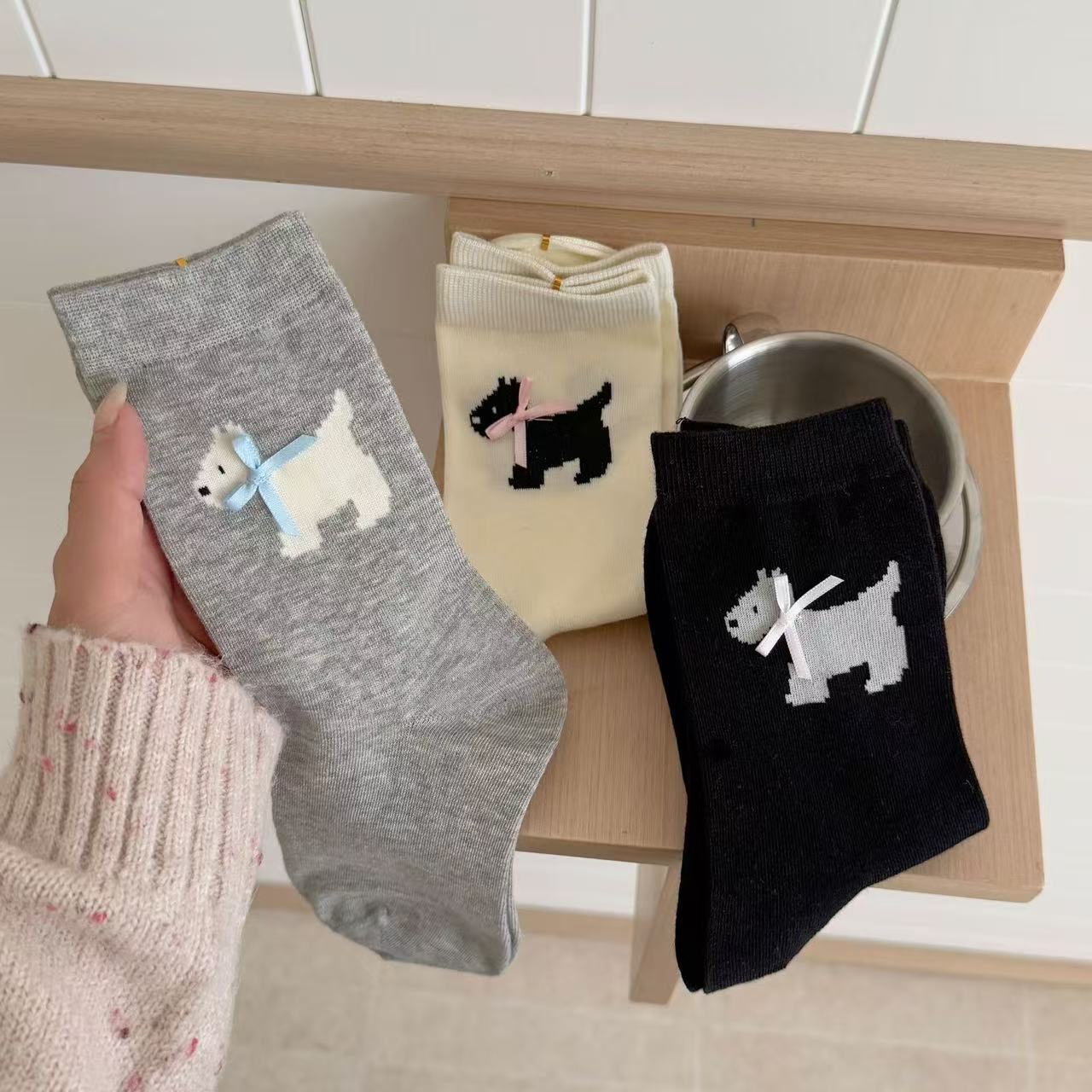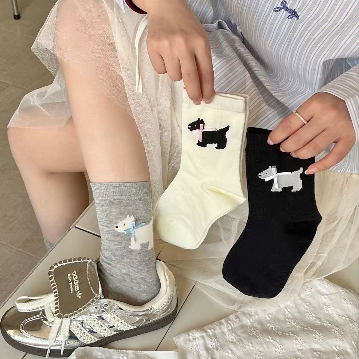 여성용 봄 여름 빗질면 뼈없는 양말 한국어 버전 만화 웨스트 하이랜드 강아지 보우 미드 튜브 양말 귀여운 양말