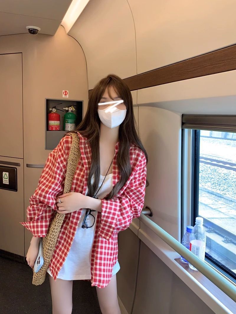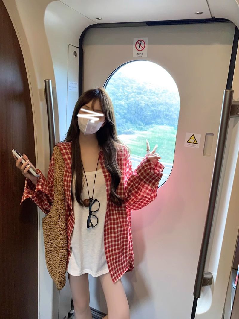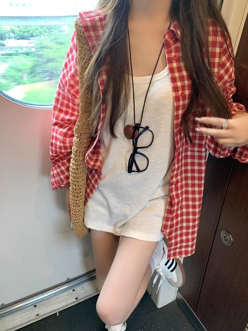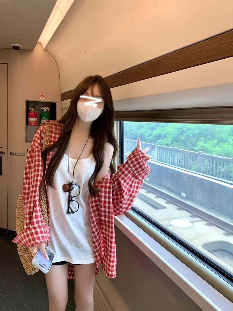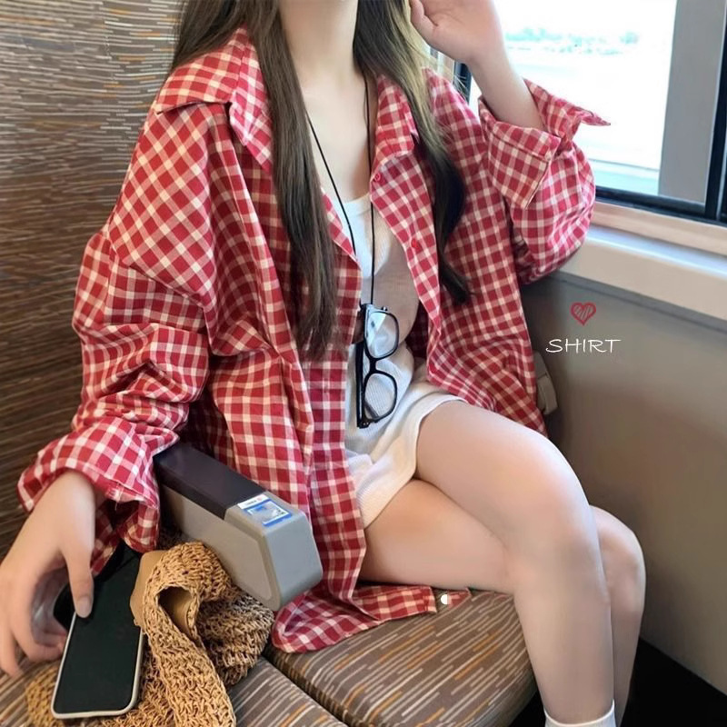 한국식 여름 새 스타일 체크 무늬 캐주얼 태양 보호 셔츠 코트 여성용 게으른 조커 느슨한 카디건 중간 길이 셔츠스토어 가기