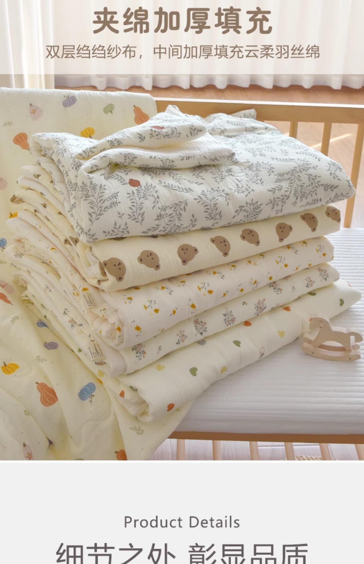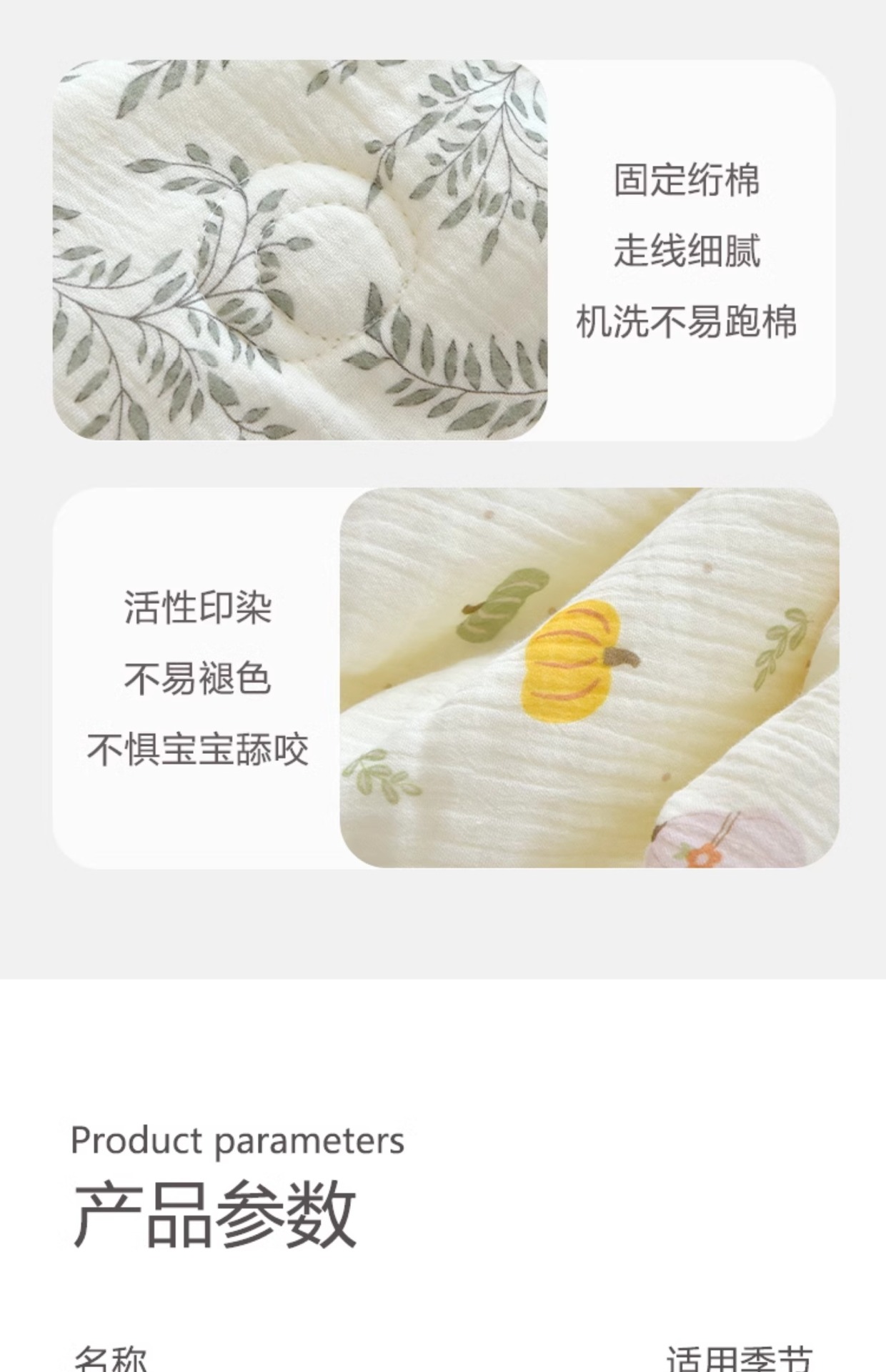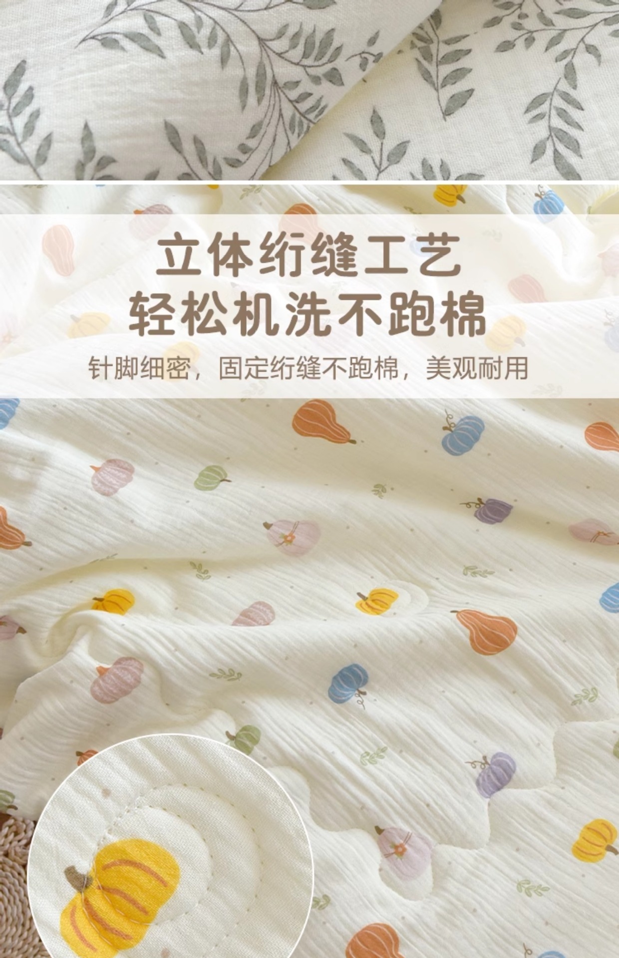 采用绗缝工艺定点加固,美观耐用的同时也能更好的固定夹棉
