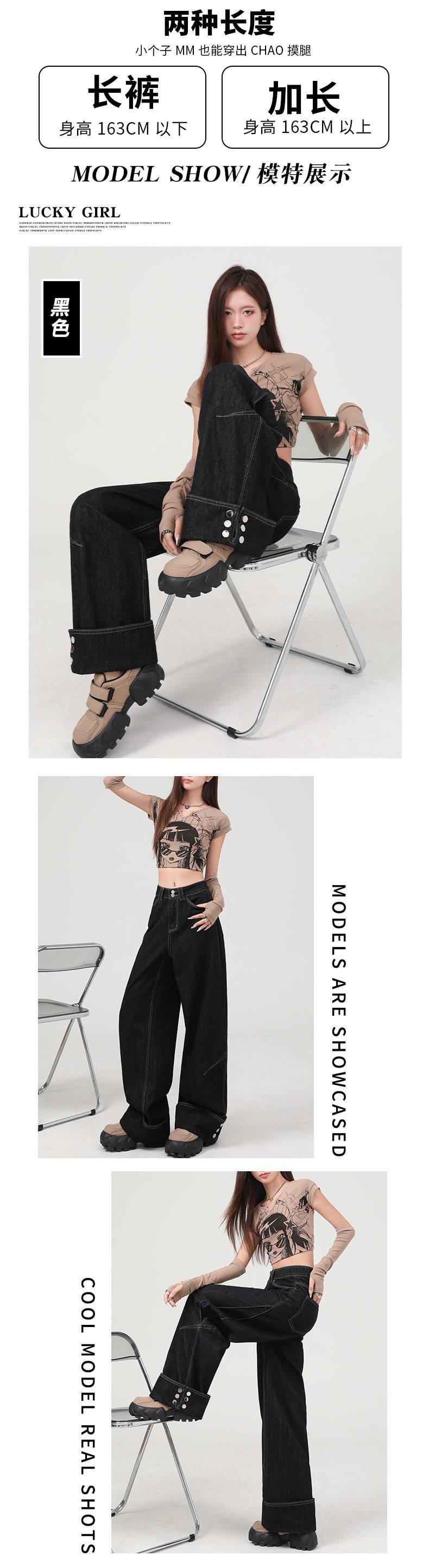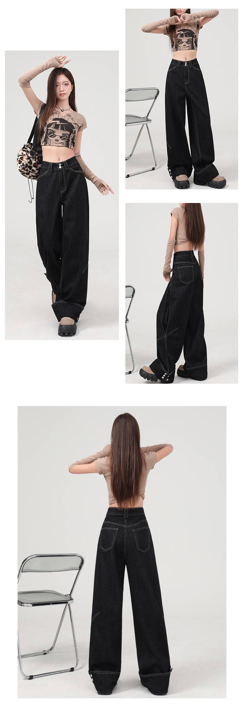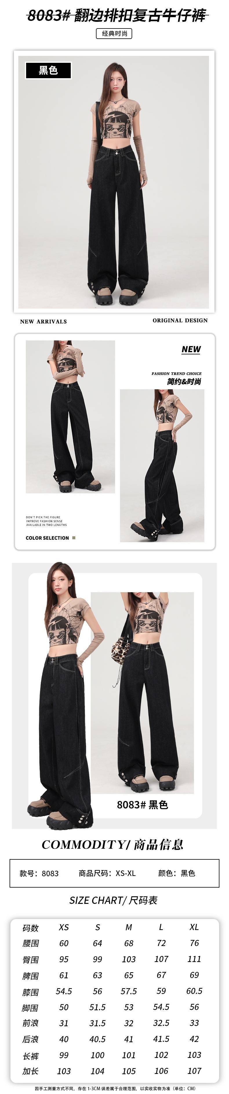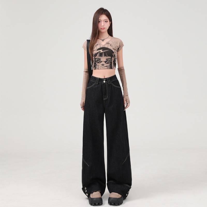 도매 미국 복고풍 느슨한 하이 웨이스트 블랙 청바지 여성용 중공업 커프 디자인 와이드 레그 바닥 길이 바지스토어 가기