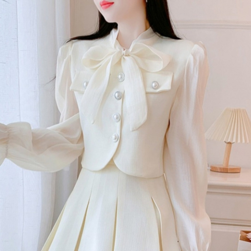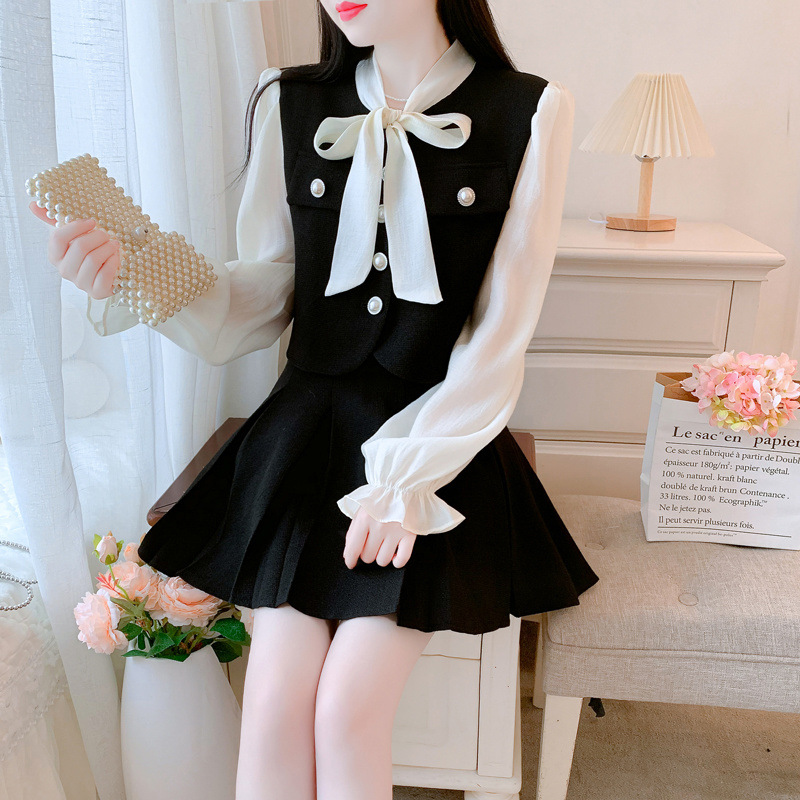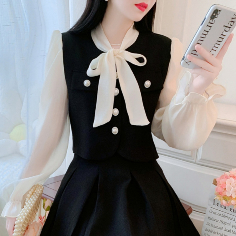 봄과 가을 새로운 프랑스 사교계 새로운 스타일 투피스 원피스 작은 샤넬 스타일 활 셔츠 높은 허리 치마