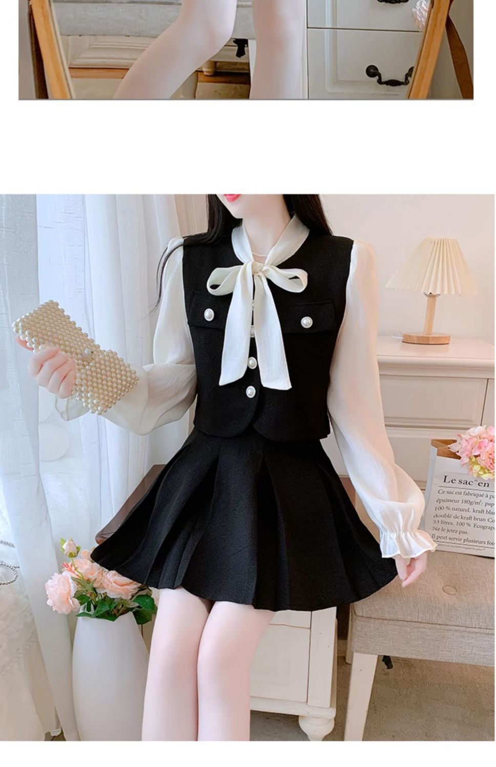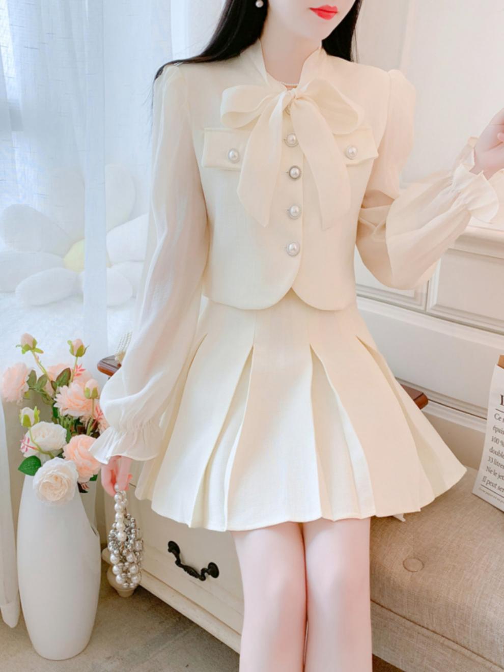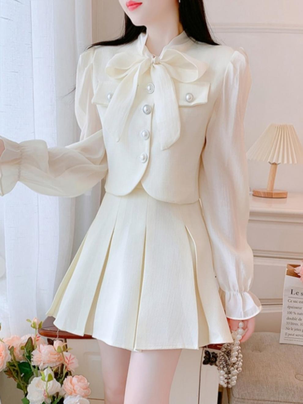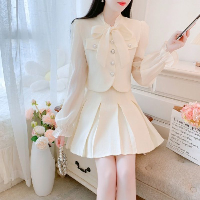 봄과 가을 새로운 프랑스 사교계 새로운 스타일 투피스 원피스 작은 샤넬 스타일 활 셔츠 높은 허리 치마스토어 가기