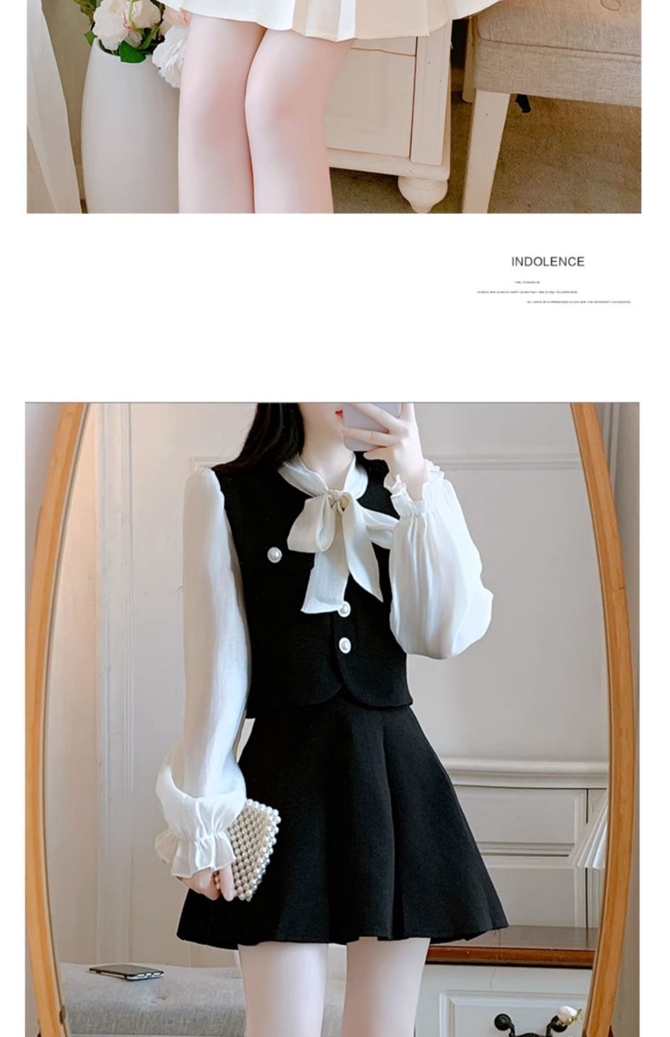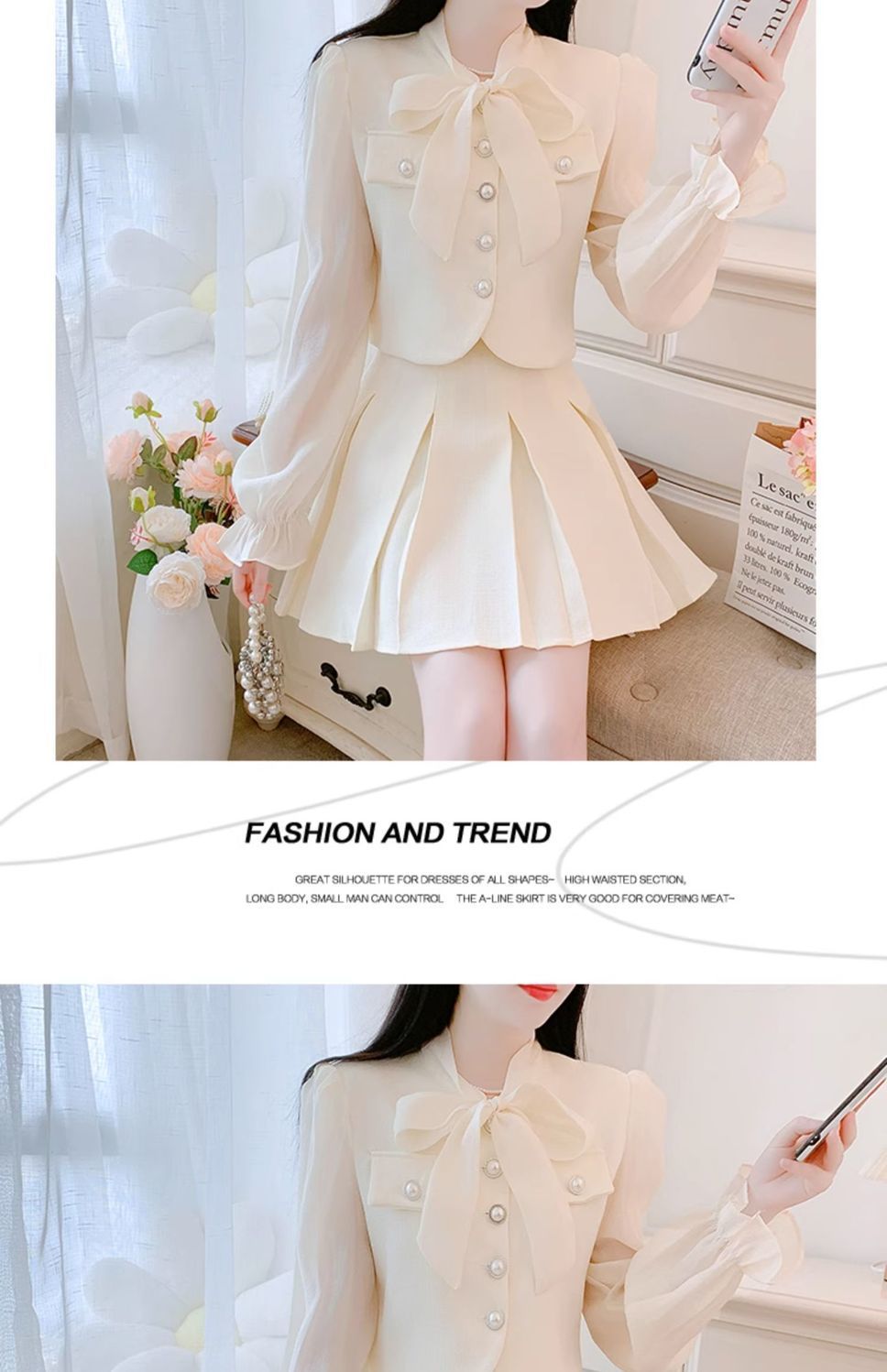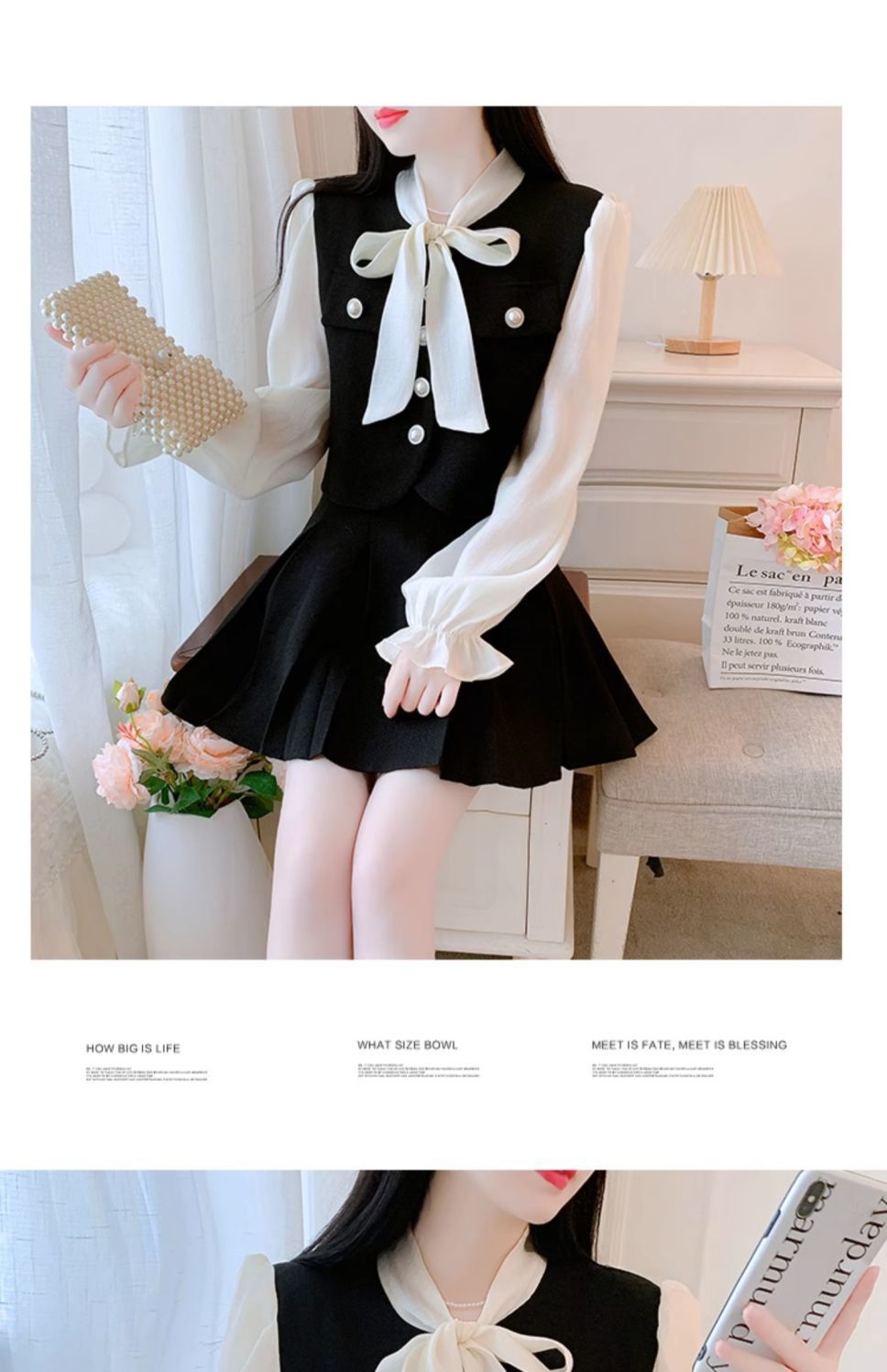 봄과 가을 새로운 프랑스 사교계 새로운 스타일 투피스 원피스 작은 샤넬 스타일 활 셔츠 높은 허리 치마스토어 가기