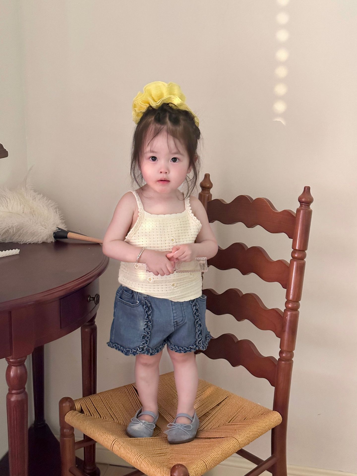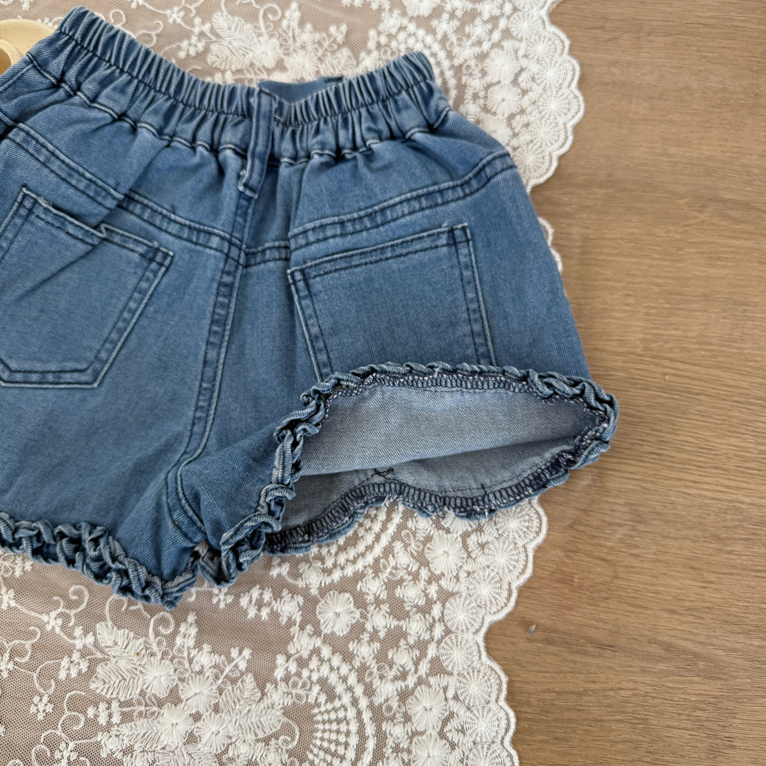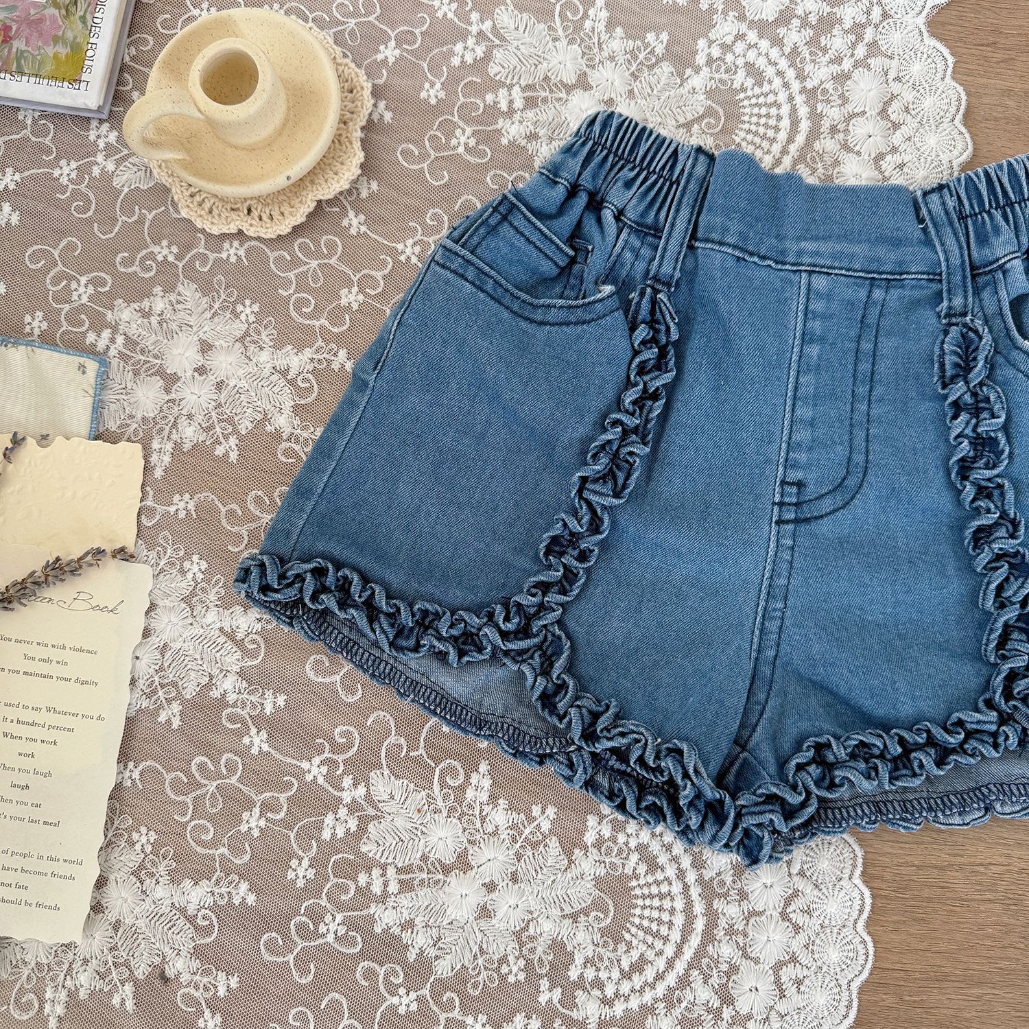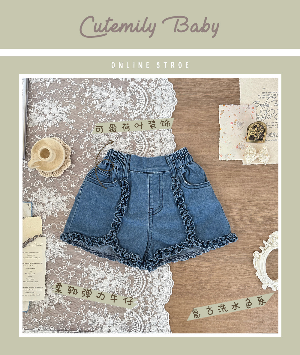 Cutemily 여름 소녀 복고풍 코튼 청바지 아기 소녀 연잎 주름 탄성 데님 반바지