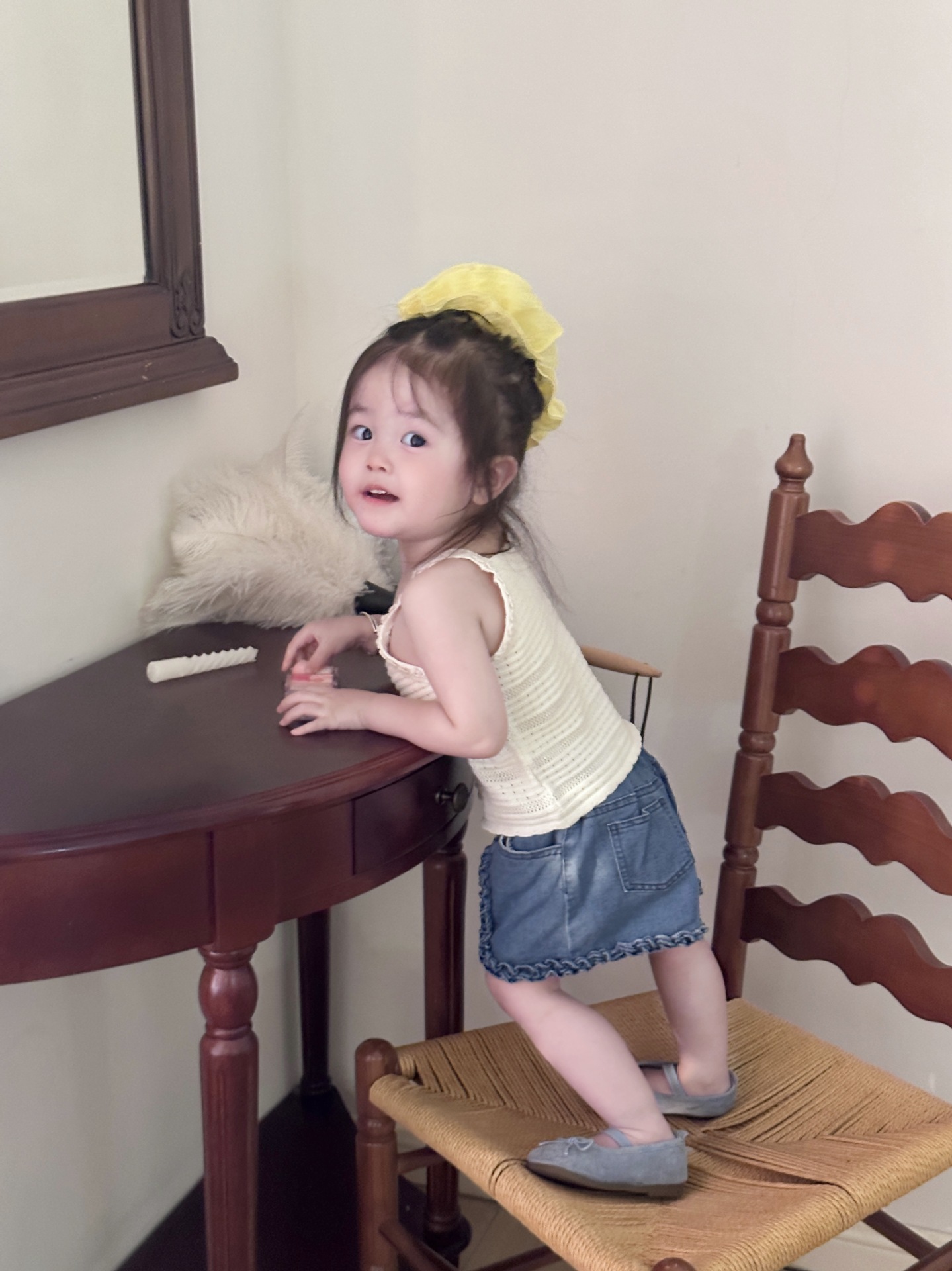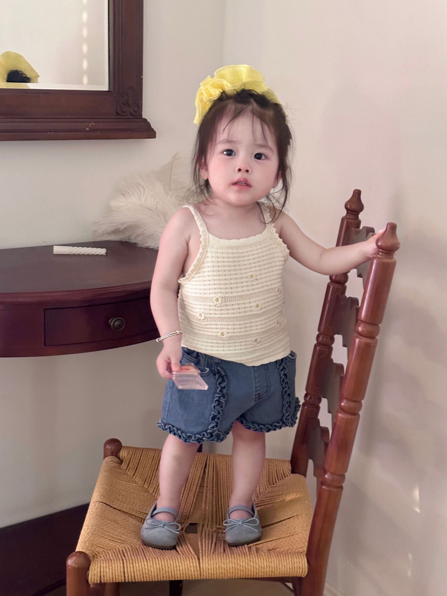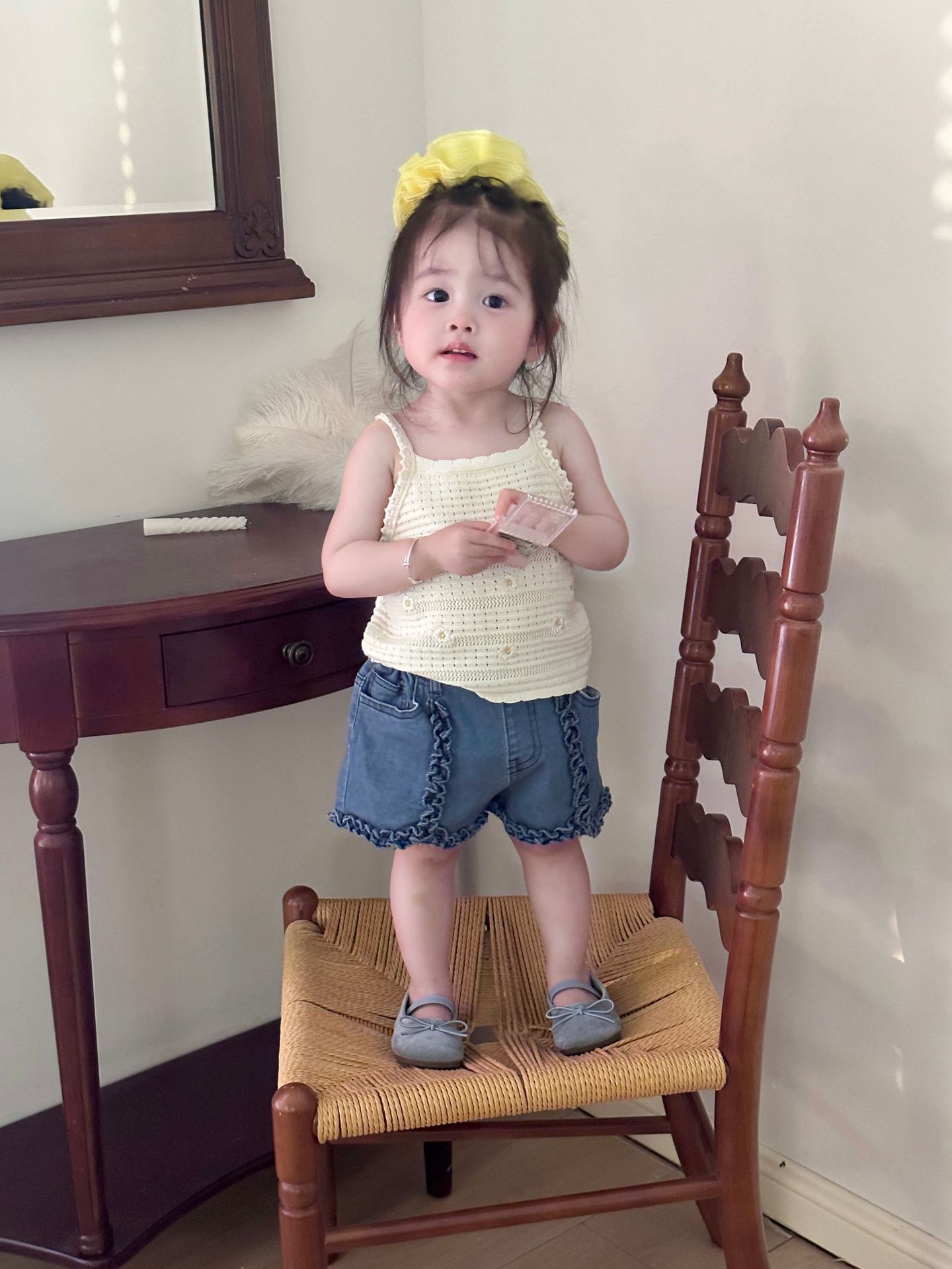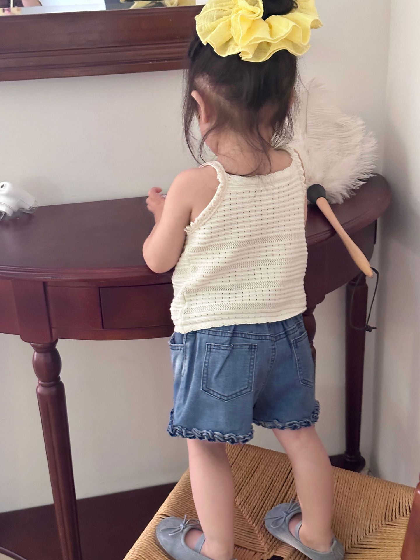 Cutemily 여름 소녀 복고풍 코튼 청바지 아기 소녀 연잎 주름 탄성 데님 반바지
