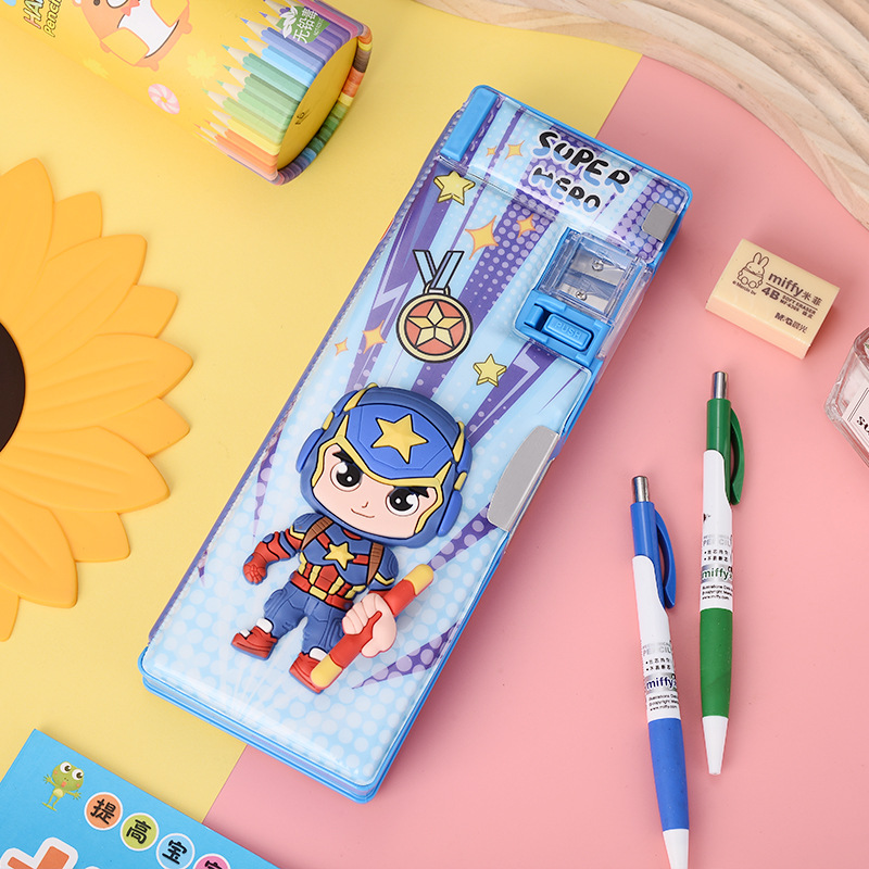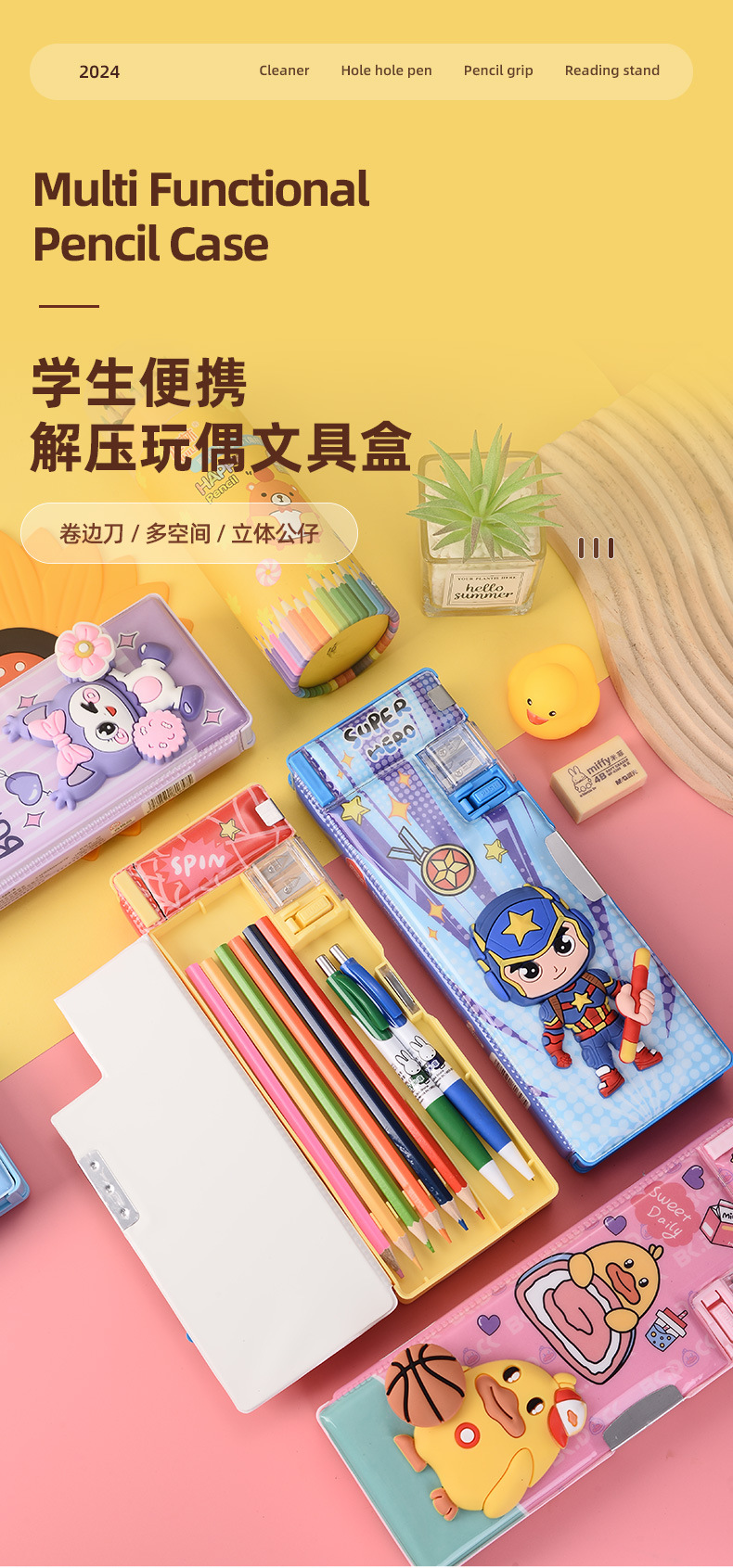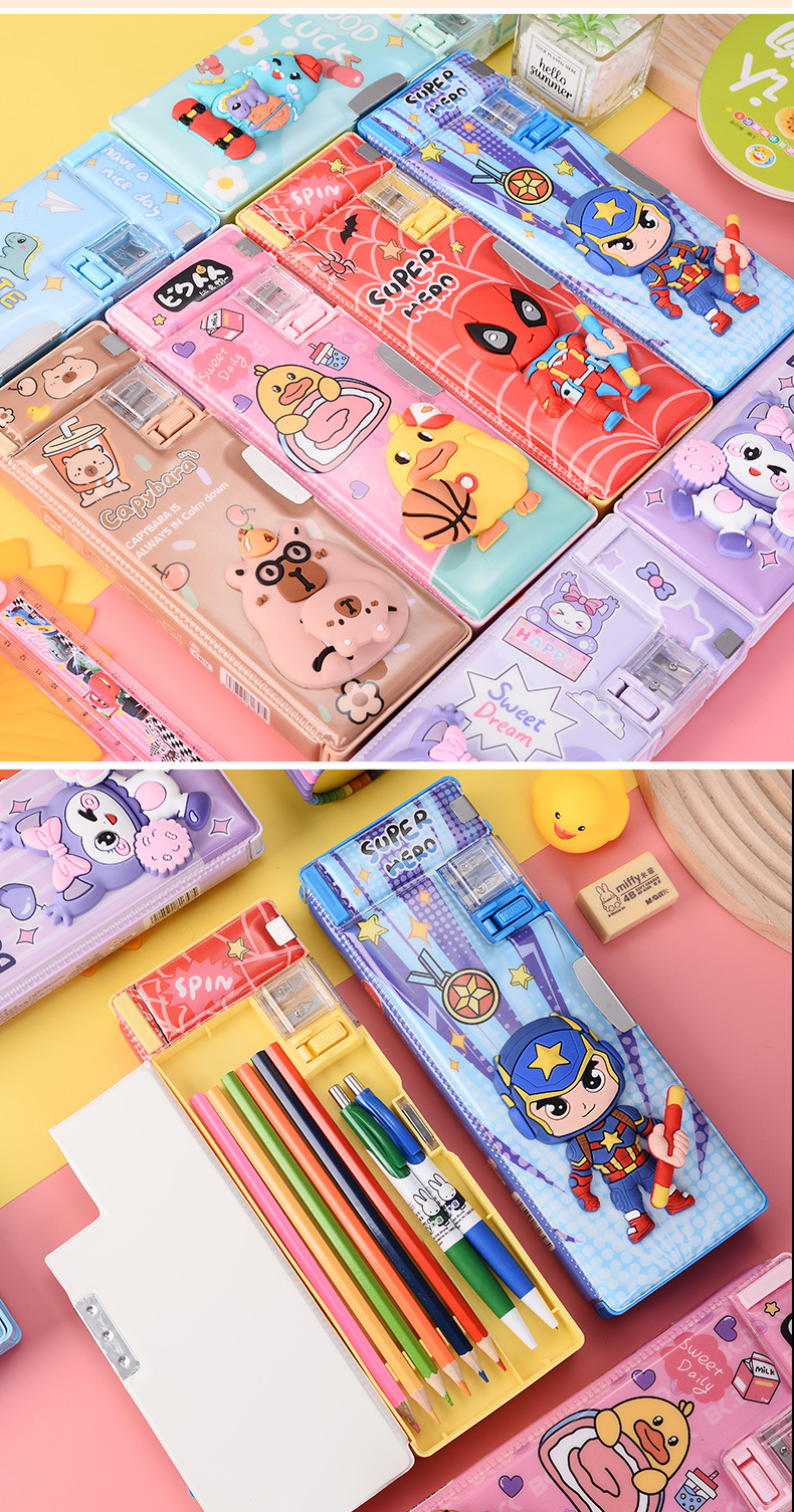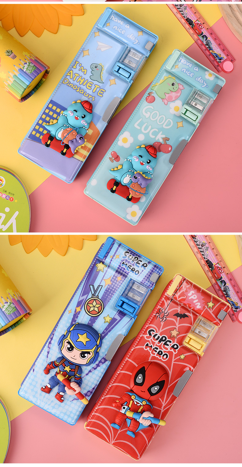 국경 간 아마존 만화 입체 인형 어린이 문구 상자 소년과 소녀를위한 샤프너가있는 창의적인 더블 레이어 연필 상자