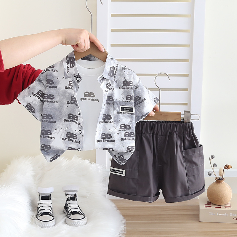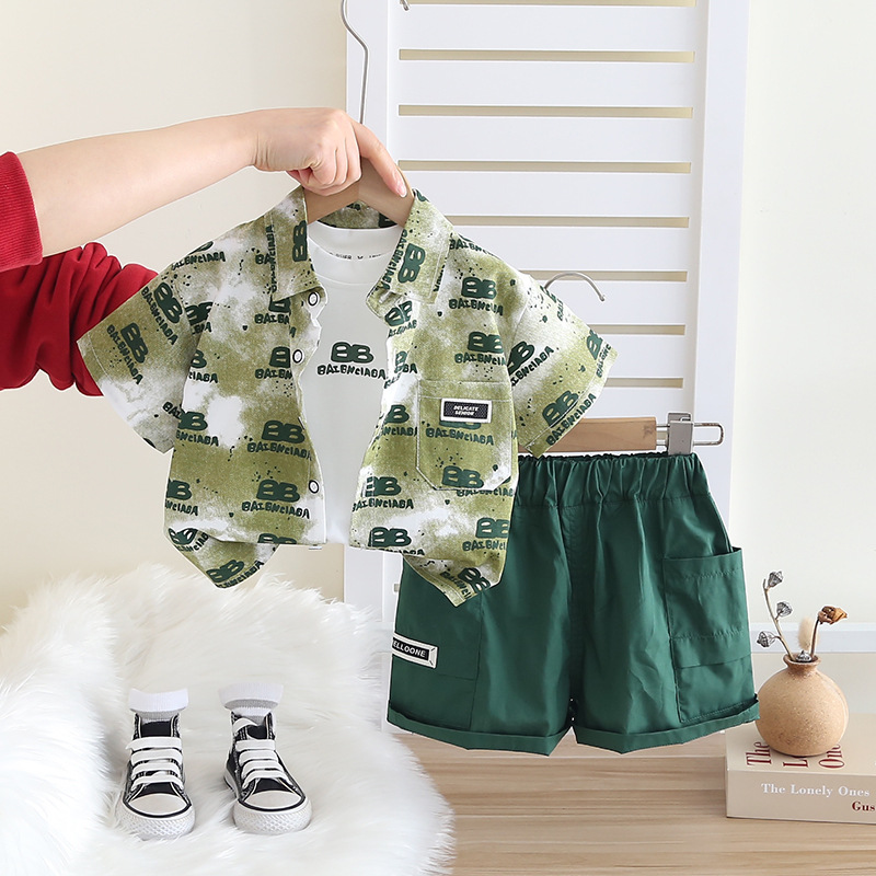 소년 여름 반팔 정장 2025 새로운 스타일의 캐주얼 레터 셔츠 3 피스 세트 중소 어린이를위한 드롭 배송스토어 가기