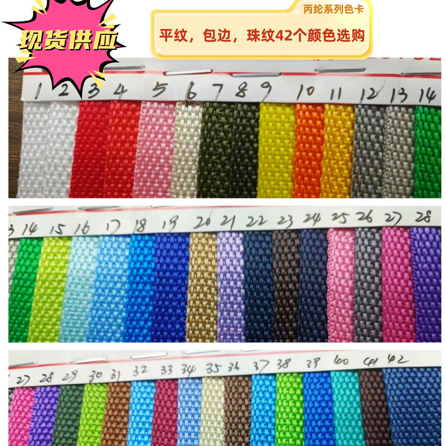 4.涤纶系列:人字纹,包边带,平纹。40几个颜色包边现货供应,规格2.0CM-2.5CM其他纹路需定做。