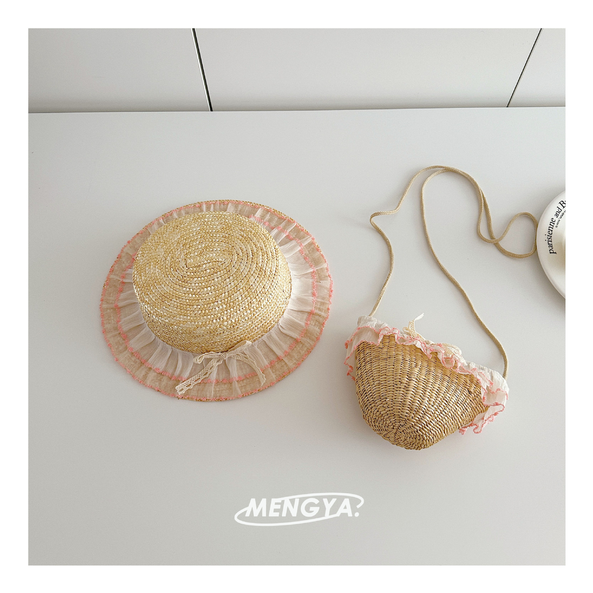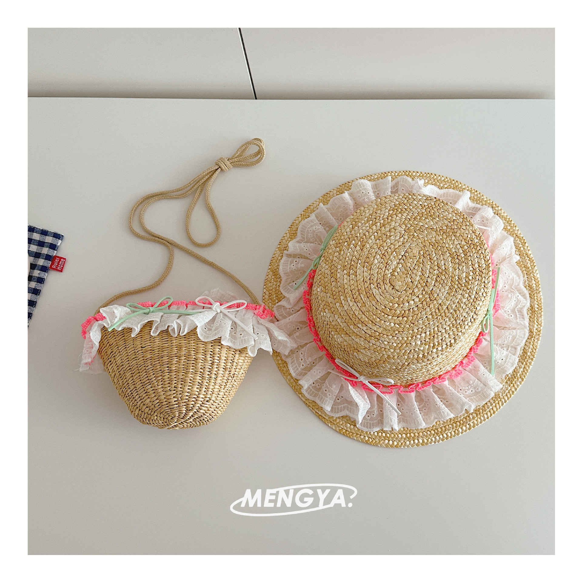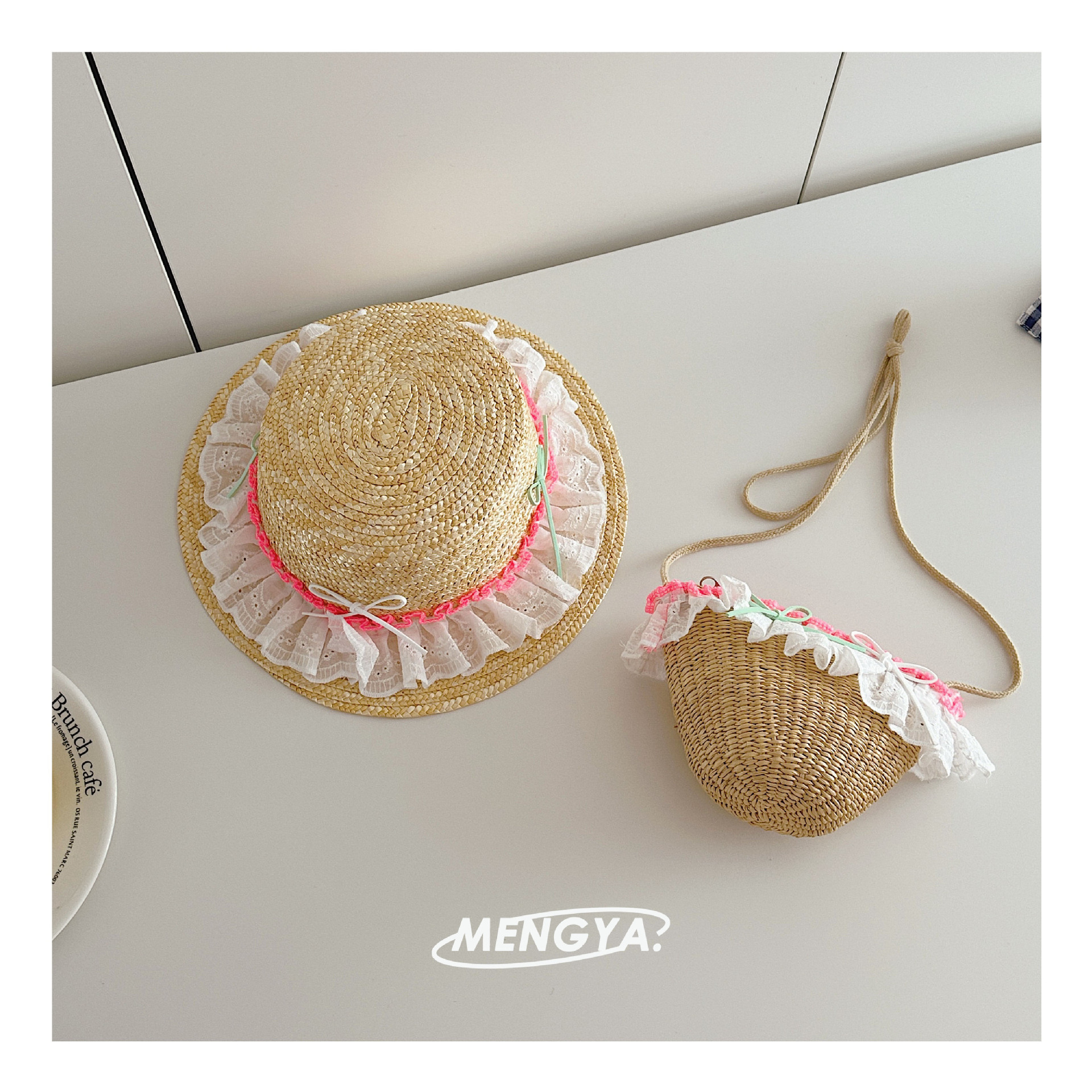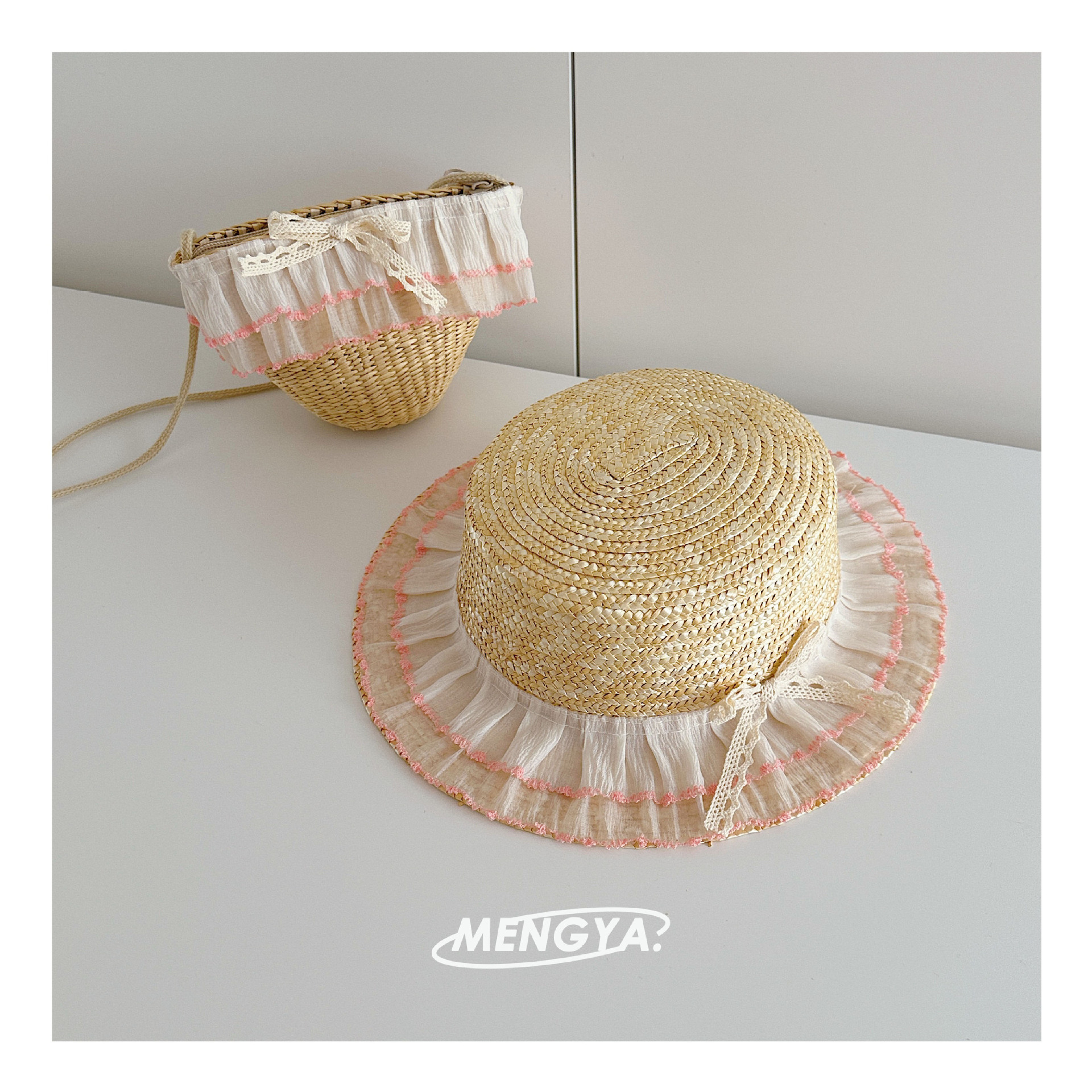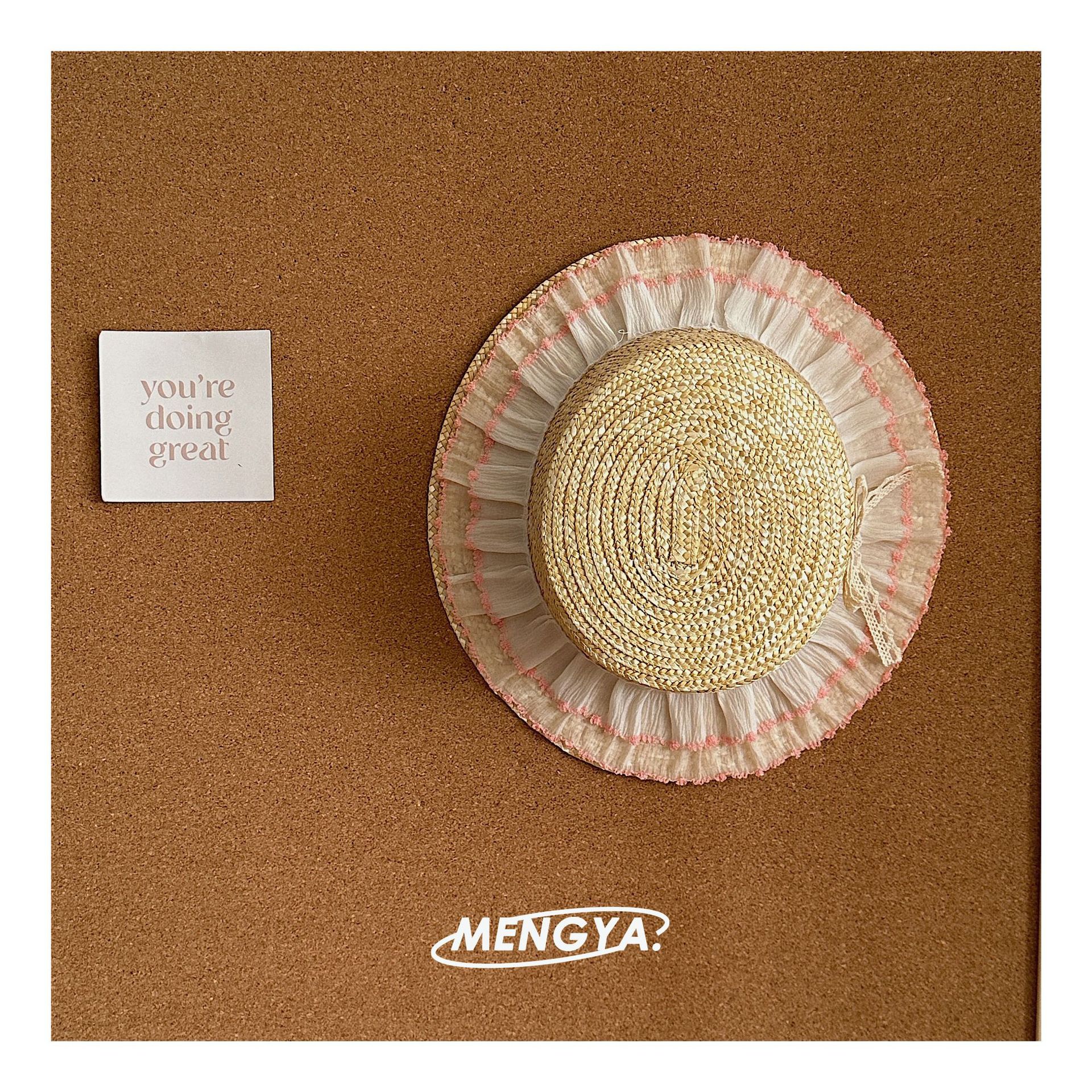 어린이 모자 여름 밀 밀짚 모자 소녀 선 스크린 모자 소녀 레이스 꽃 햇빛 모자 가방 세트 요정