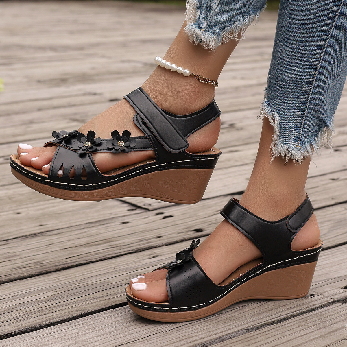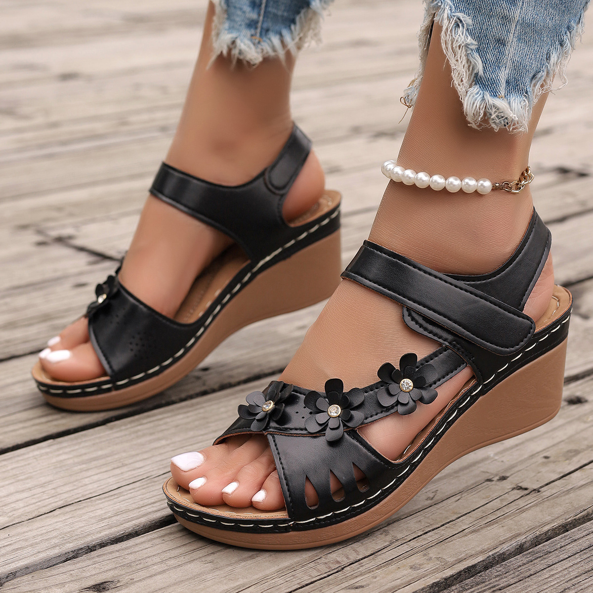 2025 여름 대외 무역 새로운 여성 쐐기 두꺼운 밑창 샌들 국경 플러스 사이즈 물고기 입 비치 샌들 꽃 장식스토어 가기
