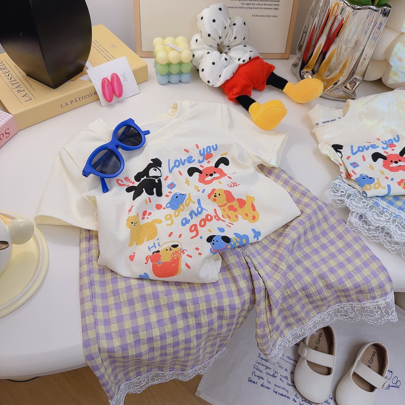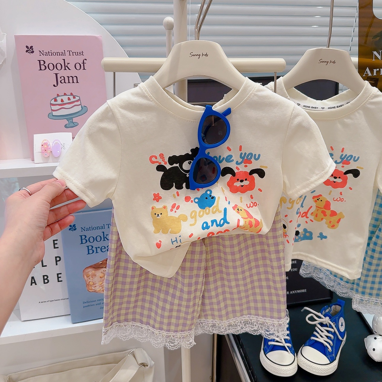 여자 만화 반팔 세트 2025 여름 새로운 어린이 반팔 티셔츠 어린이 자른 넓은 다리 바지 세트