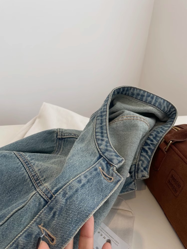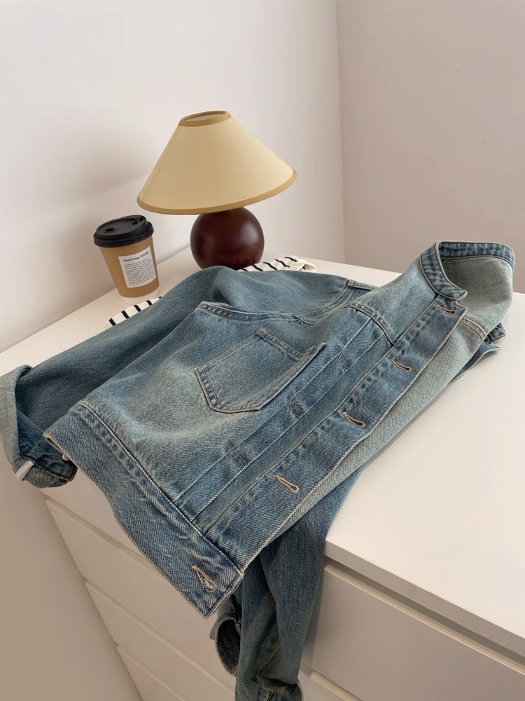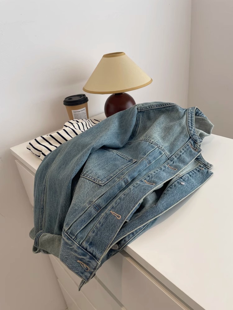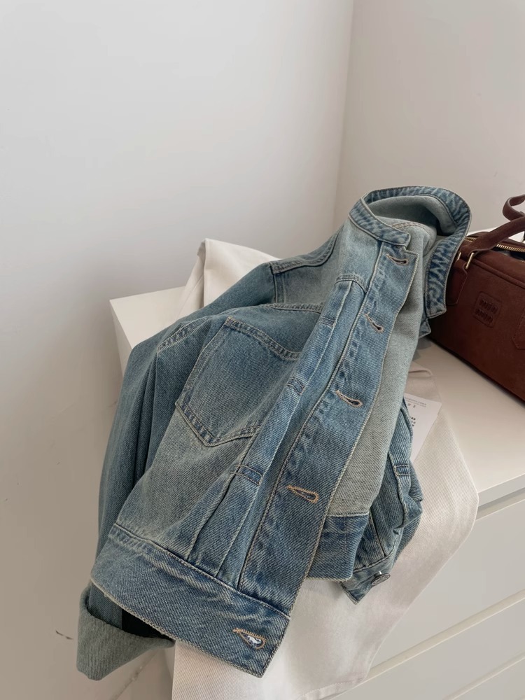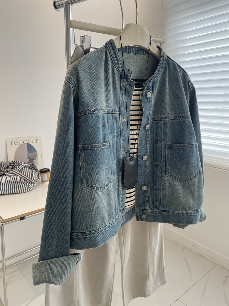 레트로 워터 첫 블루 칼라 데님 짧은 코트 여성! 2025 봄 한국식 슬림 핏 캐주얼 재킷스토어 가기