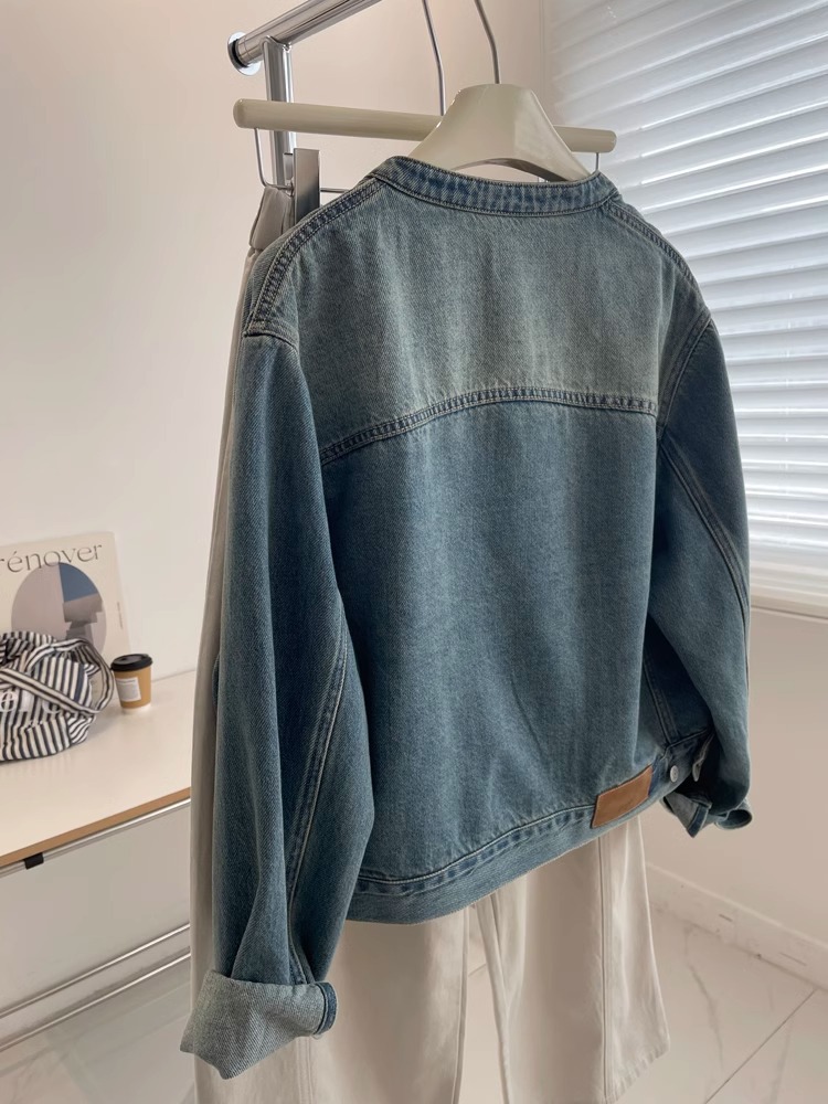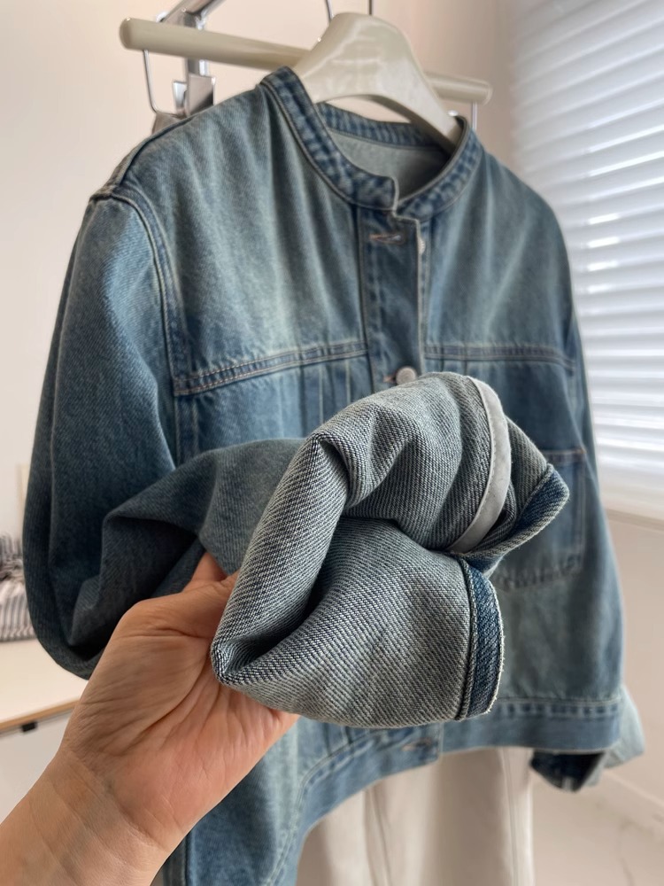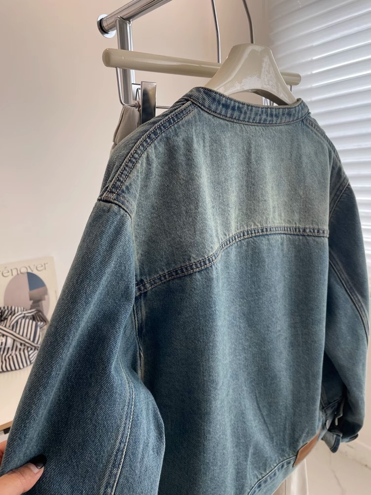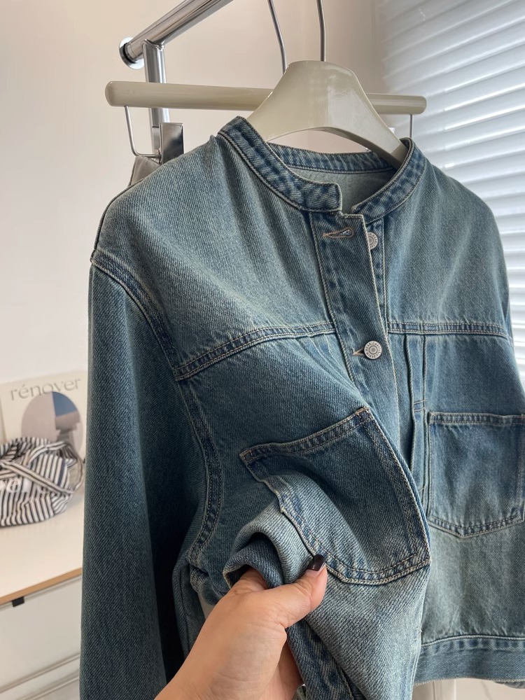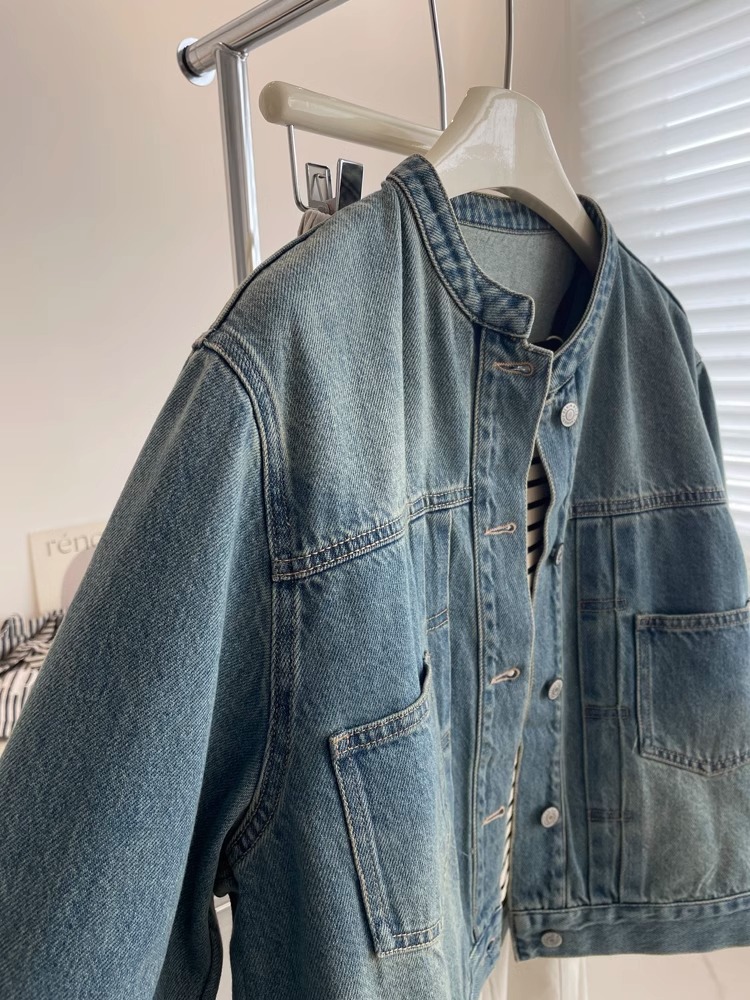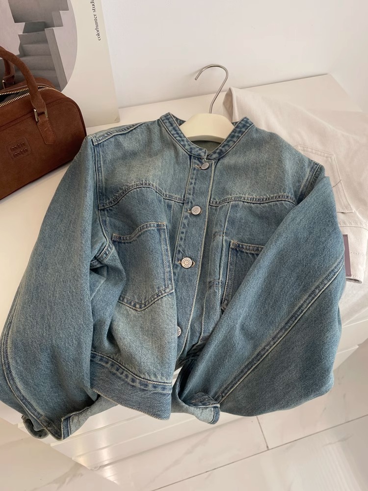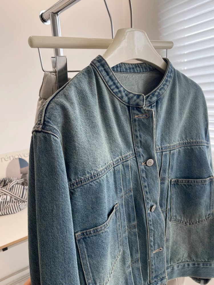 复古水先蓝立领牛仔短外套女!2025春款韩版显瘦小个子休闲夹克衫