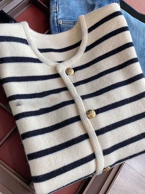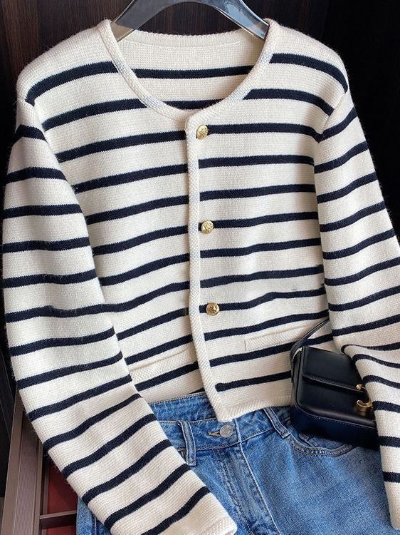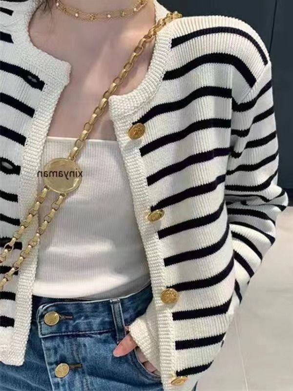 여자 봄과 가을 프랑스 느슨한 짧은 외부 스웨터 재킷 골드 버클 컬러 스트라이프 크루 넥과 샤넬 스타일 니트 카디건스토어 가기