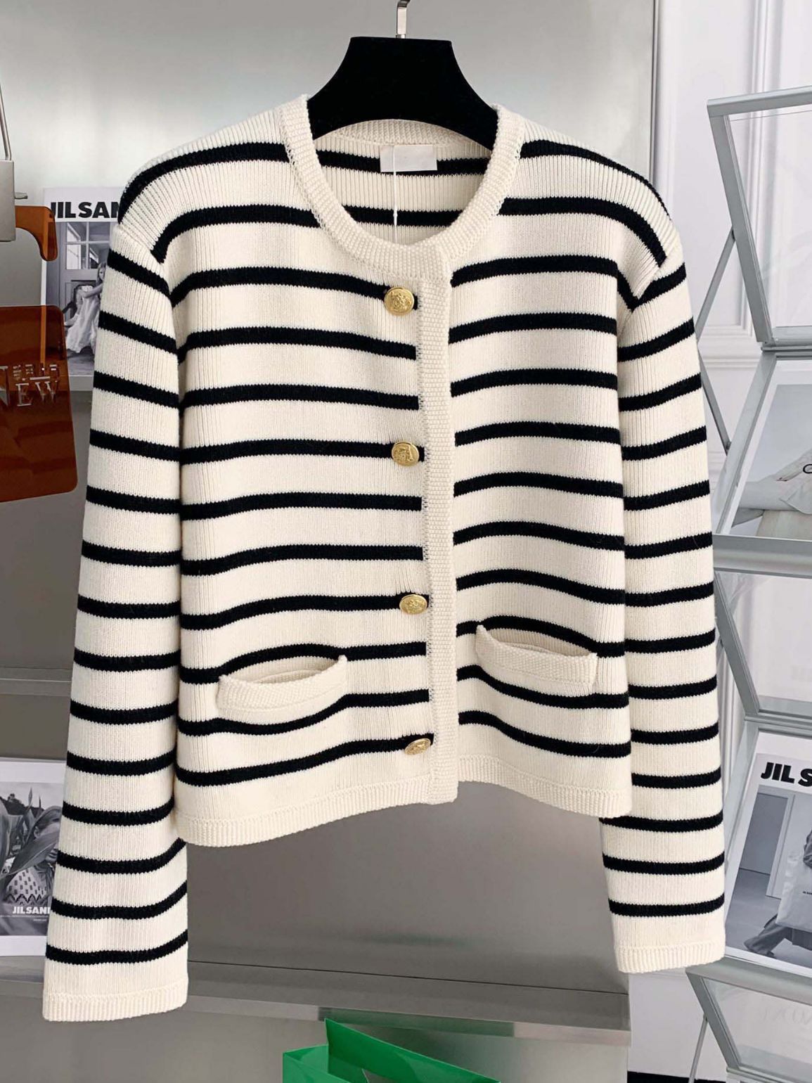 여자 봄과 가을 프랑스 느슨한 짧은 외부 스웨터 재킷 골드 버클 컬러 스트라이프 크루 넥과 샤넬 스타일 니트 카디건