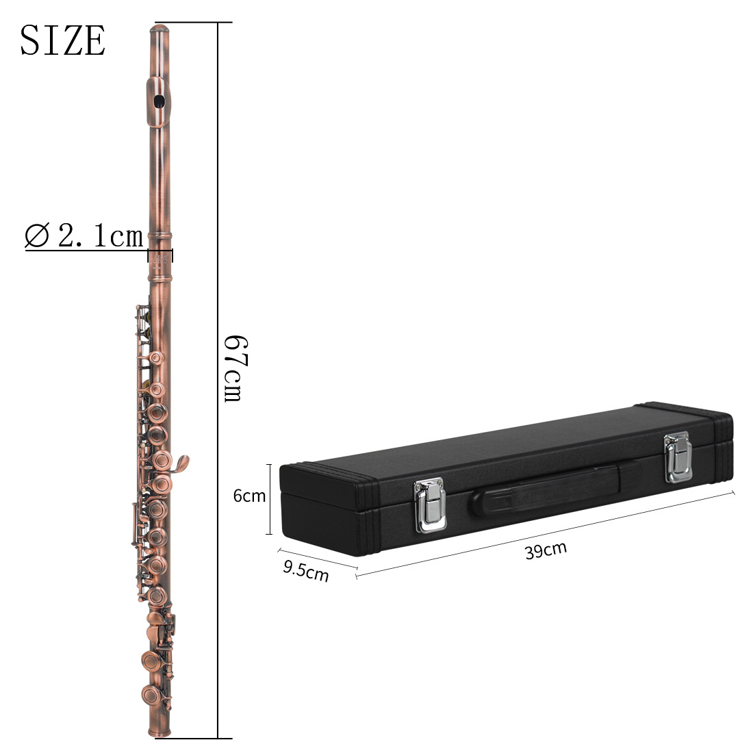 用途卖点:调别:C,外观红仿古铜,拉丝处理;按键:曲列式,16孔闭键,加E键标准型长笛,音色饱满/音色纯正,无铅焊接、不易生锈、共振性好,E键分割是多了一个MI的替代指法,使初学者上音更简单,有百利而无一弊的,无铅焊接技术,无铅焊接做成无铅环保产品,不担心对人体造成伤害,环保材质 无污染,头部管:头部管是长笛重要部件,形状像一根直管,实际上有一个细微的锥形突起,对长笛的音质反应和声调起重要作用,主管:长笛的主体,壁身是平行而不像头部管那样有锥形凸起,C型尾笛:长笛有C足部管或者B足部管