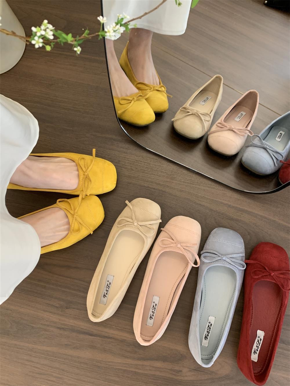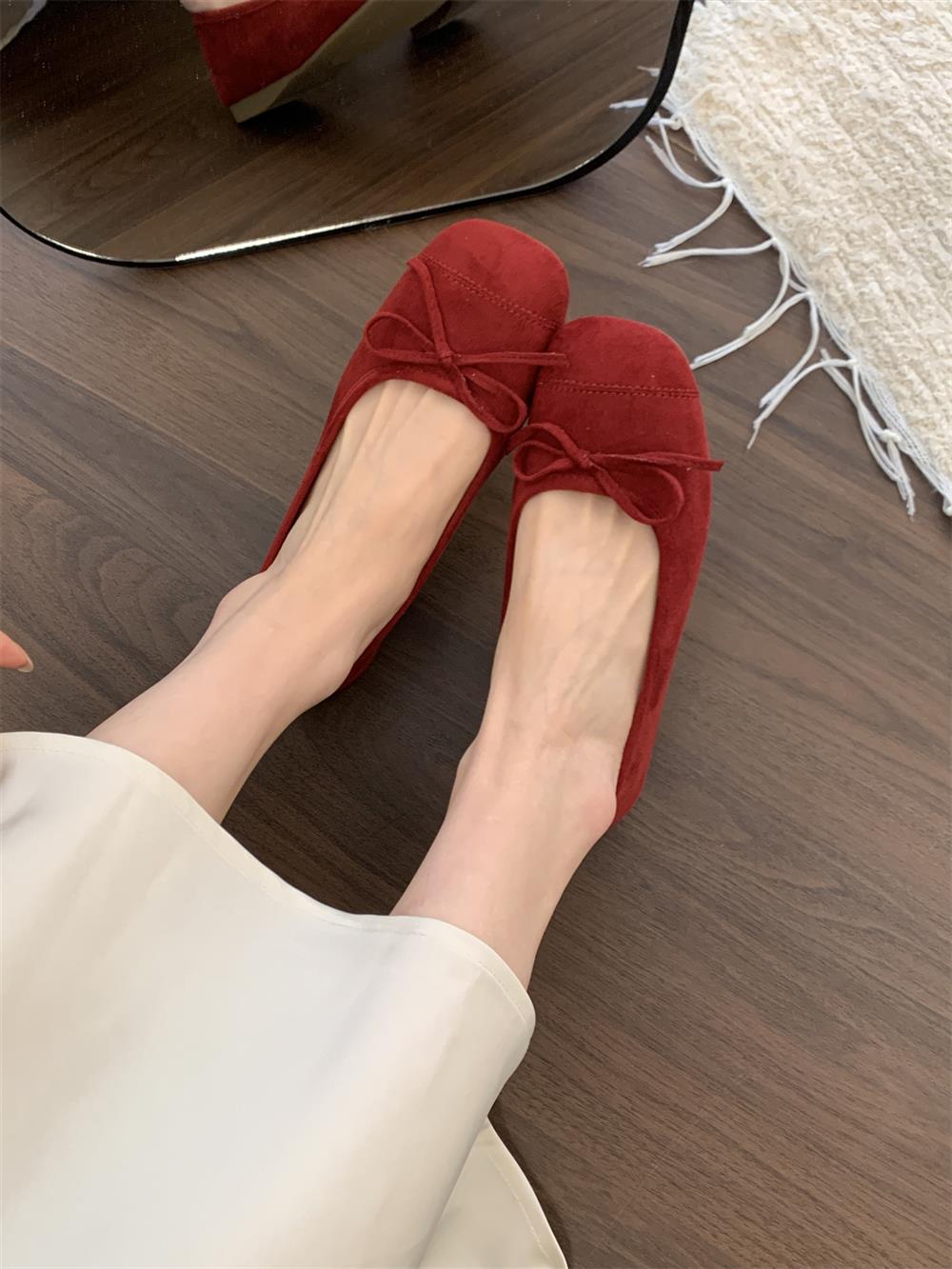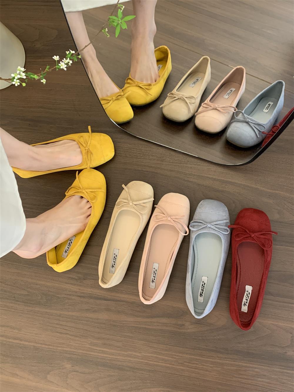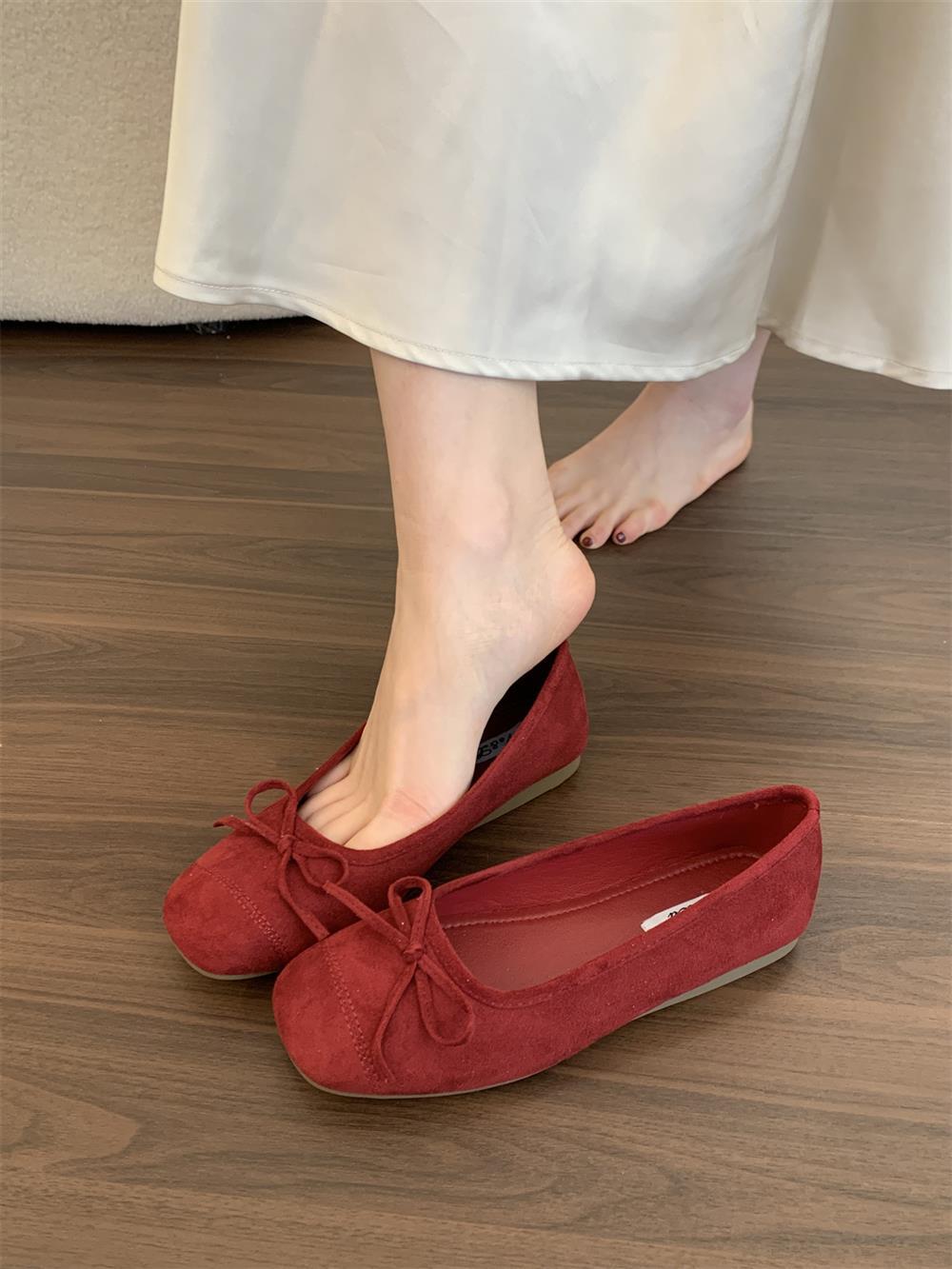 Ve & La Suede 레드 싱글 신발 여성의 봄 얕은 입 페달 레트로 젠틀 요정 발레 플랫 빈 신발스토어 가기